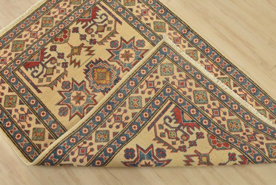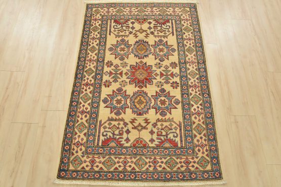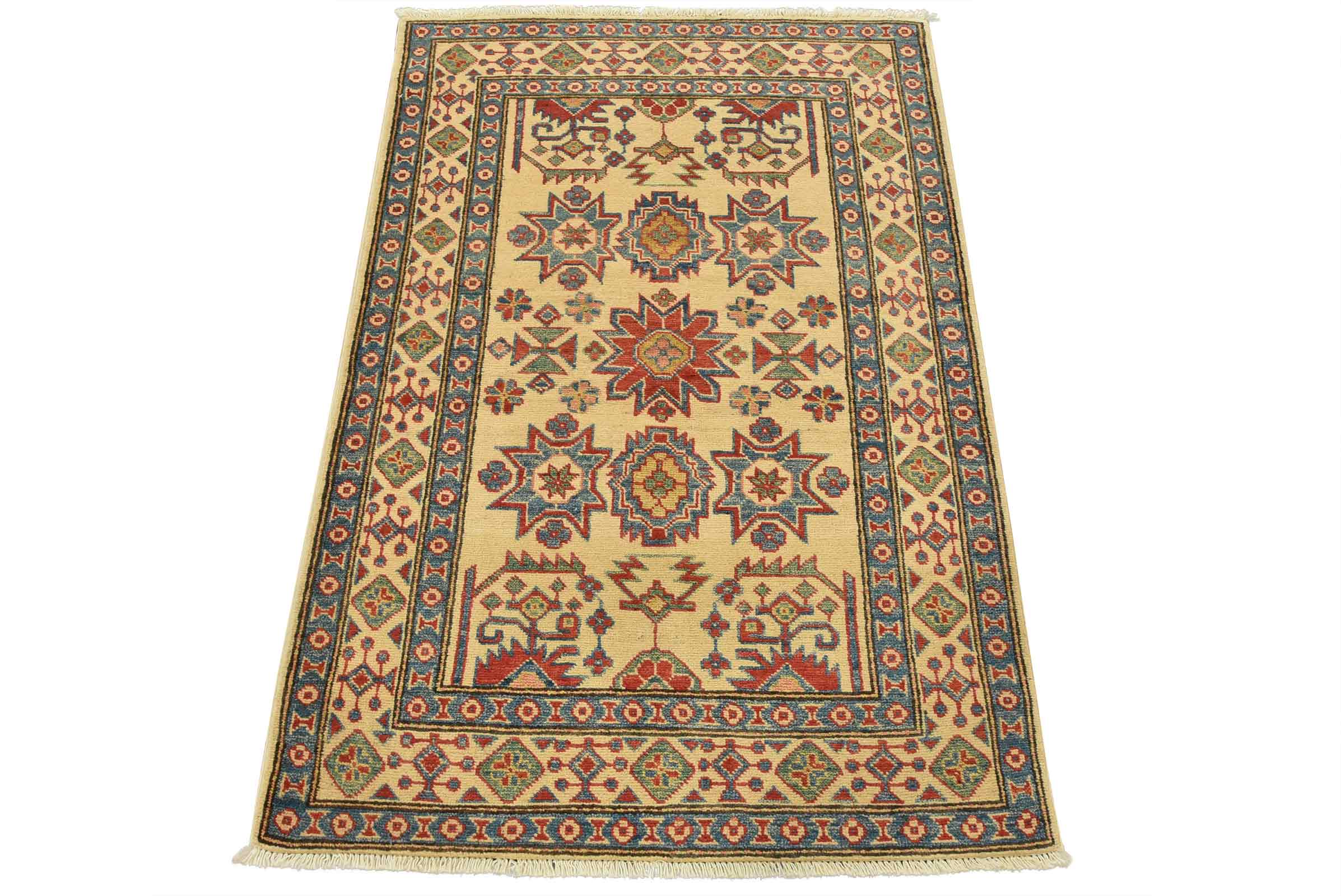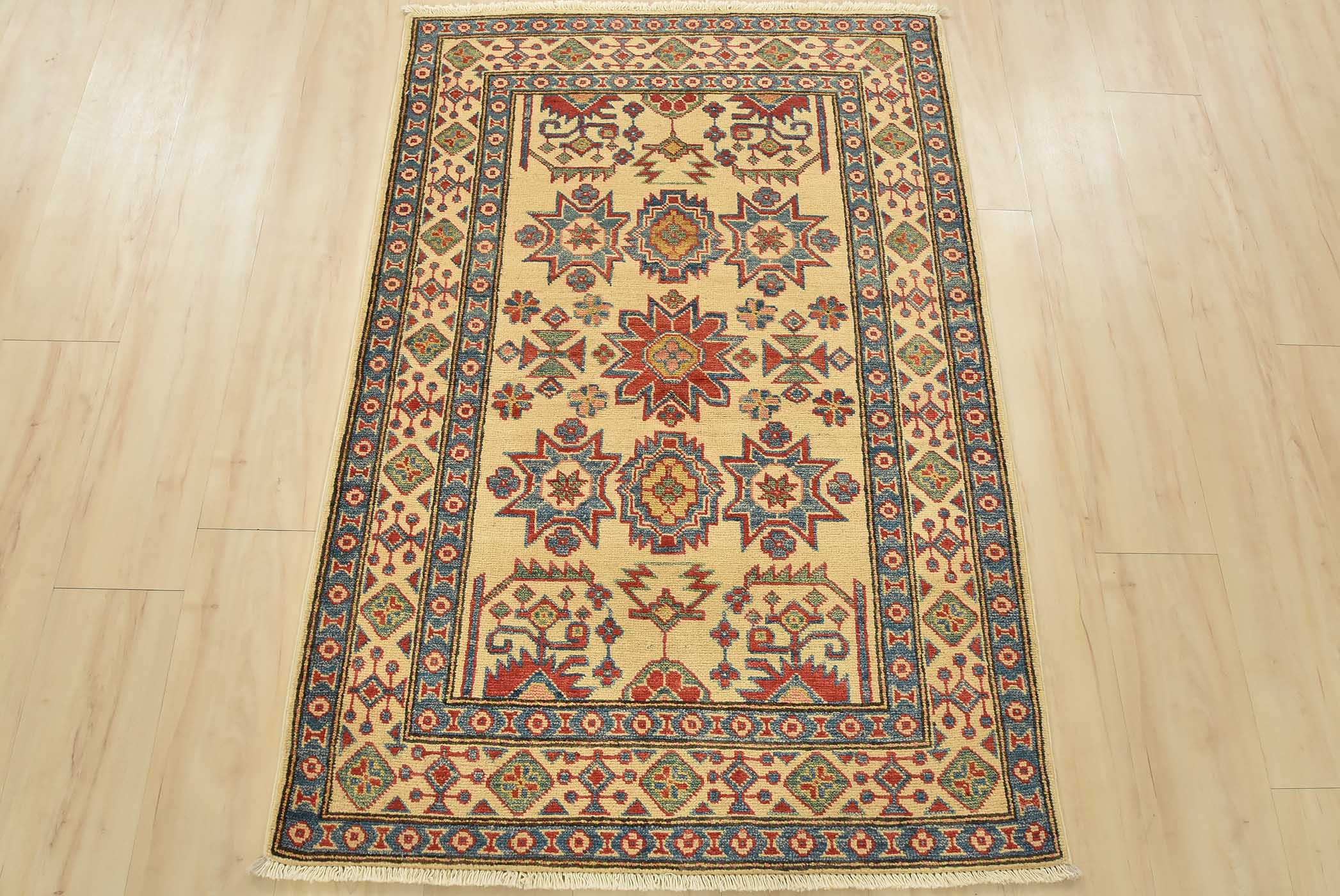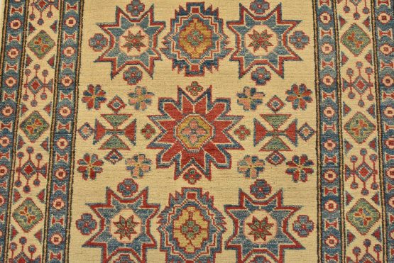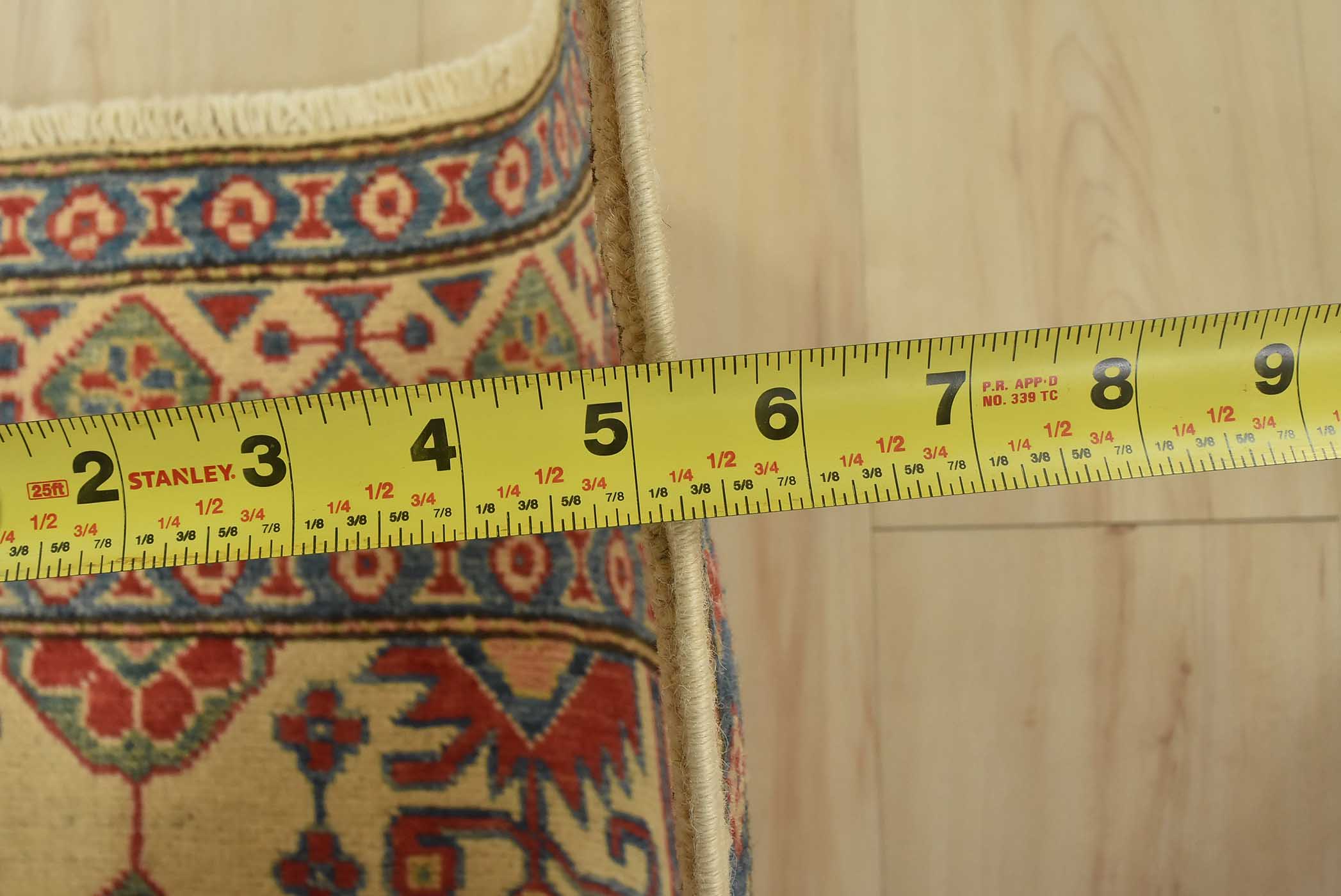 A tribal Kazak rug hand-knotted with fine wool on a cotton foundation. This oriental rug features geometric motifs set against a beige background. It is new and in excellent condition.