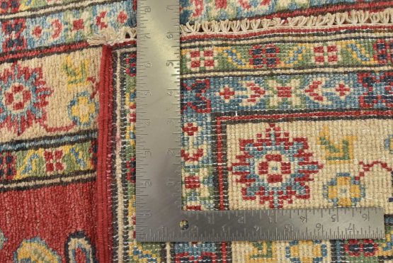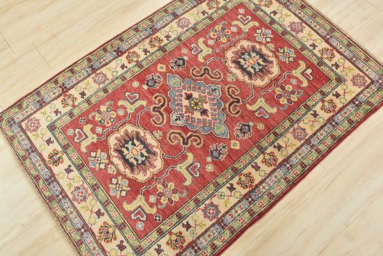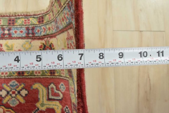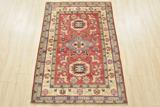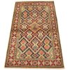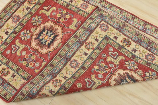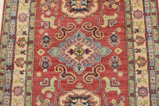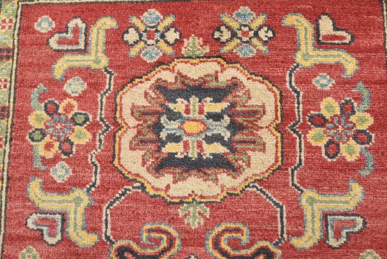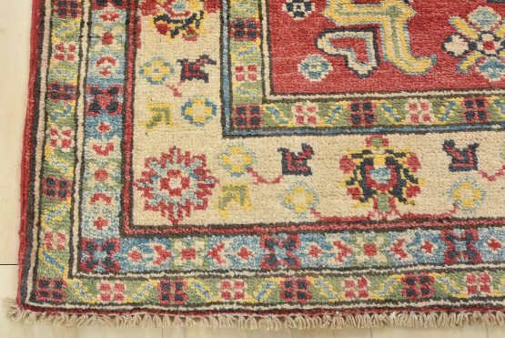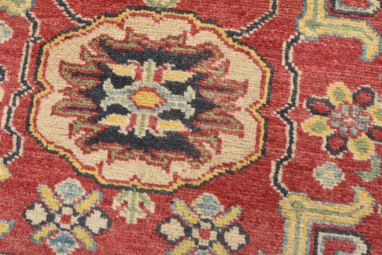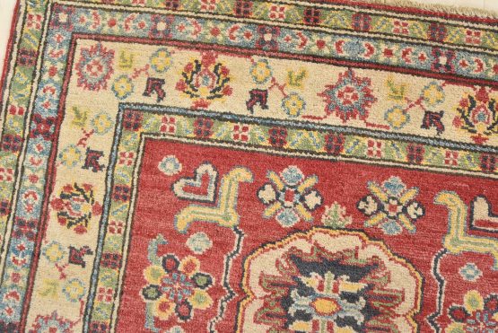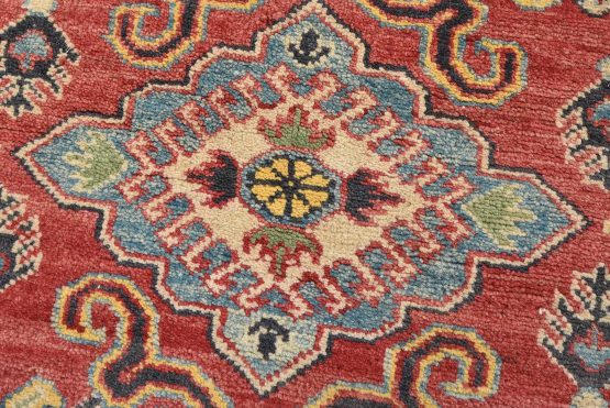 A tribal Caucasian Kazak rug hand-knotted with an all-wool pile on a cotton foundation. This oriental rug features a central geometric medallion surrounded by geometric motifs set against a red background. It is new and in excellent condition.