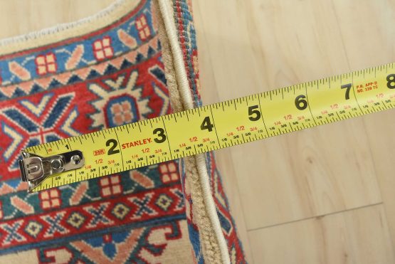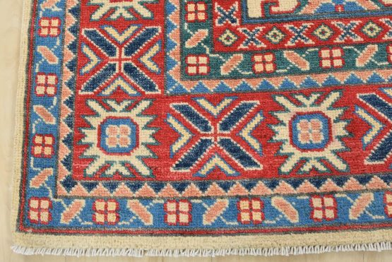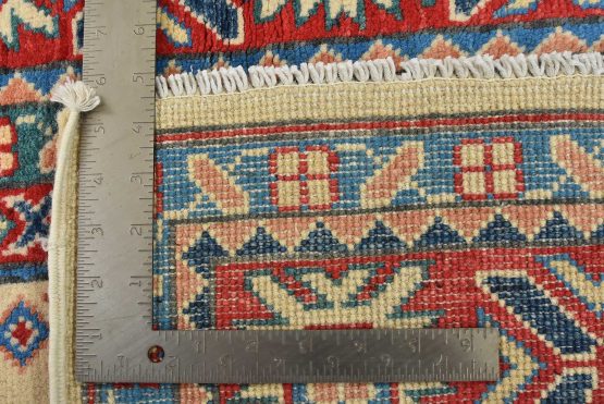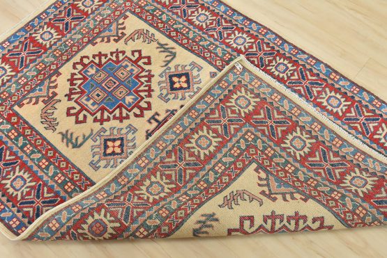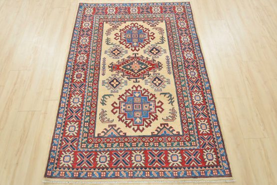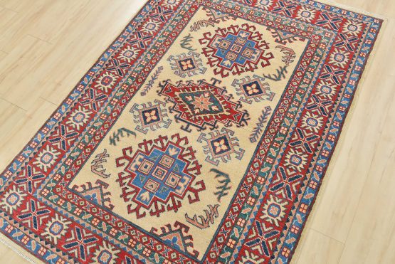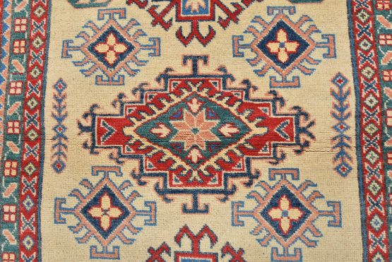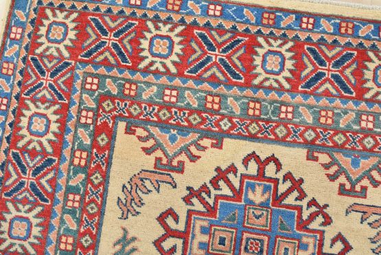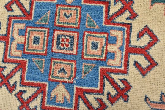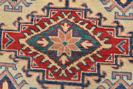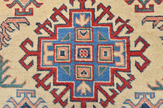 A tribal Caucasian Kazak rug hand-knotted with an all-wool pile on a cotton foundation. This oriental rug features geometric medallions surrounded by geometric motifs set against a beige background. It is new and in excellent condition.