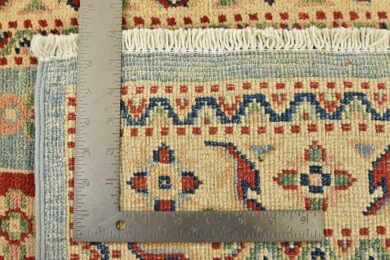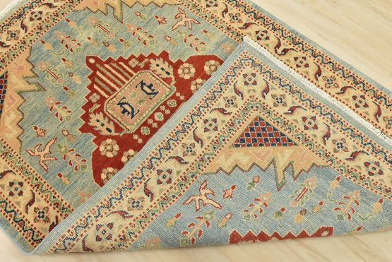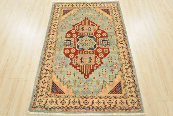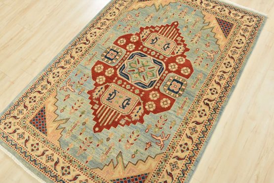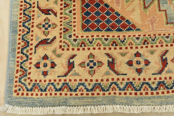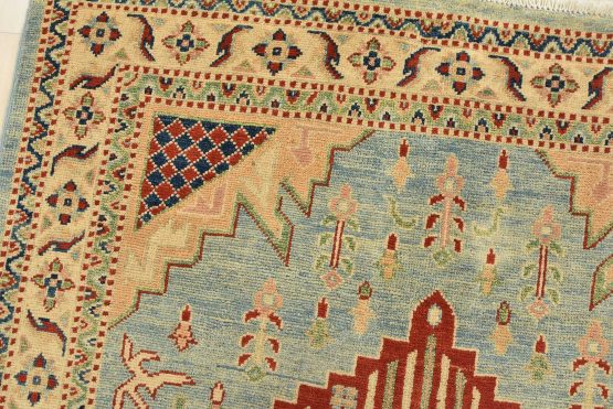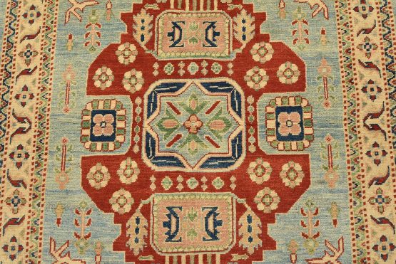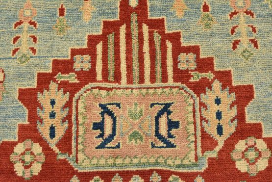 A traditional tribal Caucasian Kazak rug hand-knotted with an all-wool pile on a cotton foundation. This oriental rug features a large central medallion surrounded by geometric botanical motifs set against a light blue background. It is new and in excellent condition.