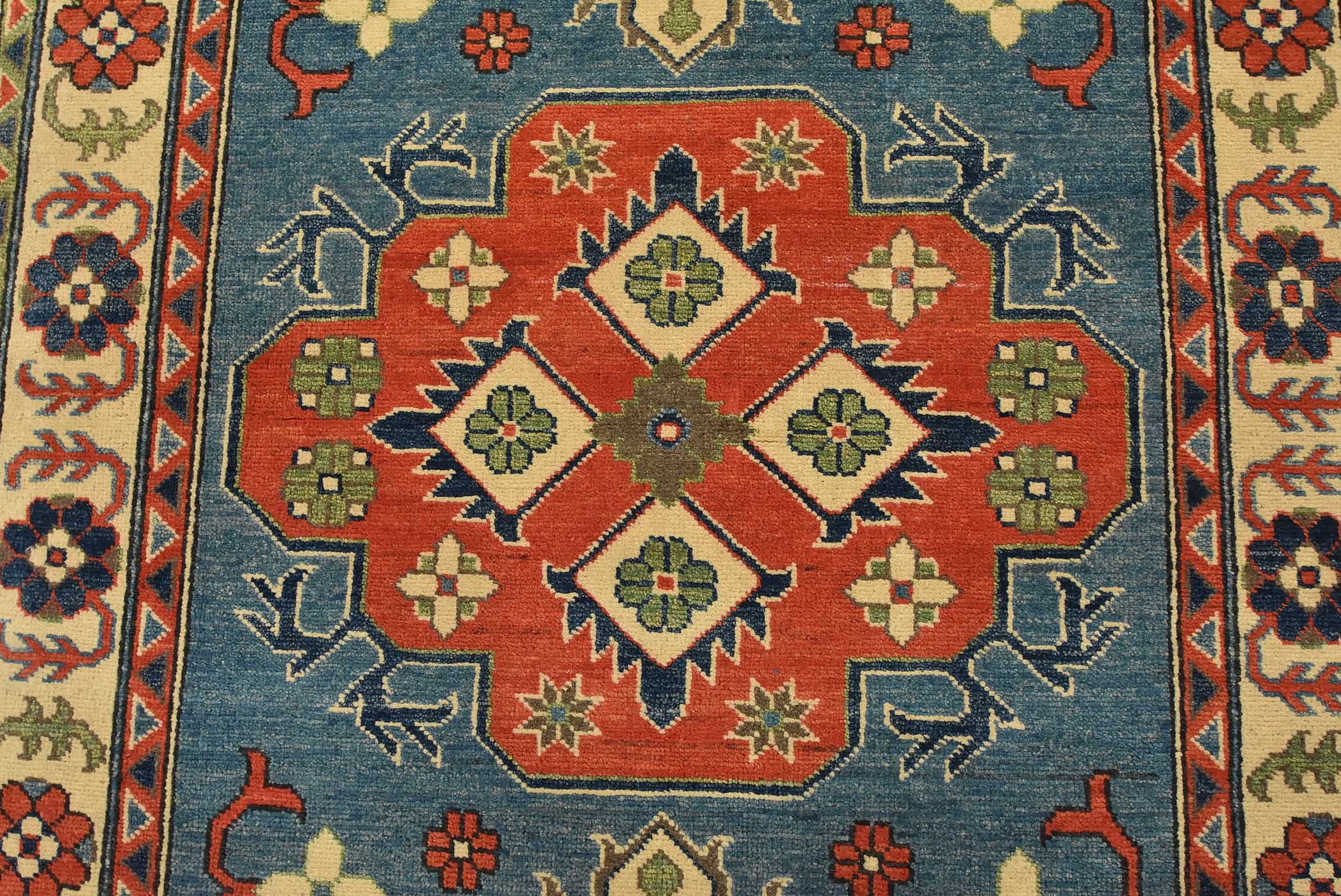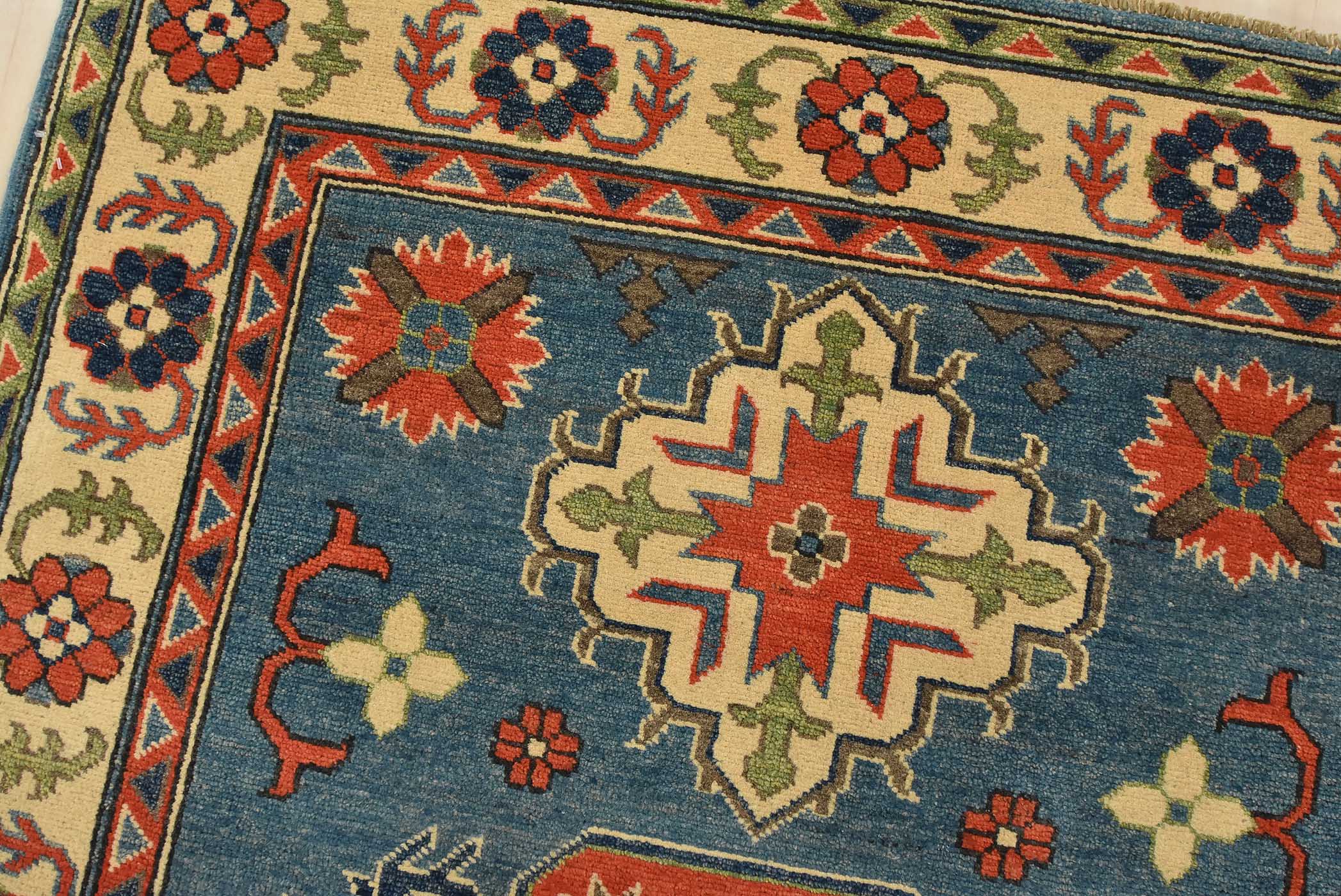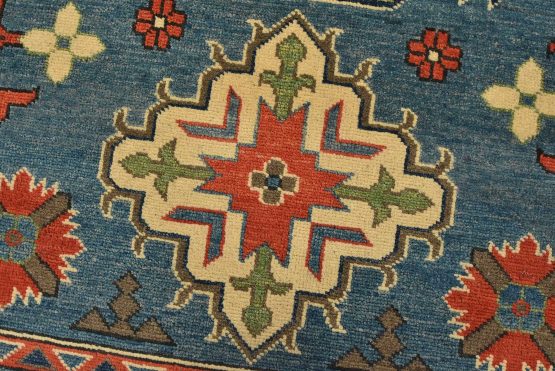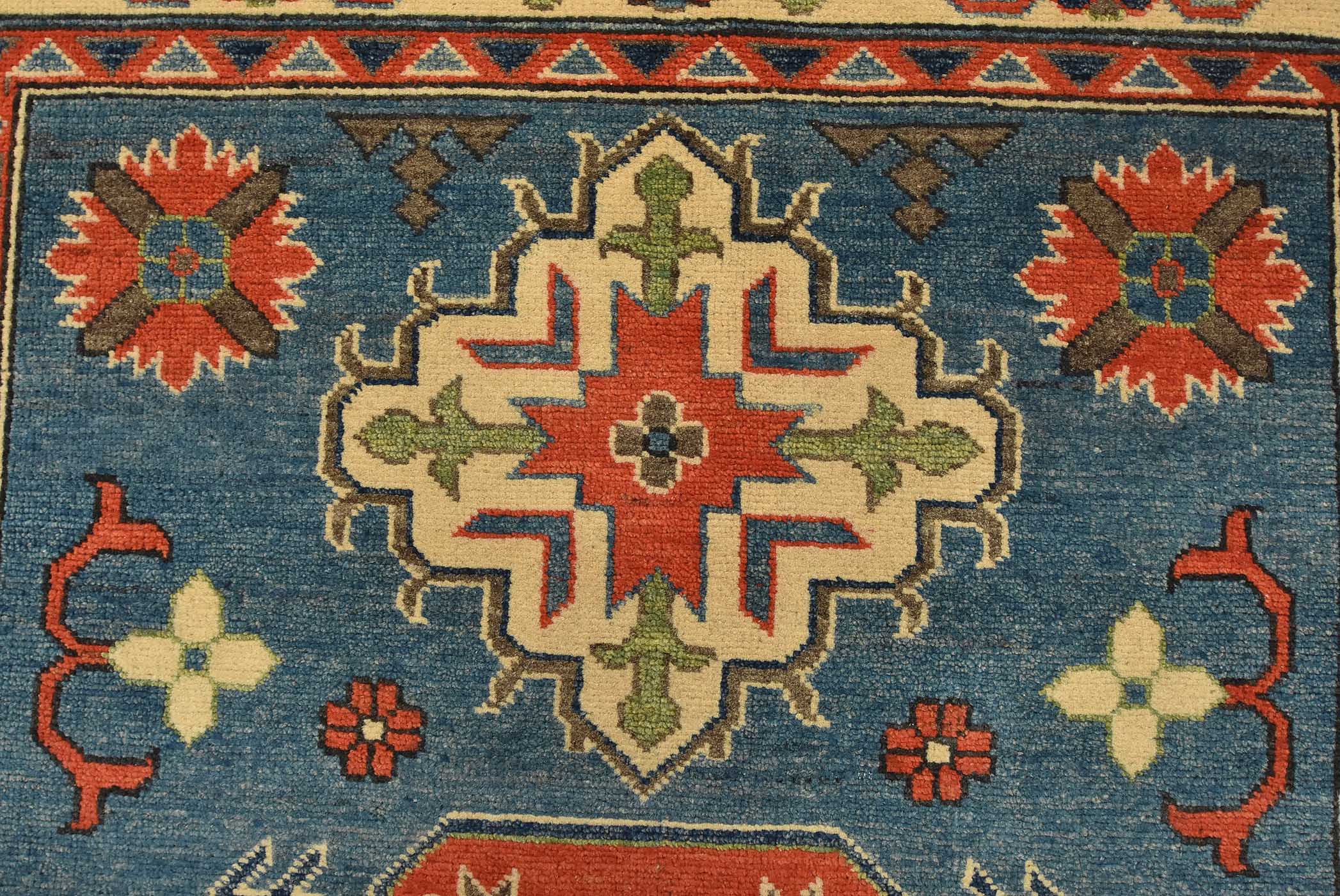 A tribal Caucasian Kazak rug hand-knotted with fine wool on a cotton foundation. This rug features a geometric medallion surrounded by small geometric motifs set against a blue background. It is new and in excellent condition.