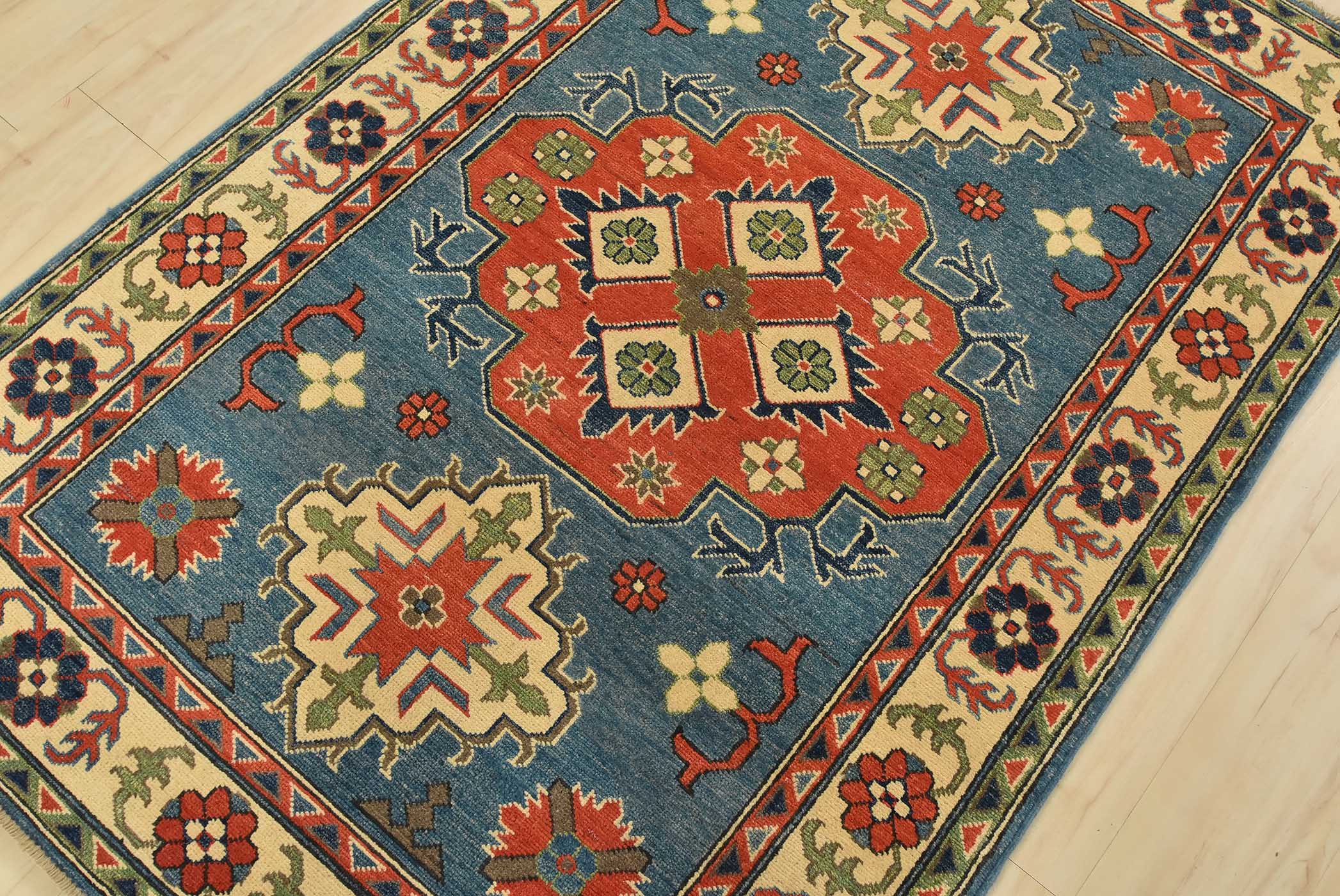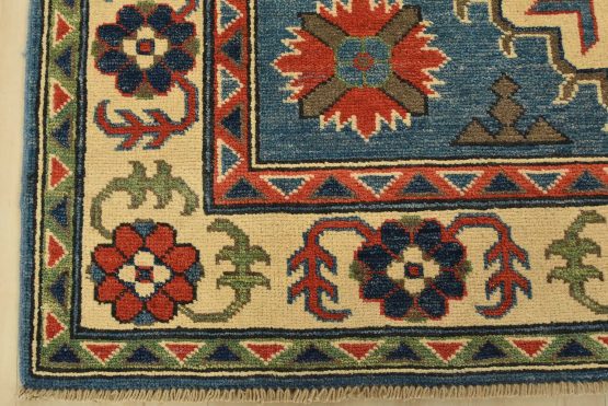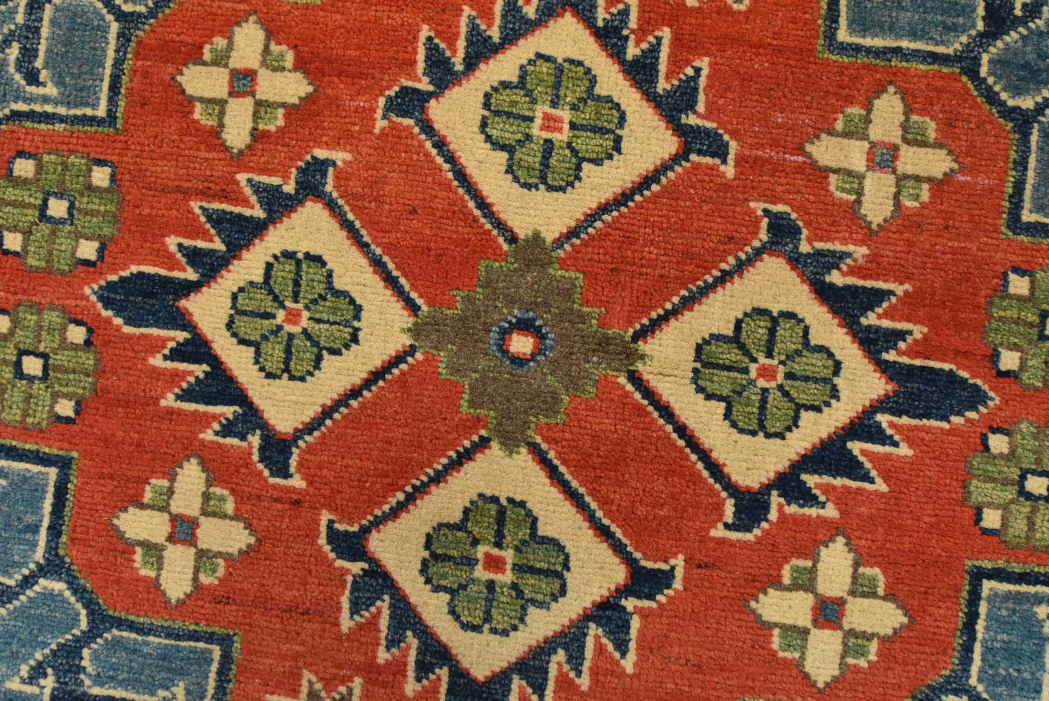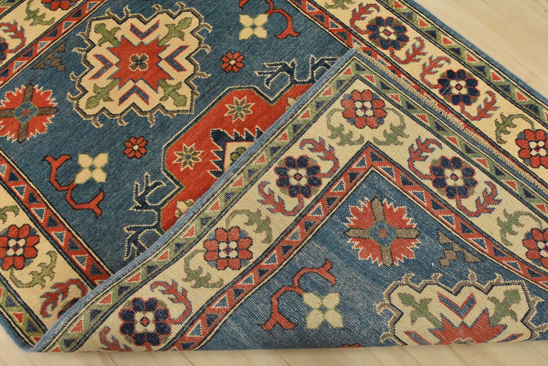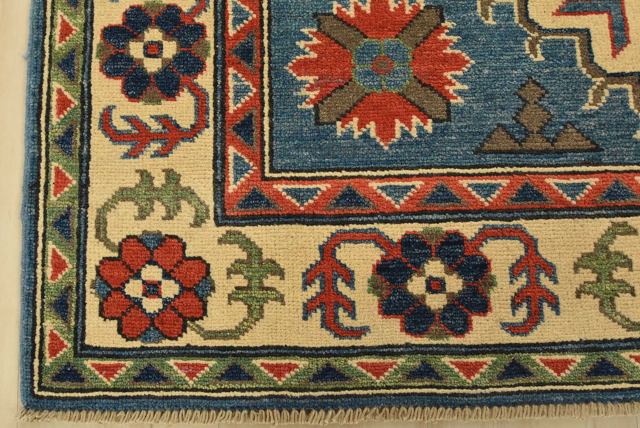 A tribal Caucasian Kazak rug hand-knotted with fine wool on a cotton foundation. This rug features a geometric medallion surrounded by small geometric motifs set against a blue background. It is new and in excellent condition.