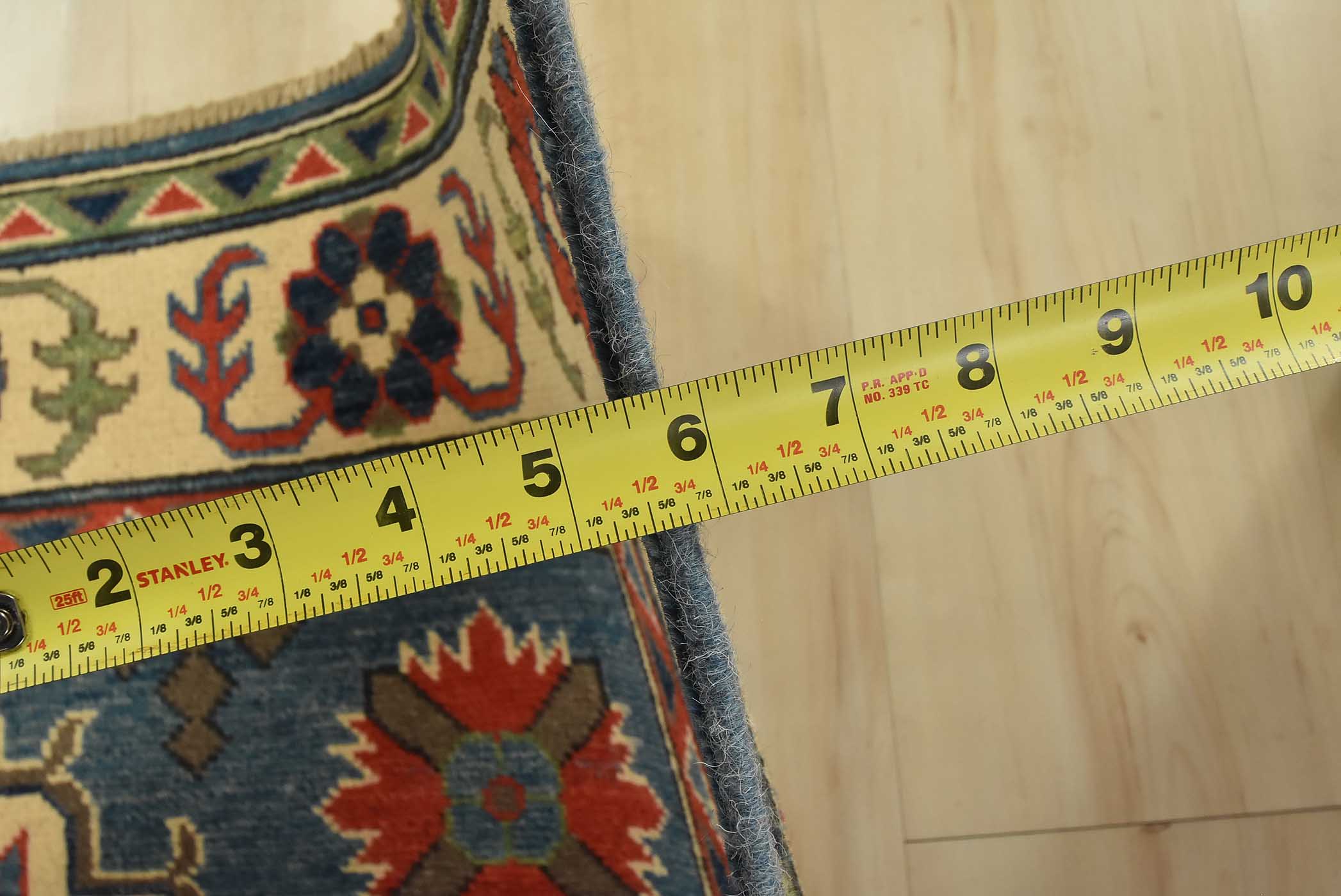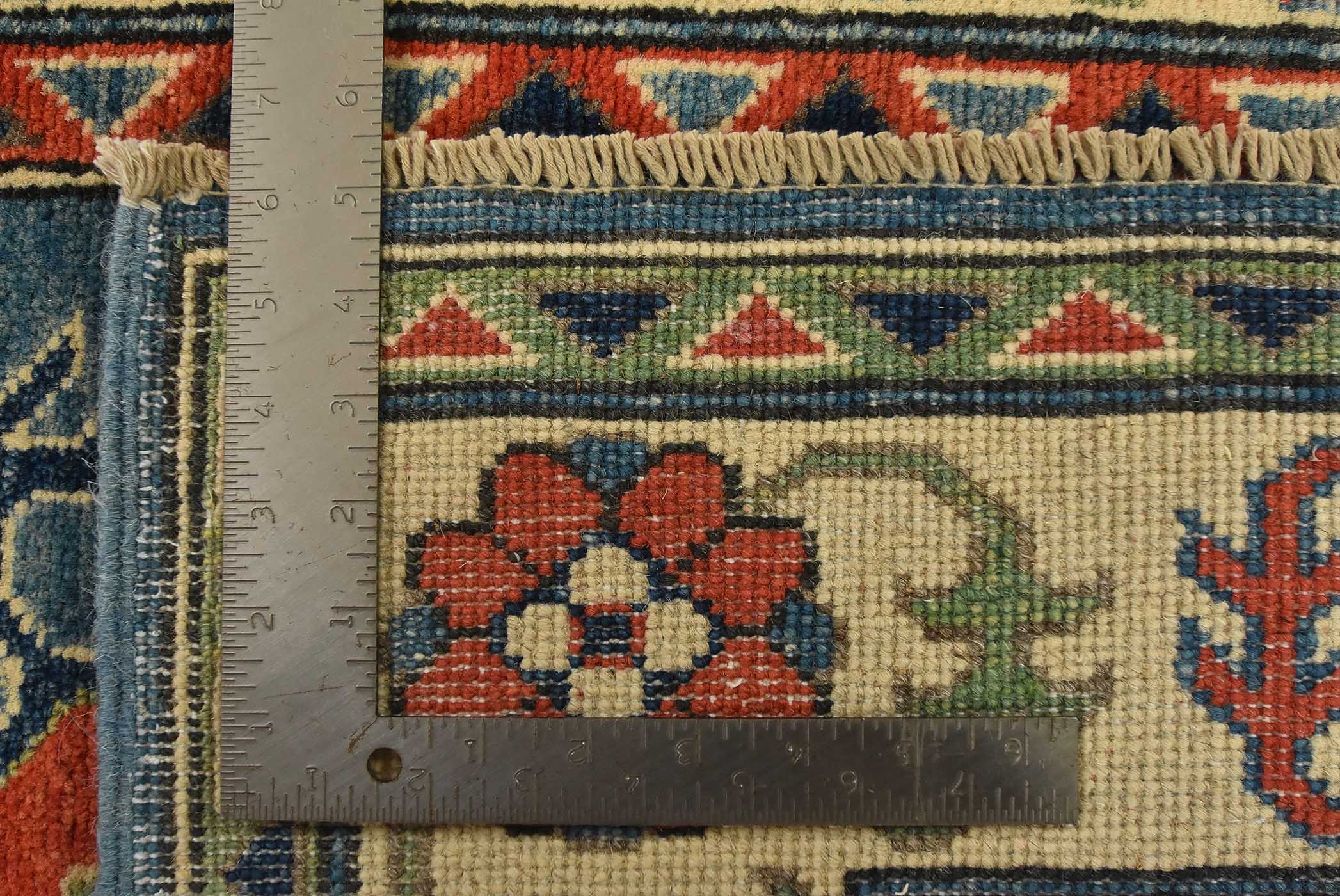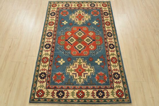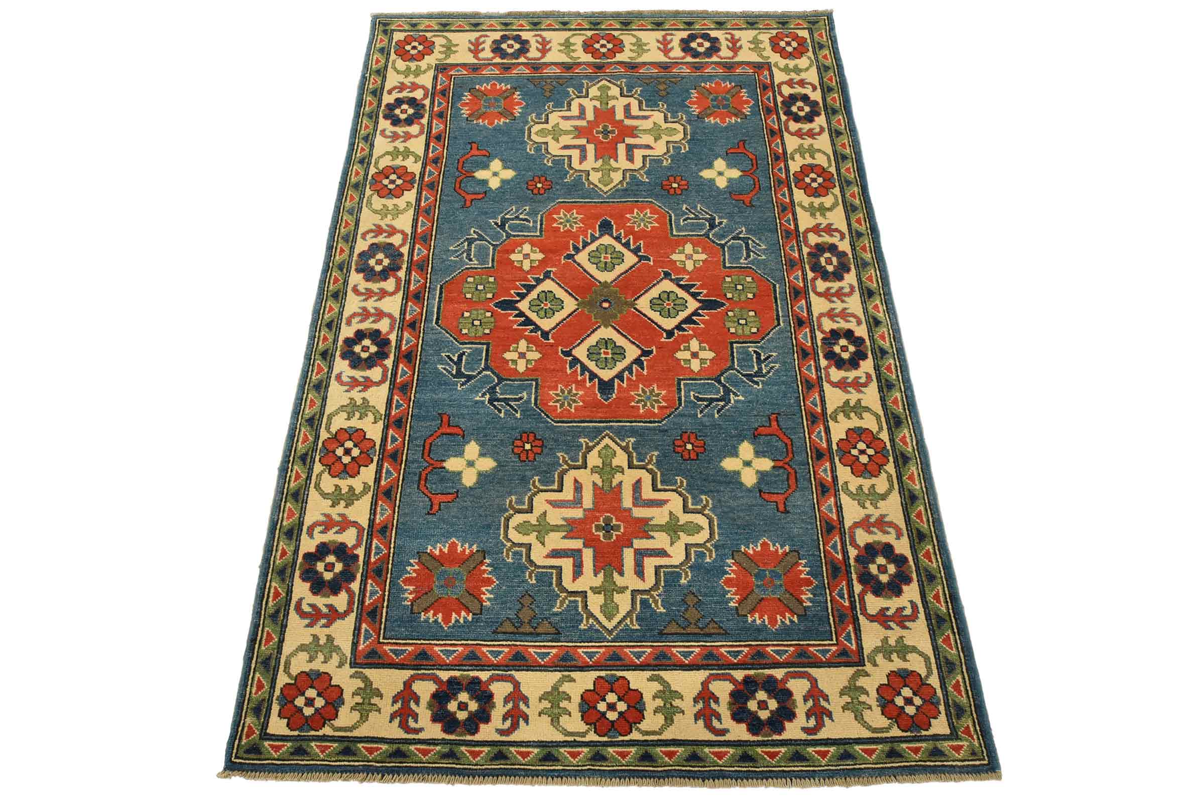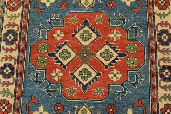 A tribal Caucasian Kazak rug hand-knotted with fine wool on a cotton foundation. This rug features a geometric medallion surrounded by small geometric motifs set against a blue background. It is new and in excellent condition.