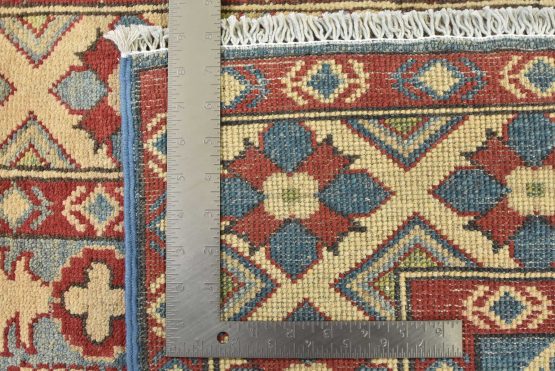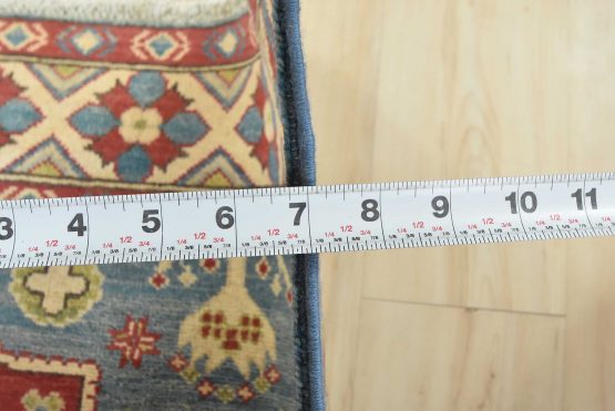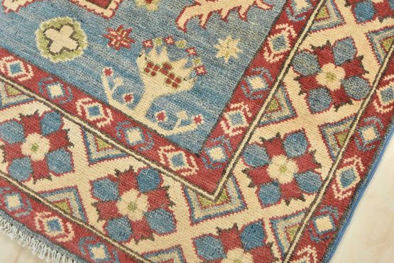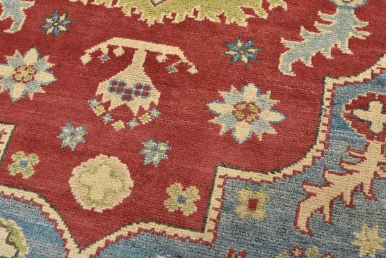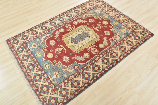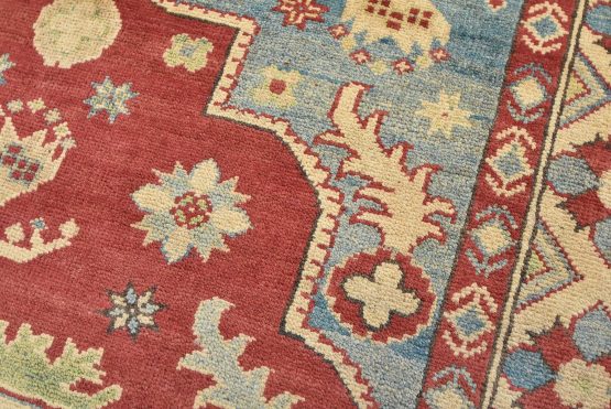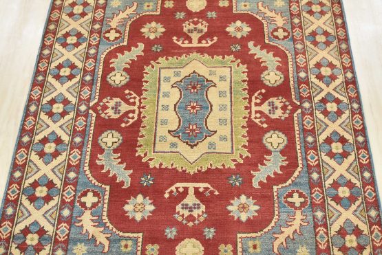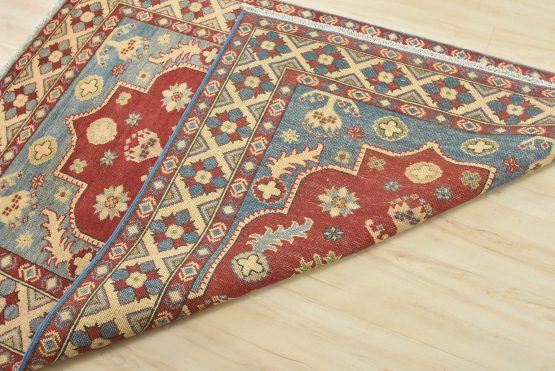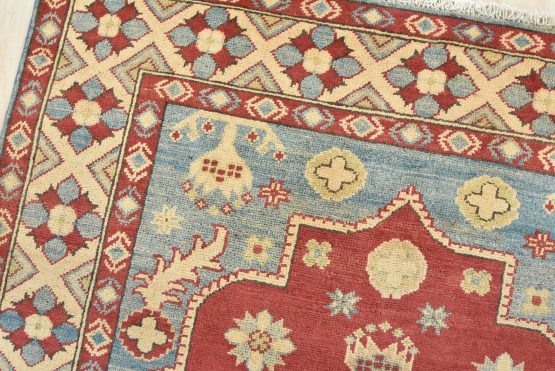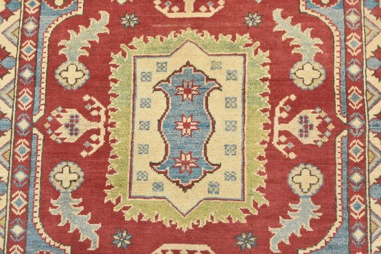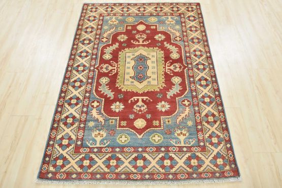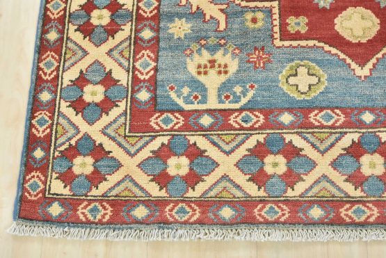 A traditional tribal Caucasian Kazak rug hand-knotted with an all-wool pile on a cotton foundation. This oriental rug features a central medallion surrounded by botanical motifs. It is new and in excellent condition.