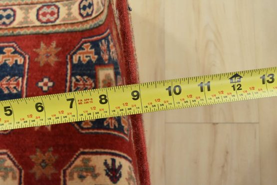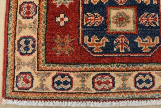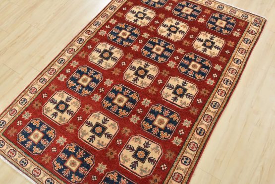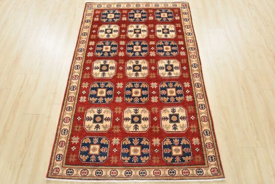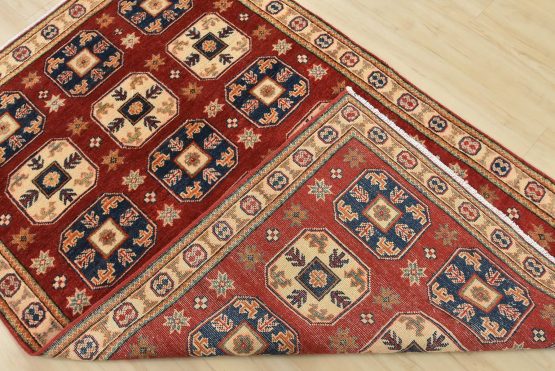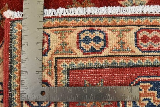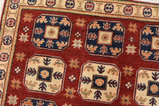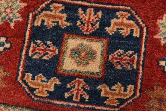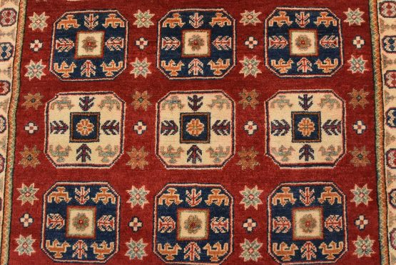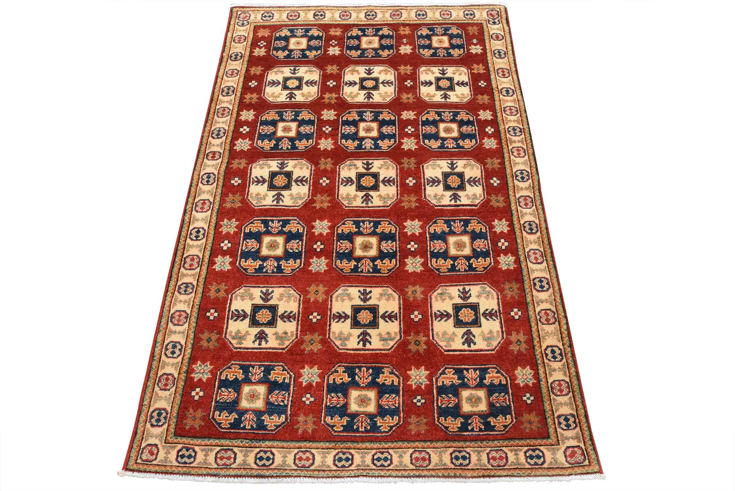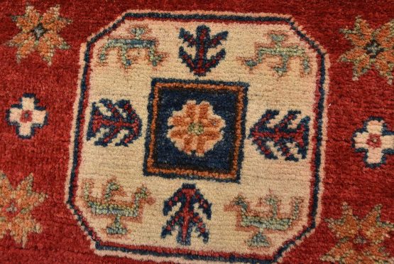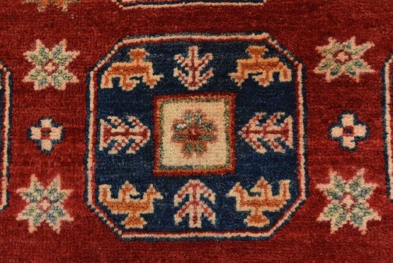 A tribal Caucasian Kazak rug hand-knotted with an all-wool pile on a cotton foundation. This oriental rug features rows of geometric medallions set against a red background. It is new and in excellent condition.