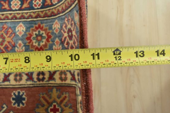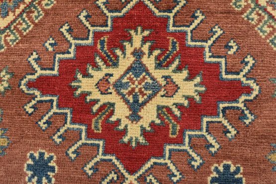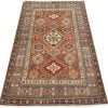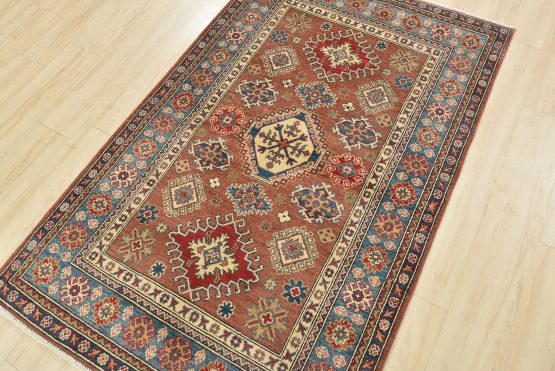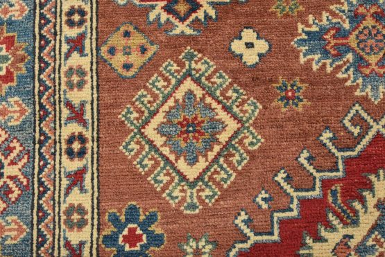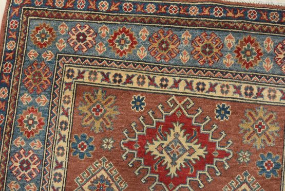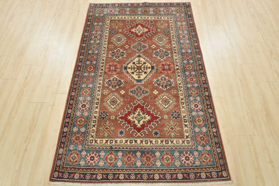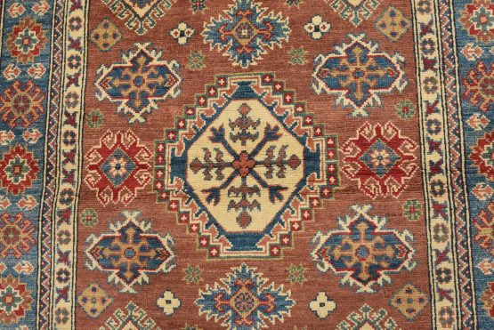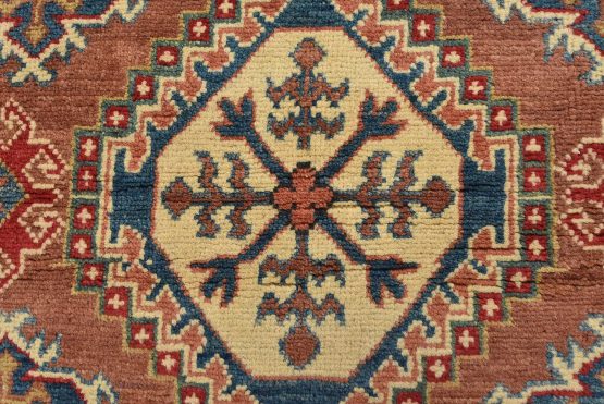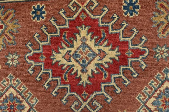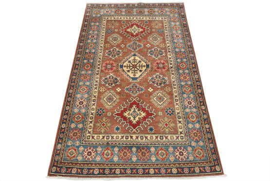 A tribal Caucasian Kazak rug hand-knotted with an all-wool pile on a cotton foundation. This oriental rug features geometric medallions surrounded by geometric motifs set against a brown background. It is new and in excellent condition.