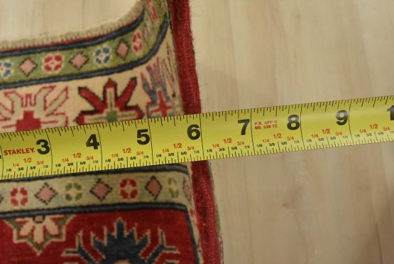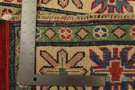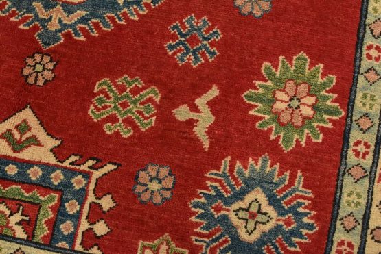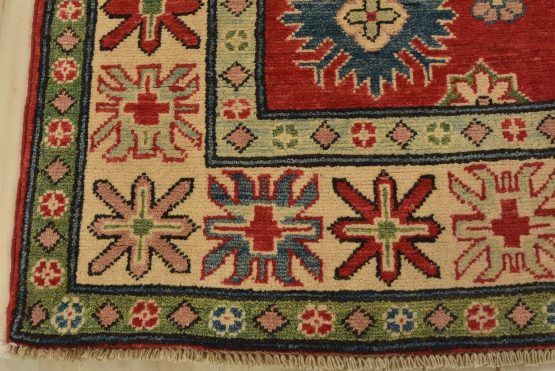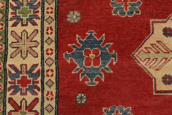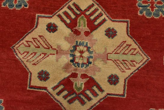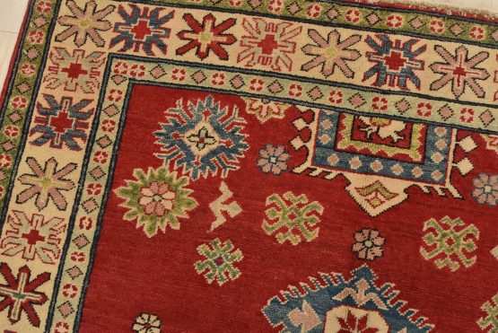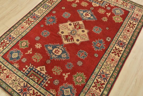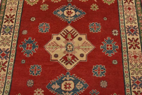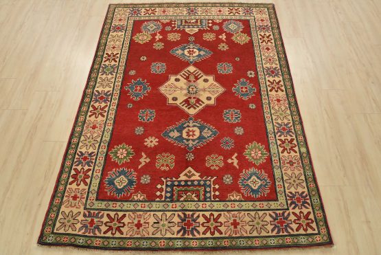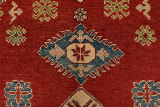 A tribal Caucasian Kazak rug hand-knotted with an all-wool pile on a cotton foundation. This oriental rug features a central geometric medallion surrounded by geometric motifs set against a red background. It is new and in excellent condition.