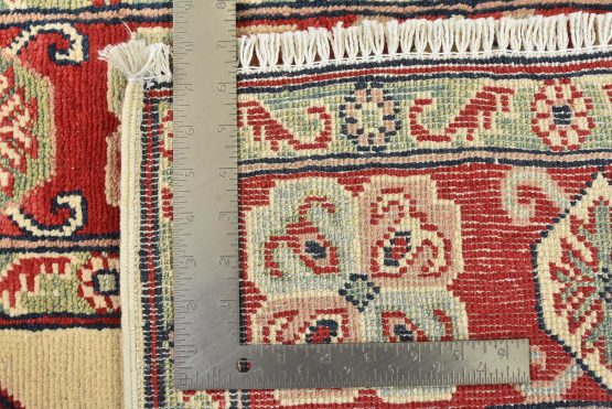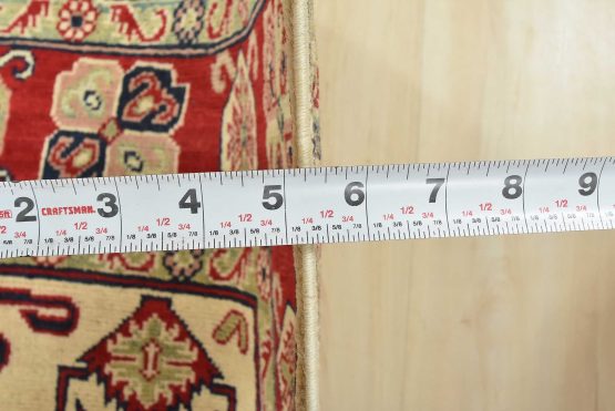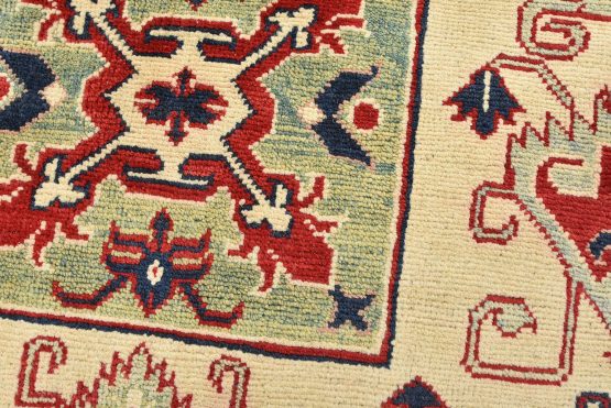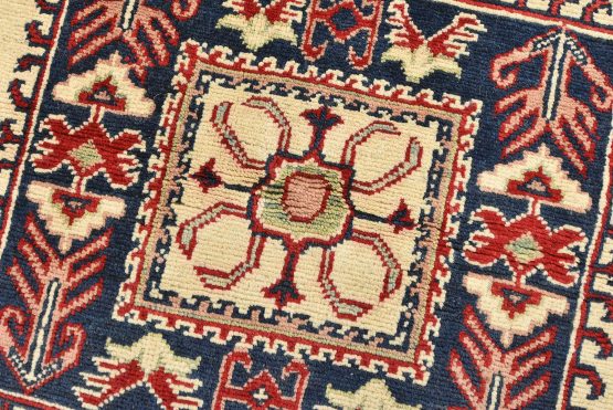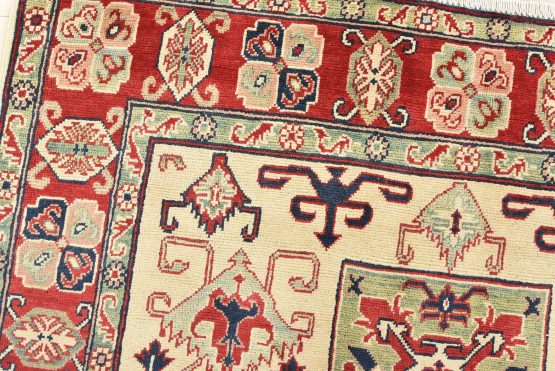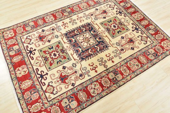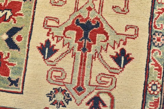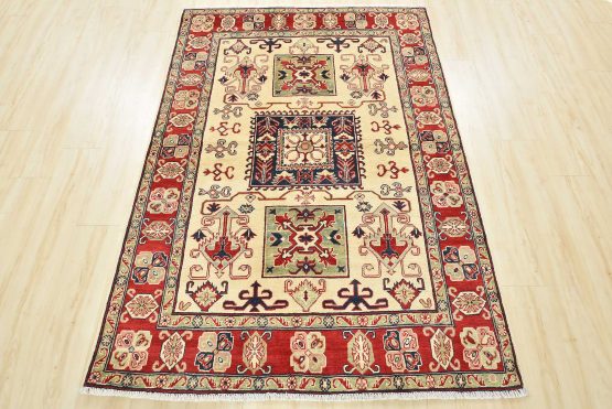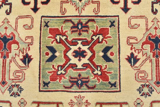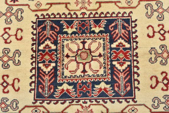 A traditional tribal Caucasian Kazak rug hand-knotted with an all-wool pile on a cotton foundation. This oriental rug features a square-shaped medallion surrounded by geometric motifs set against a beige background. It is new and in excellent condition.