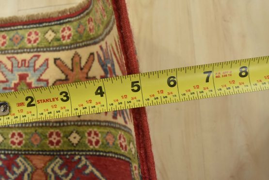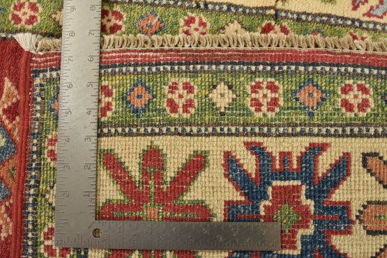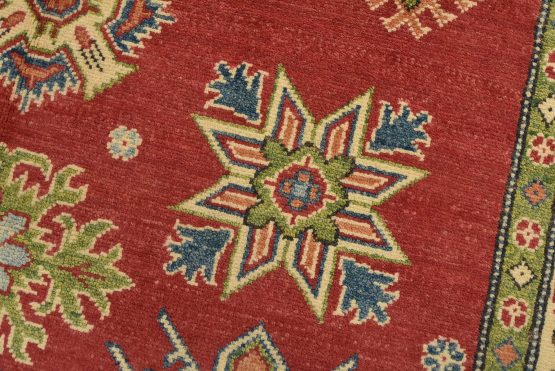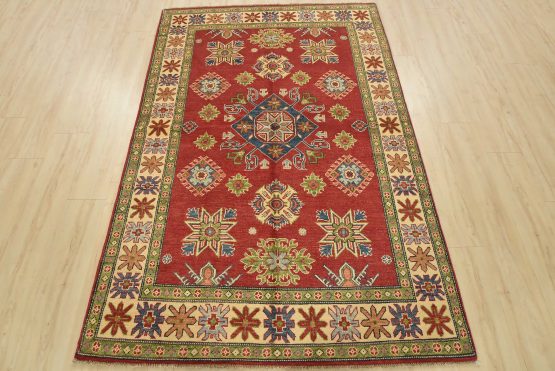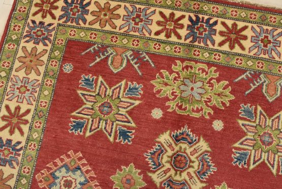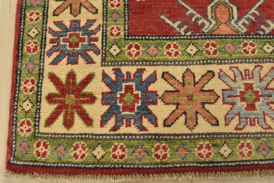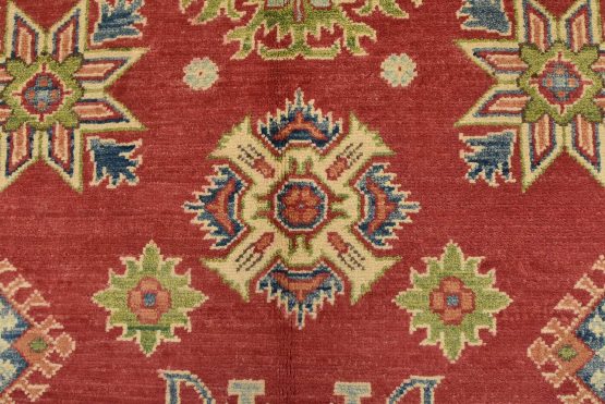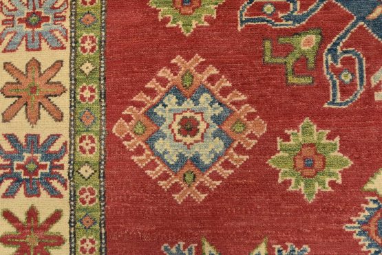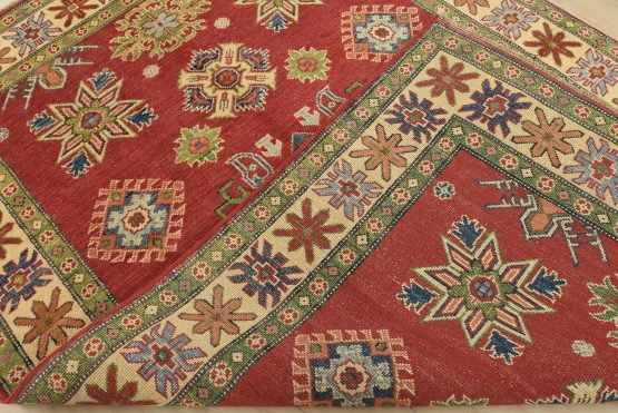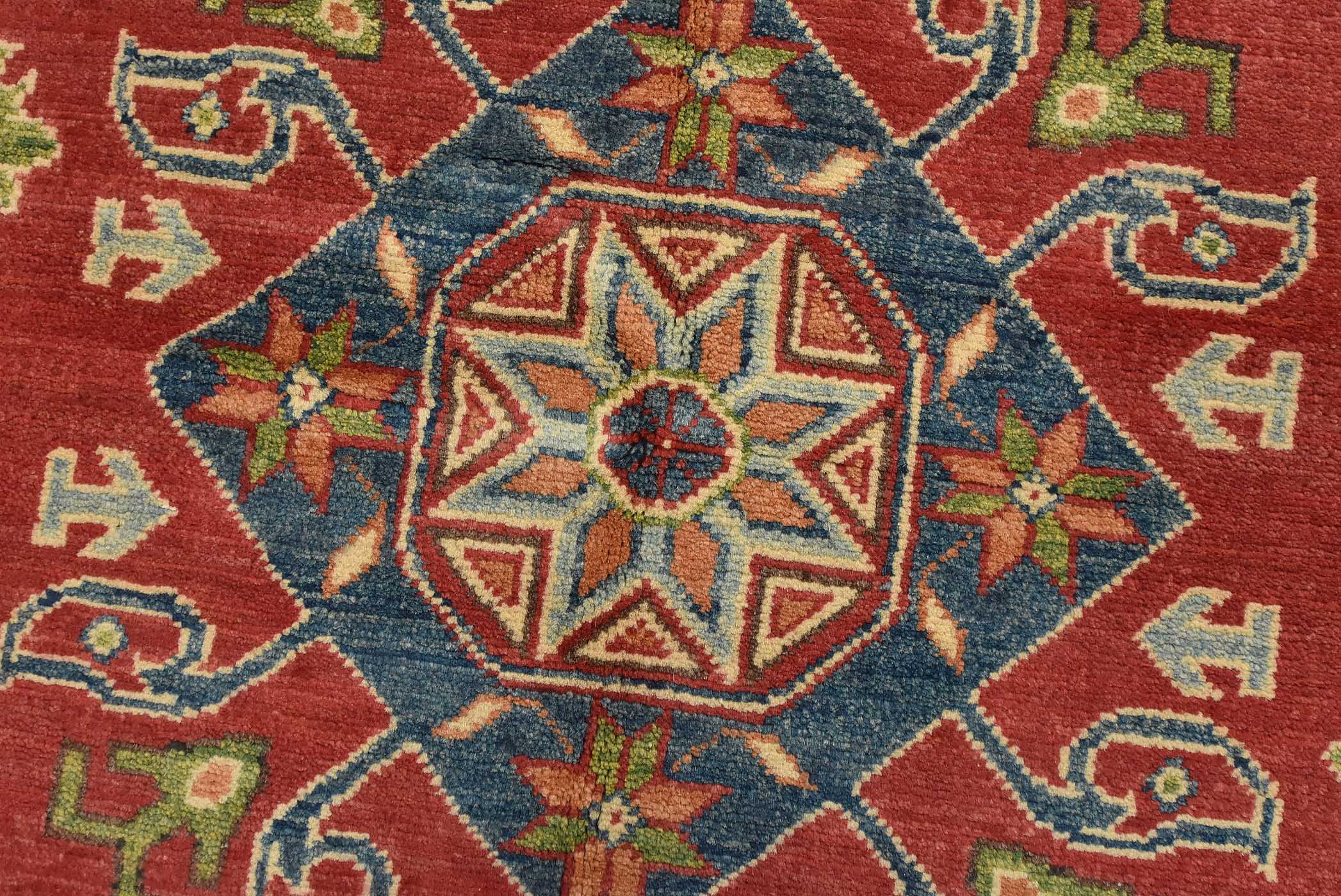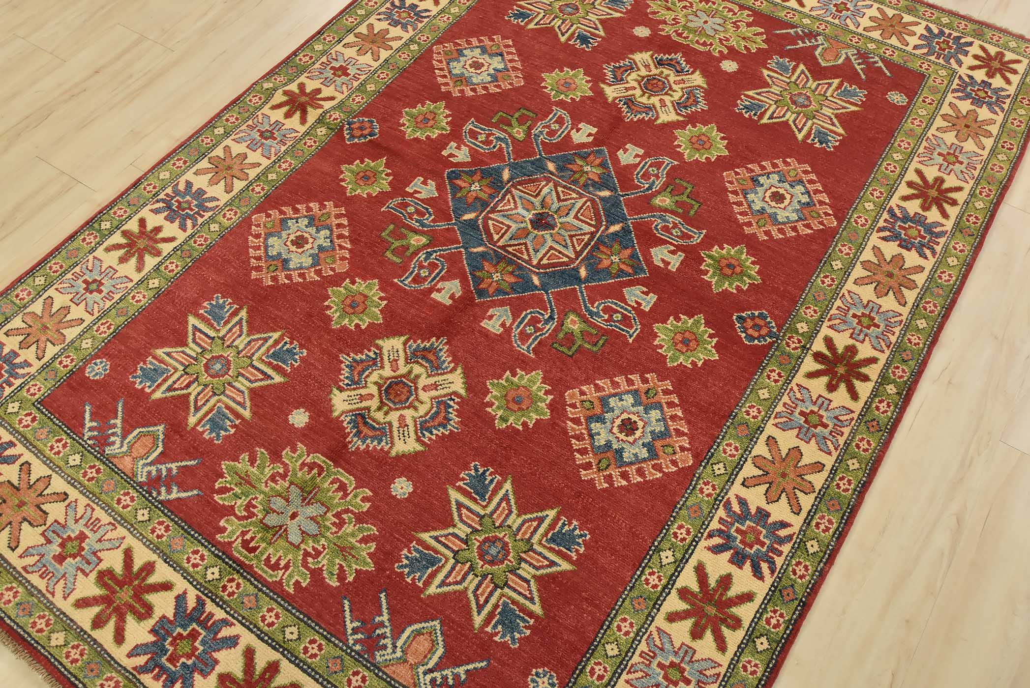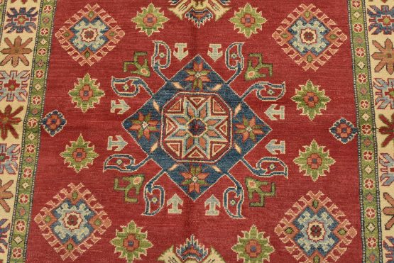 A tribal Caucasian Kazak rug hand-knotted with an all-wool pile on a cotton foundation. This oriental rug features a central geometric medallion surrounded by geometric motifs set against a red background. It is new and in excellent condition.