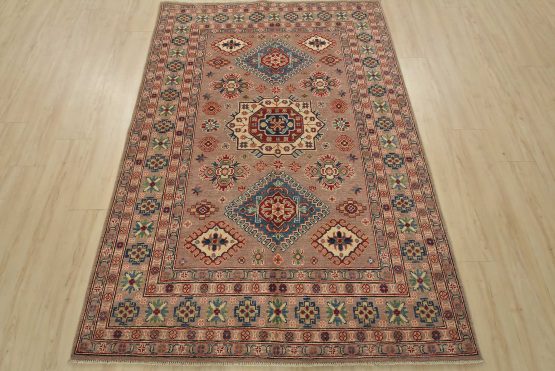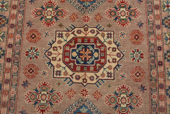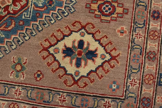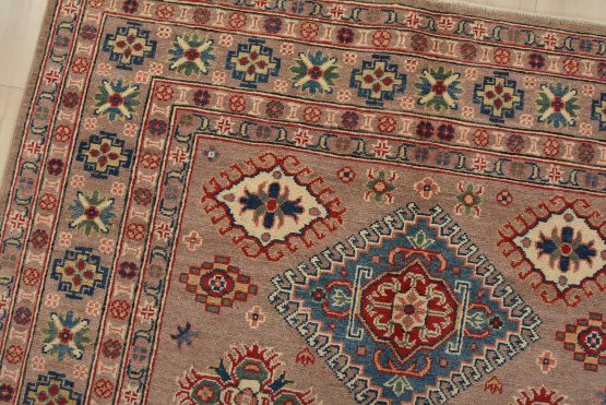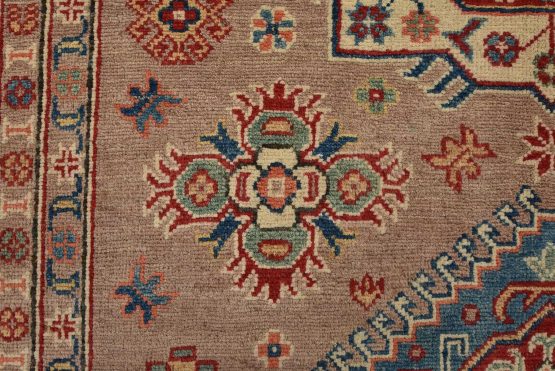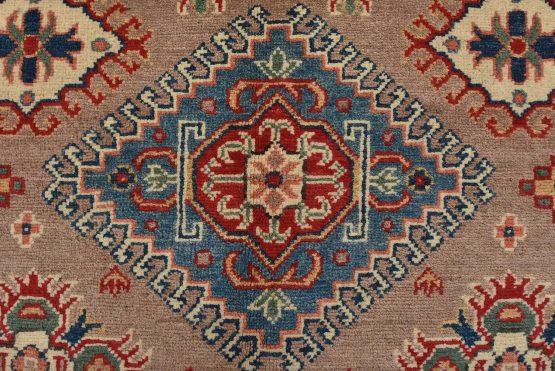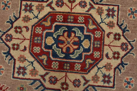 A tribal Caucasian Kazak rug hand-knotted with an all-wool pile on a cotton foundation. This oriental rug features geometric medallions surrounded by geometric motifs set against a brown background. It is new and in excellent condition.