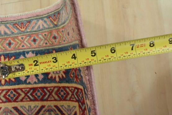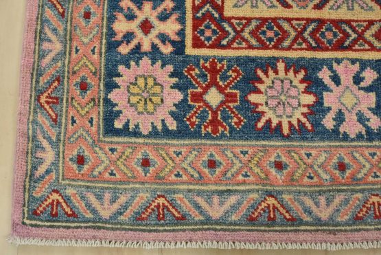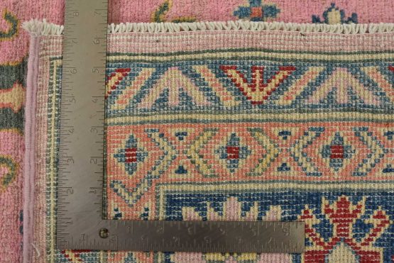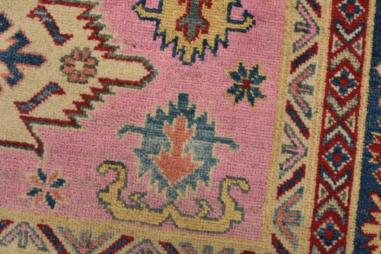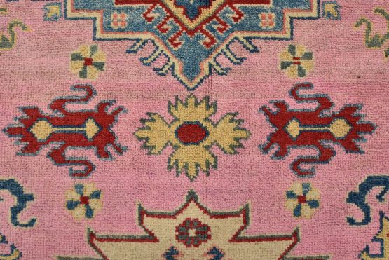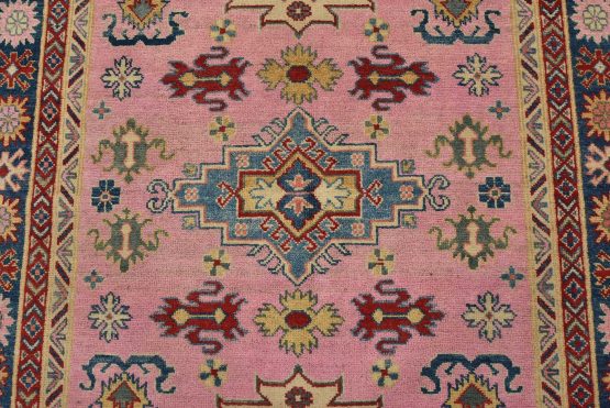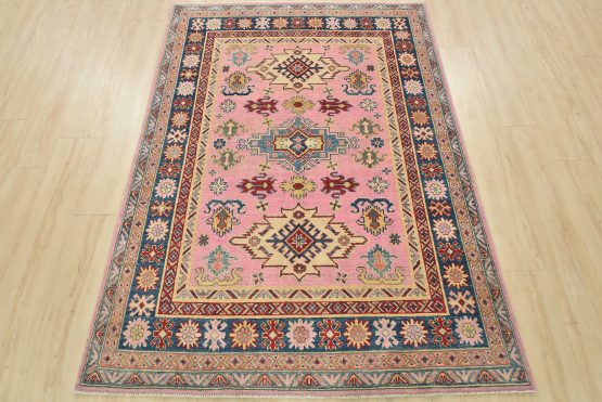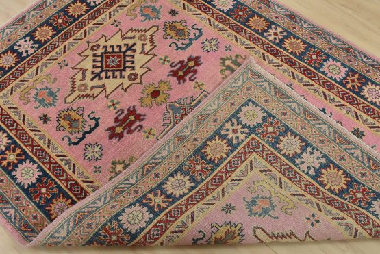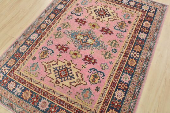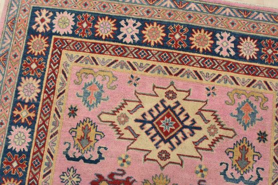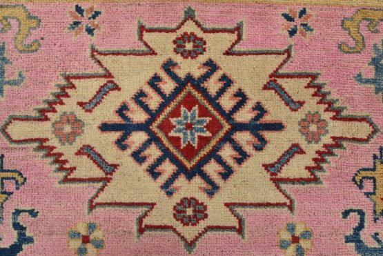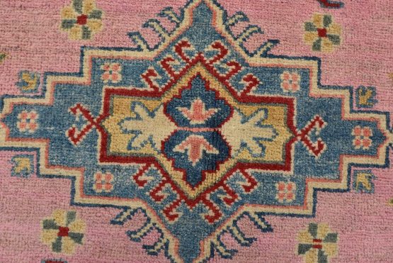 A tribal Caucasian Kazak rug hand-knotted with an all-wool pile on a cotton foundation. This oriental rug features geometric medallions surrounded by small geometric motifs set against a pink background. It is new and in excellent condition.