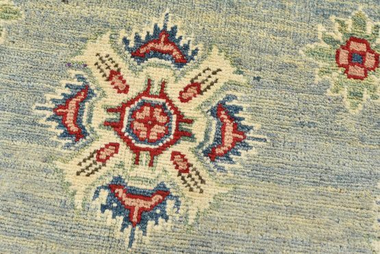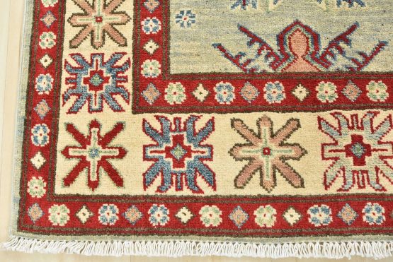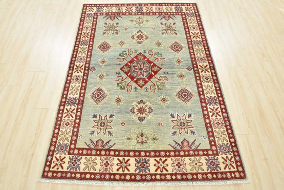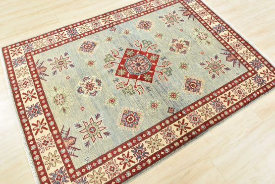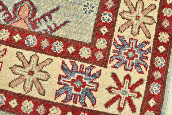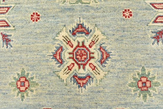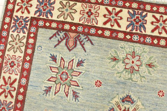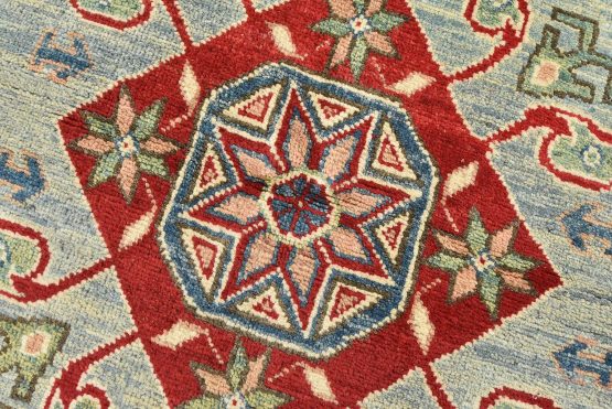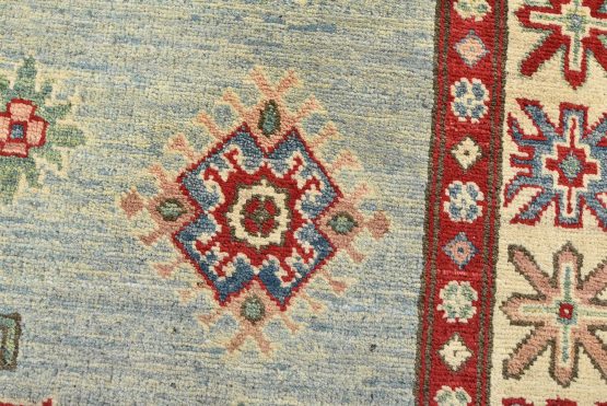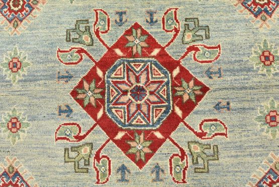 A tribal Caucasian Kazak rug hand-knotted with an all-wool pile on a cotton foundation. This oriental rug features a central medallion surrounded by geometric motifs set against a light blue background. It is new and in excellent condition.
