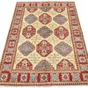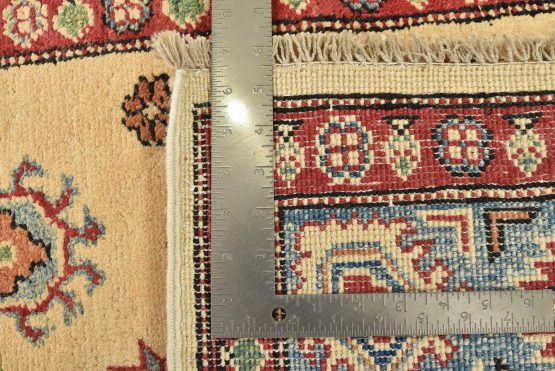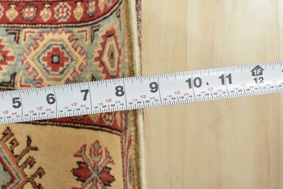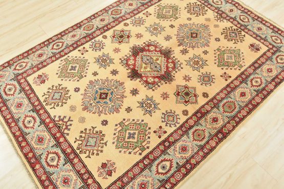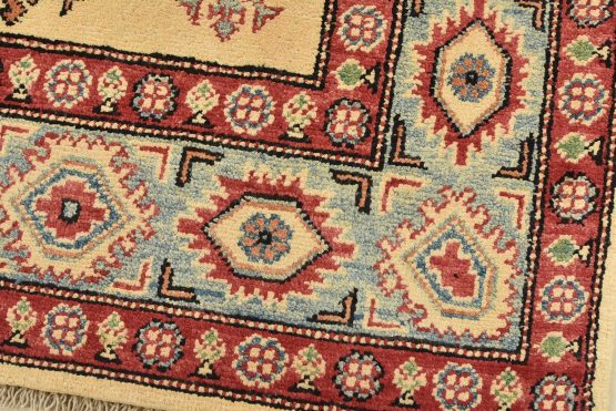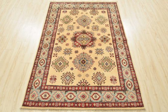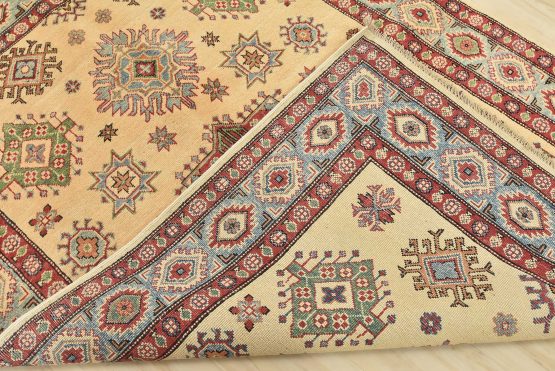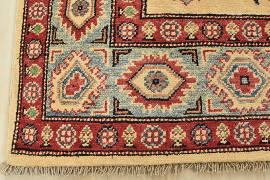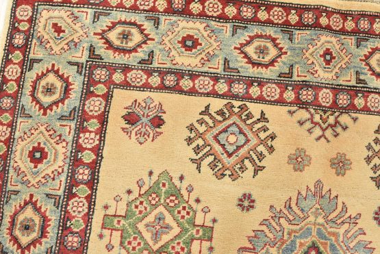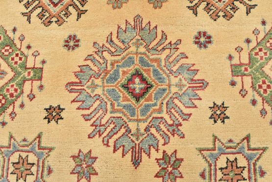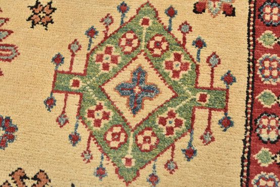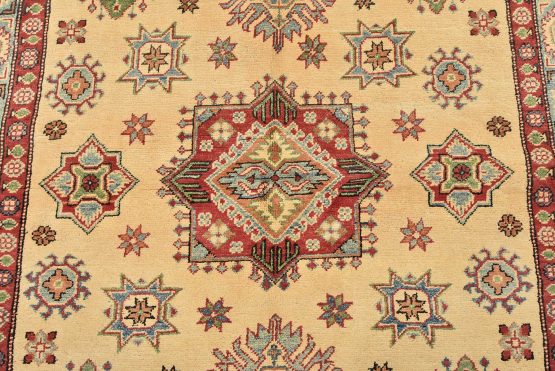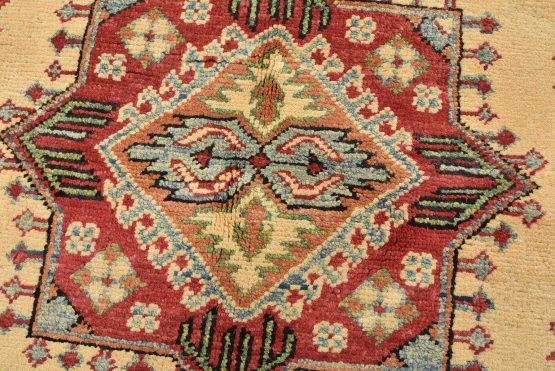 A tribal Caucasian Kazak rug hand-knotted with an all-wool pile on a cotton foundation. This oriental rug features a central geometric medallion surrounded by geometric motifs set against a beige background. It is new and in excellent condition.