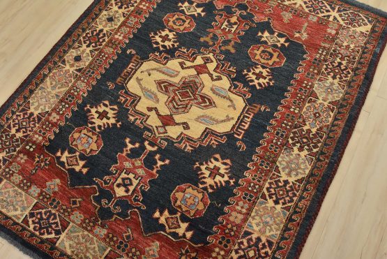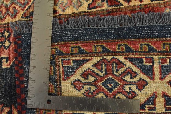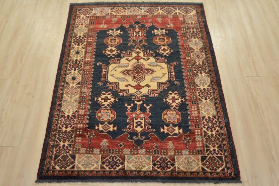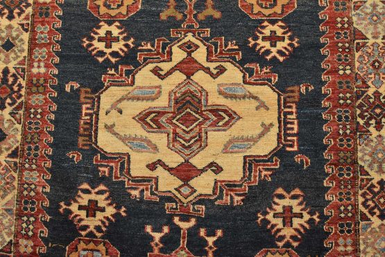 A tribal Caucasian Kazak rug hand-knotted with an all-wool pile on a cotton foundation. This oriental rug features a central geometric medallion surrounded by small geometric motifs set against a blue background. It is new and in excellent condition.