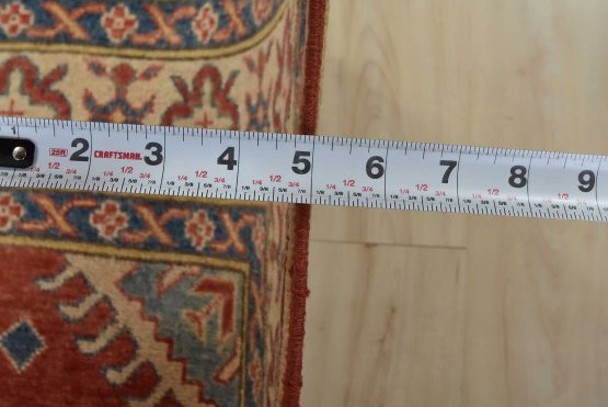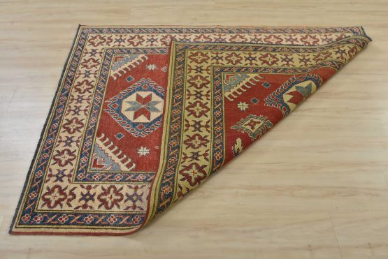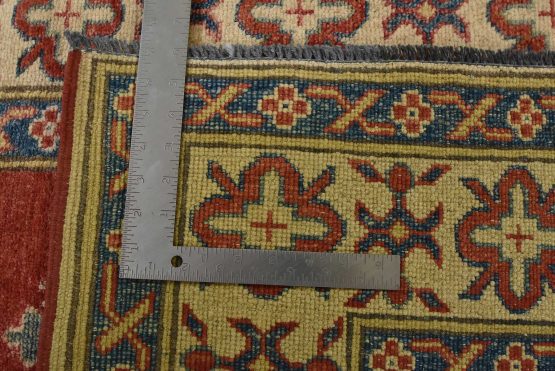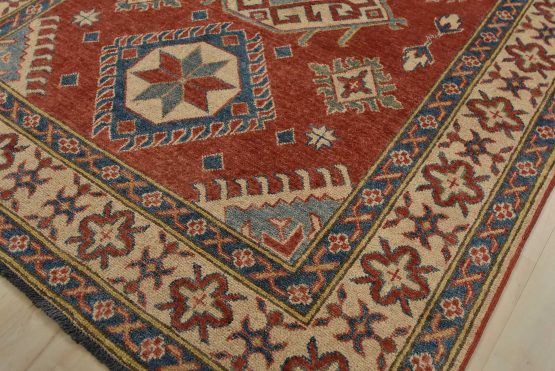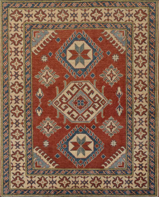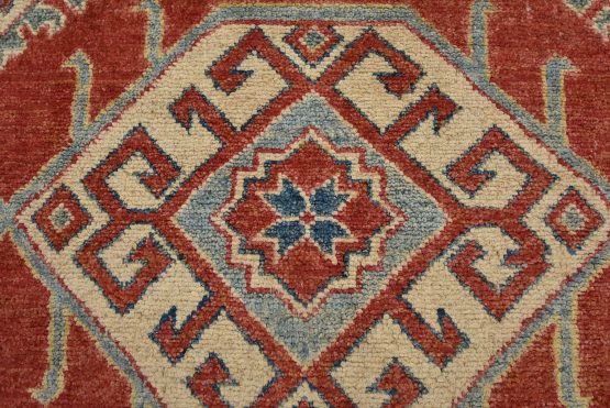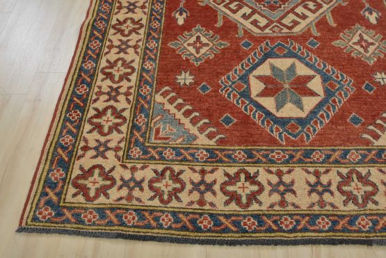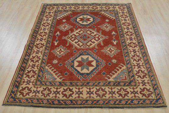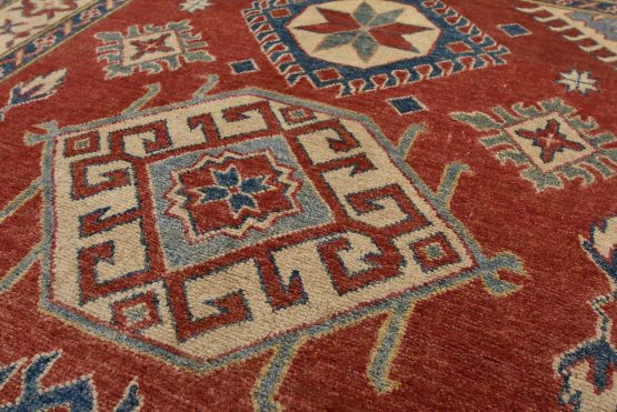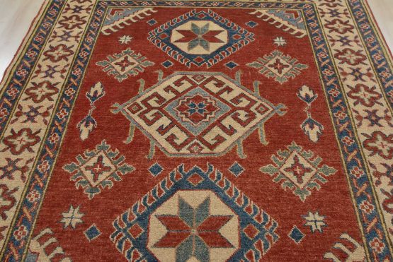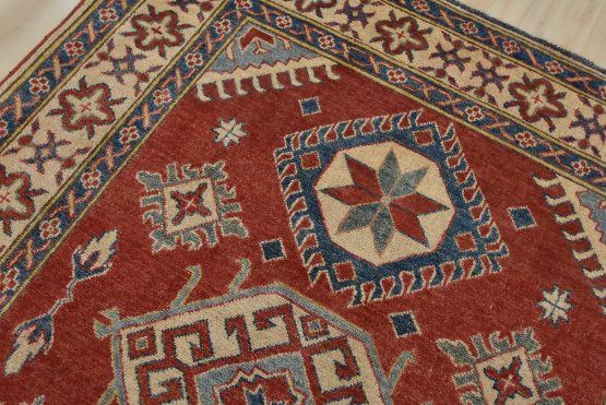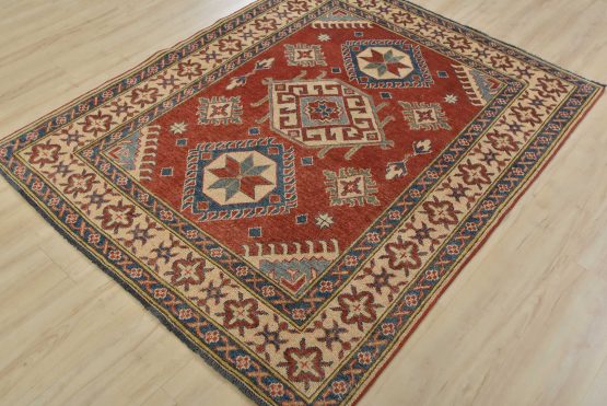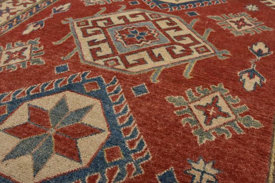A tribal Caucasian Kazak rug hand-knotted with an all-wool pile on a cotton foundation. This oriental rug features geometric medallions surrounded by geometric motifs set against a red background. It is new and in excellent condition.