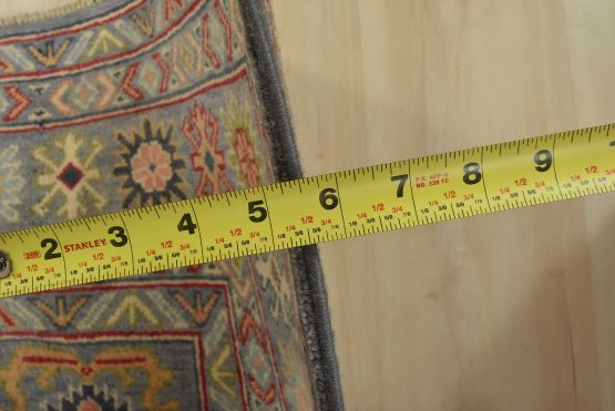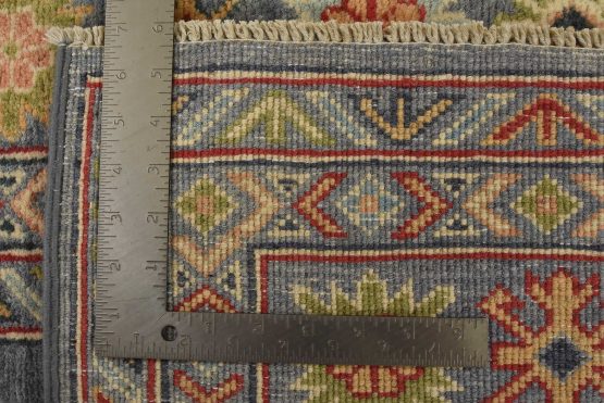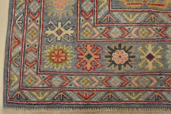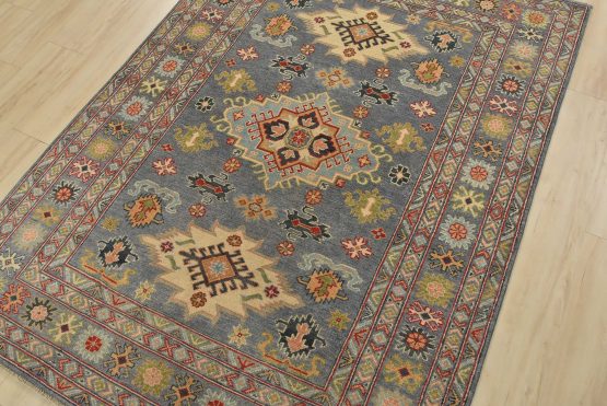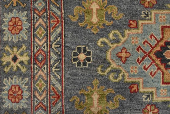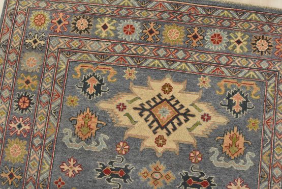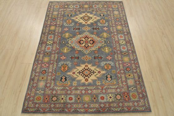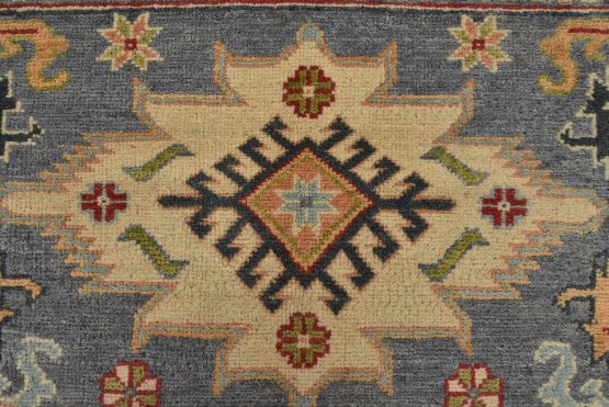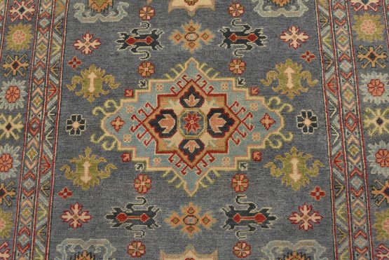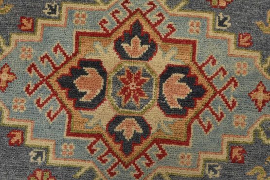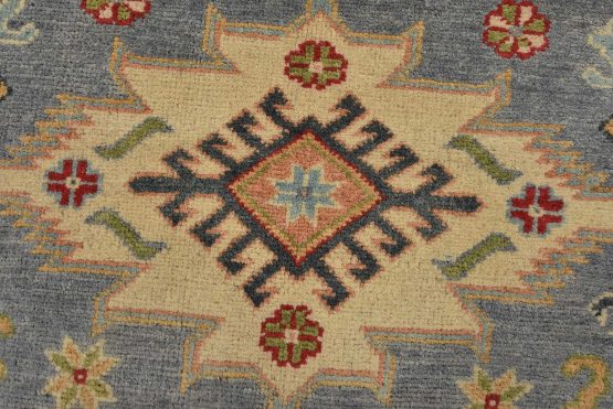 A tribal Caucasian Kazak rug hand-knotted with an all-wool pile on a cotton foundation. This oriental rug features geometric medallions surrounded by geometric motifs set against a gray background. It is new and in excellent condition.