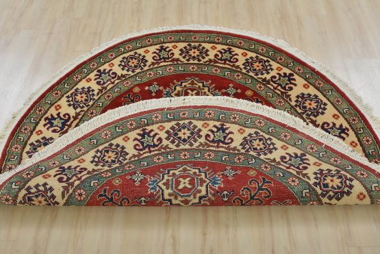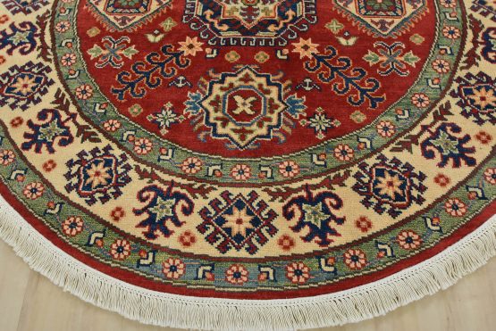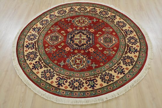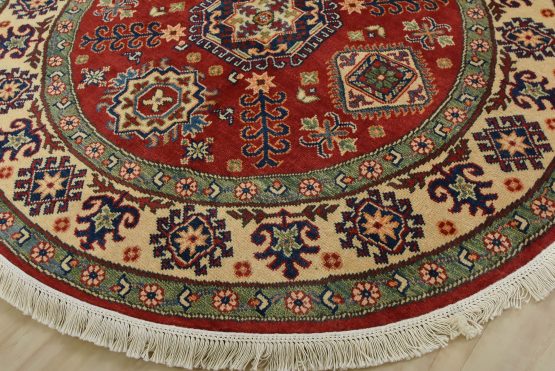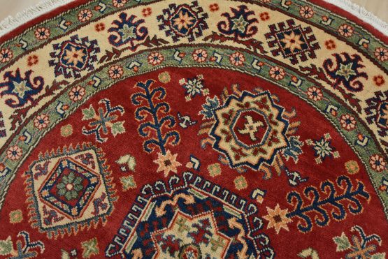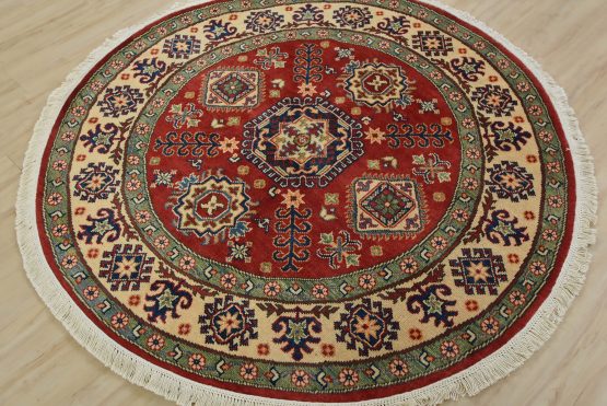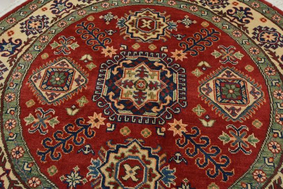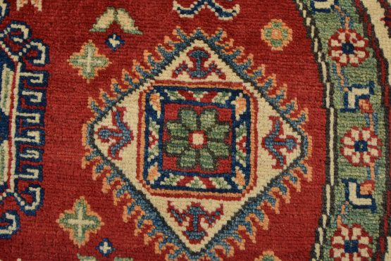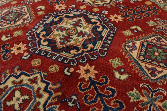 A traditional tribal Caucasian Kazak rug hand-knotted with an all-wool pile on a cotton foundation. This oriental rug features a central geometric medallion surrounded by geometric motifs set against a red background. It is new and in excellent condition.
