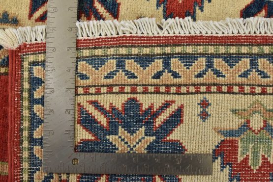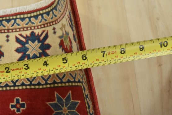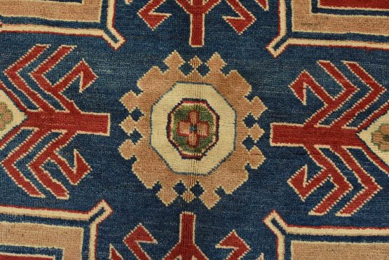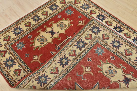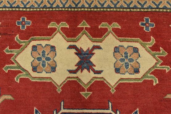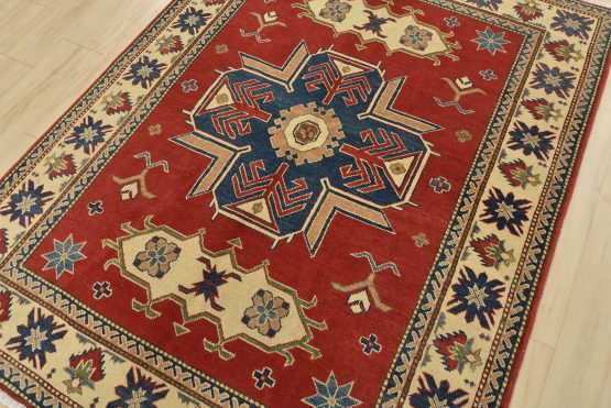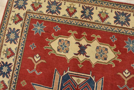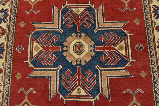 A traditional tribal Caucasian Kazak rug hand-knotted with an all-wool pile on a cotton foundation. This oriental rug features a central geometric medallion surrounded by geometric motifs set against a red background. It is new and in excellent condition.