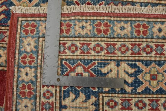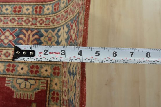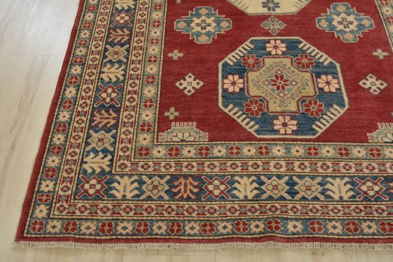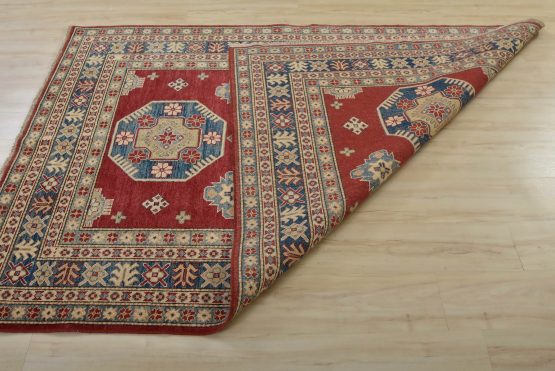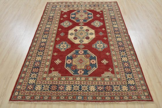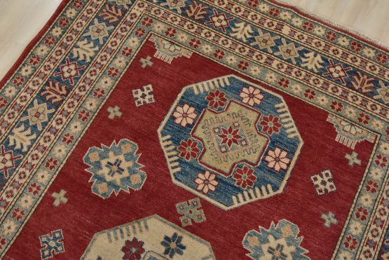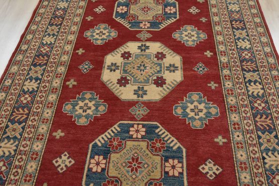 A tribal Caucasian Kazak rug hand-knotted with an all-wool pile on a cotton foundation. This oriental rug features geometric medallions surrounded by geometric motifs set against a red background. It is new and in excellent condition.