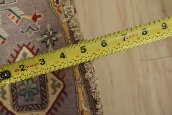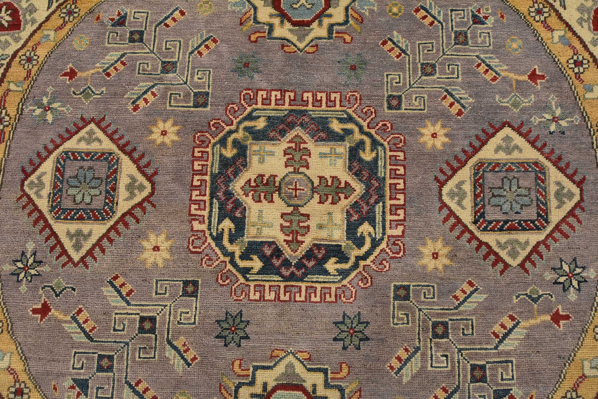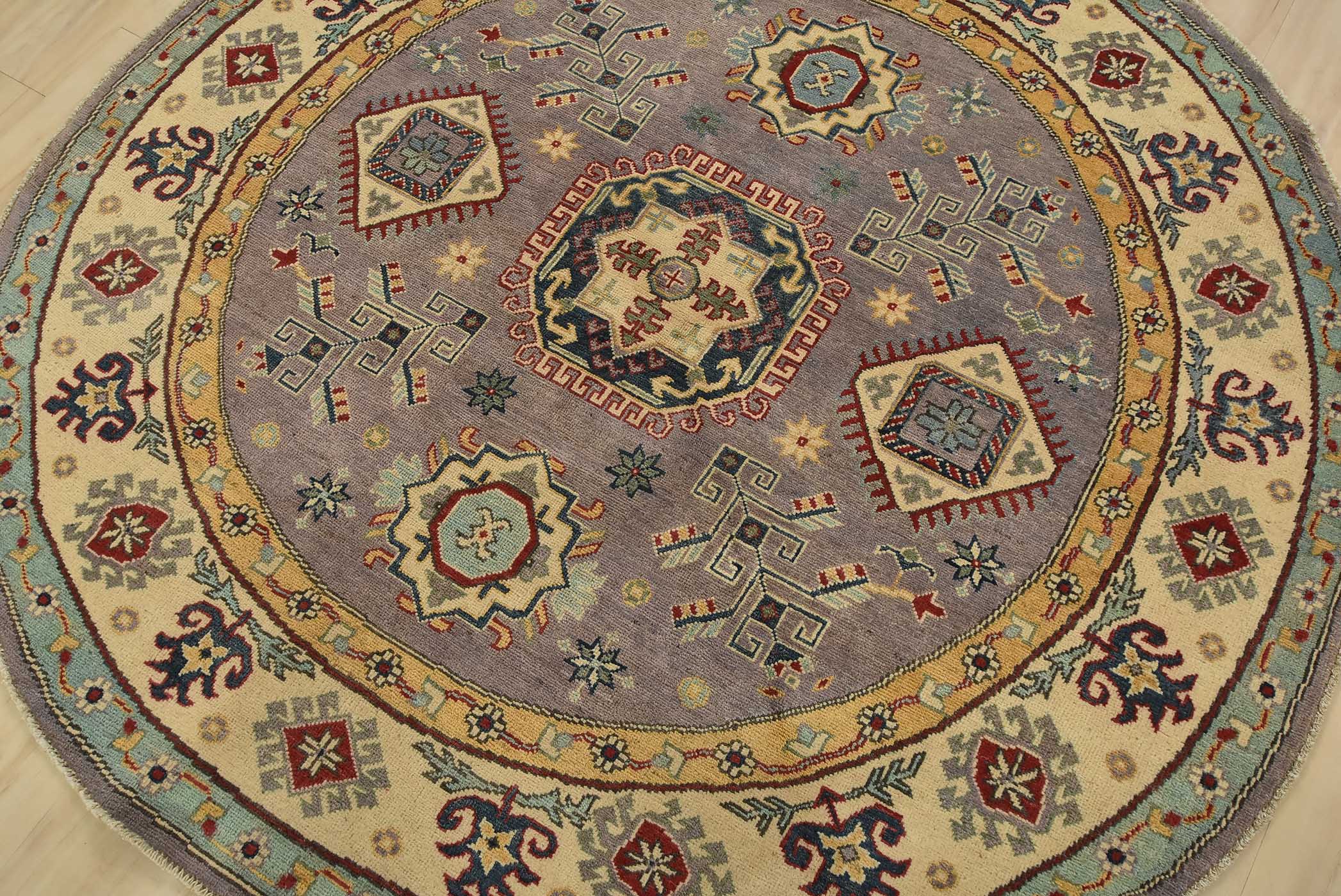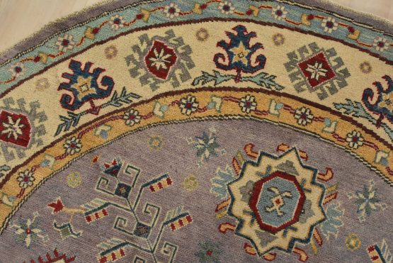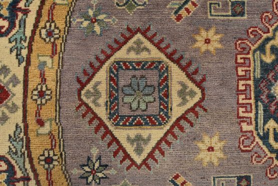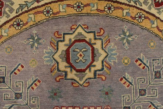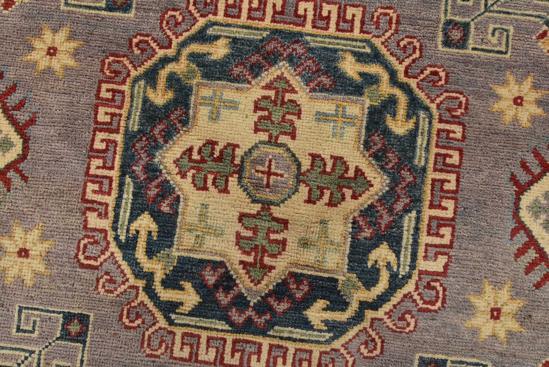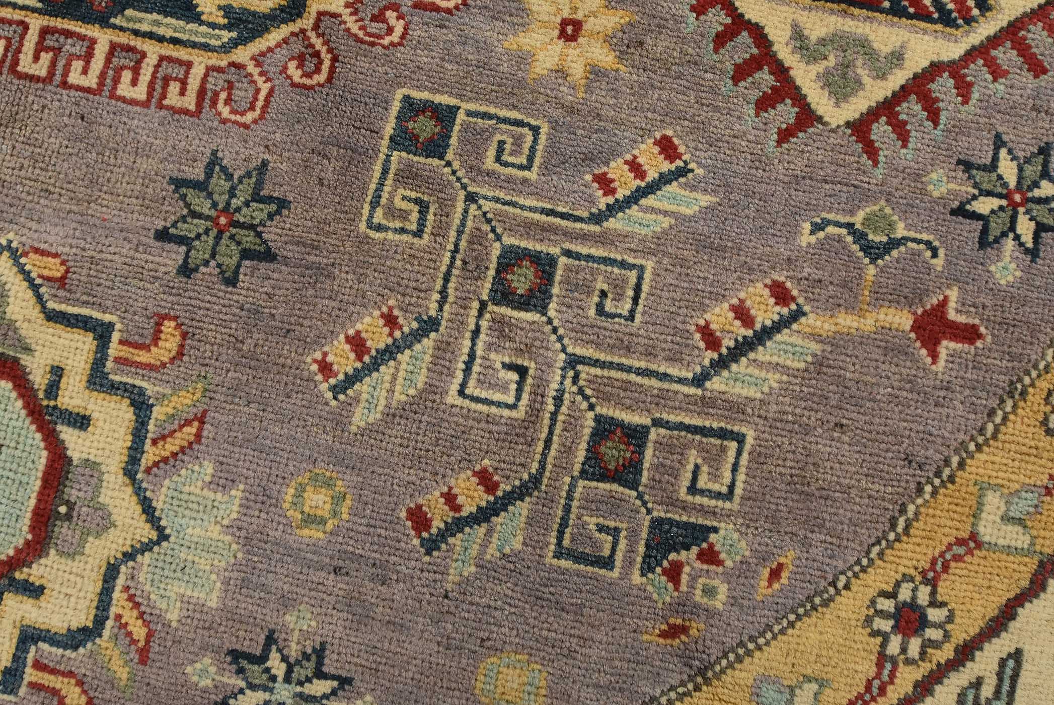 A tribal Caucasian Kazak rug hand-knotted with fine wool on a cotton foundation. This rug features a central medallion surrounded by small geometric motifs set against a light purple background. It is new and in excellent condition.