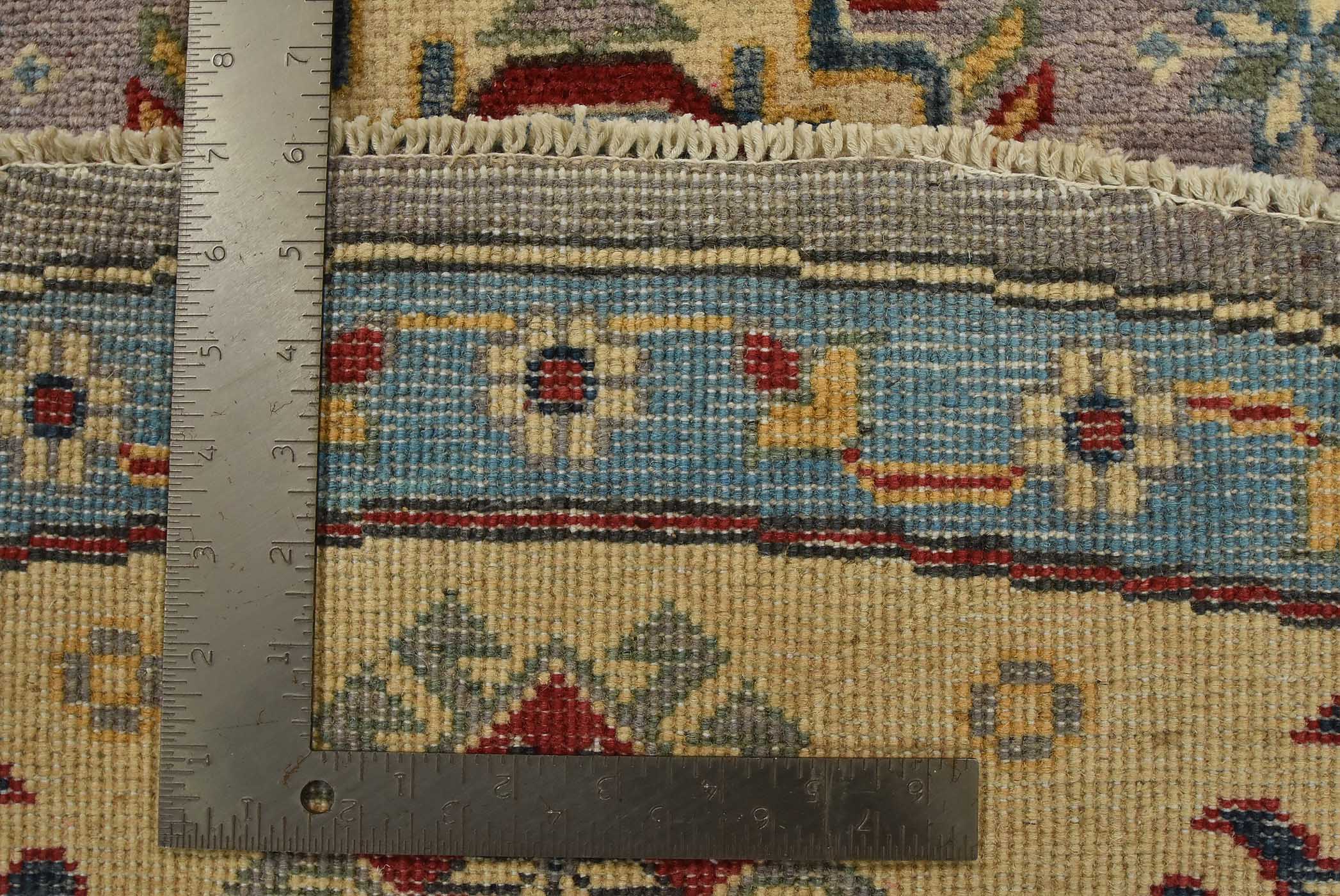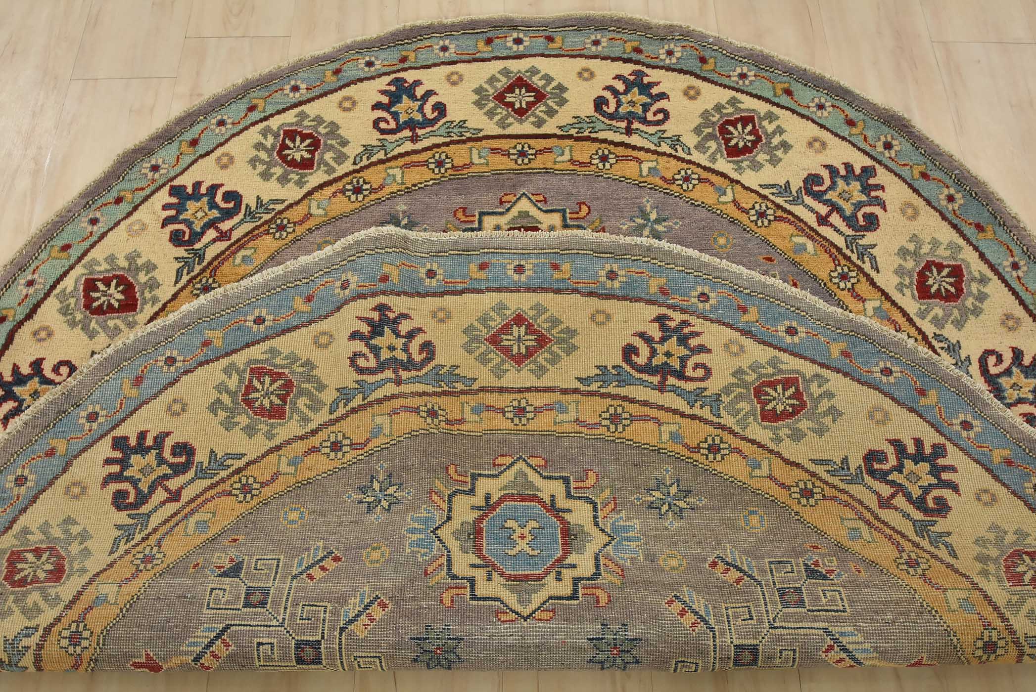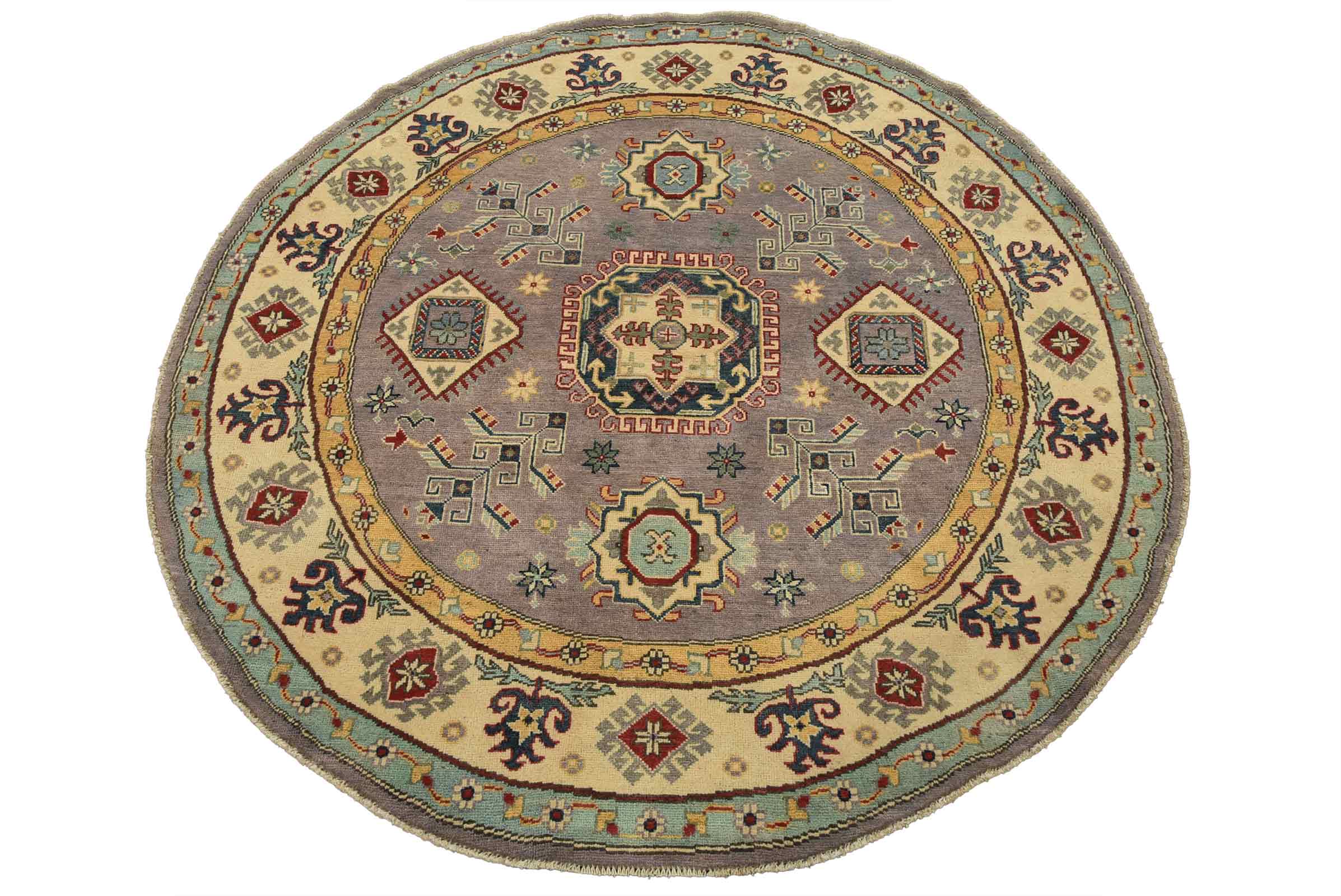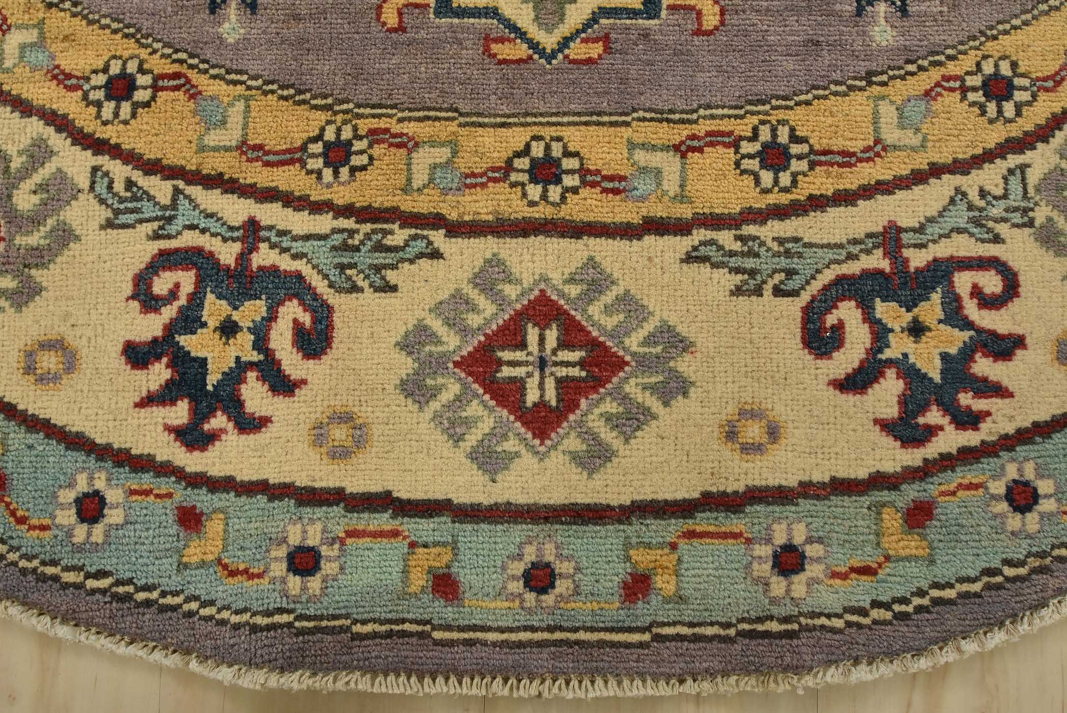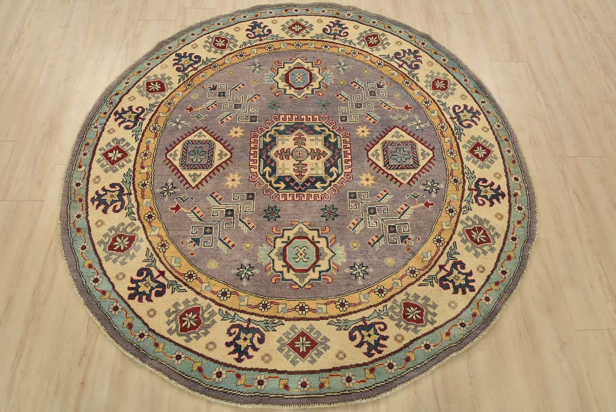 A tribal Caucasian Kazak rug hand-knotted with fine wool on a cotton foundation. This rug features a central medallion surrounded by small geometric motifs set against a light purple background. It is new and in excellent condition.