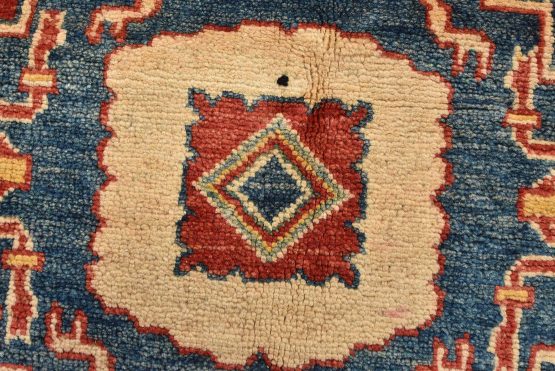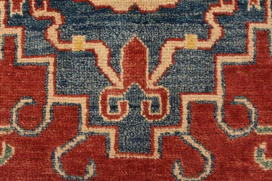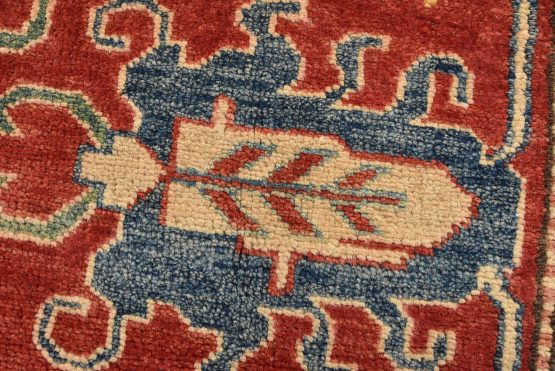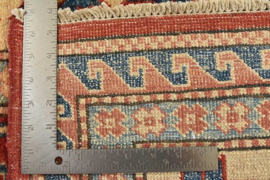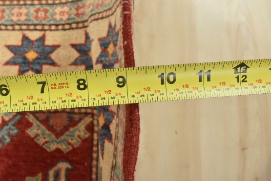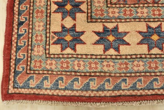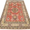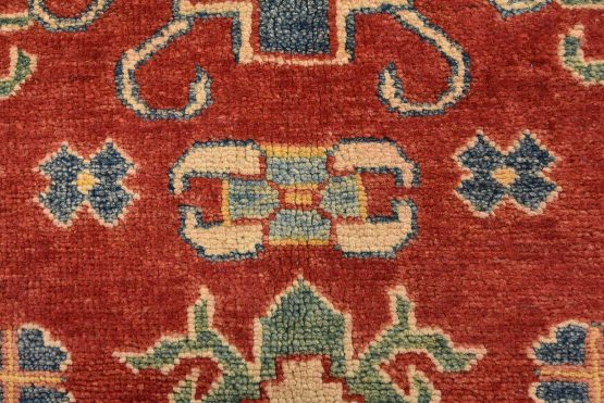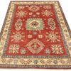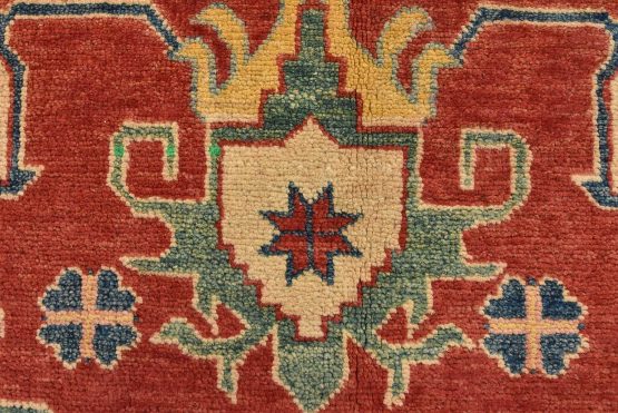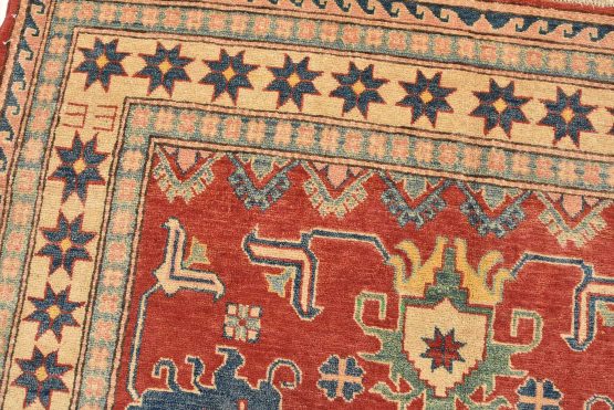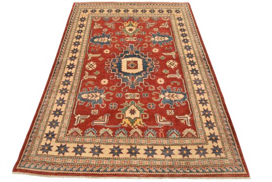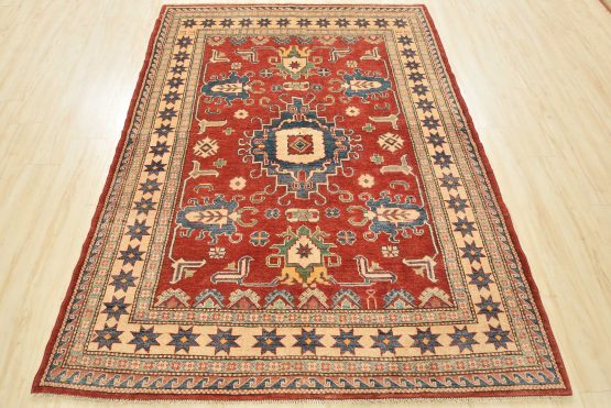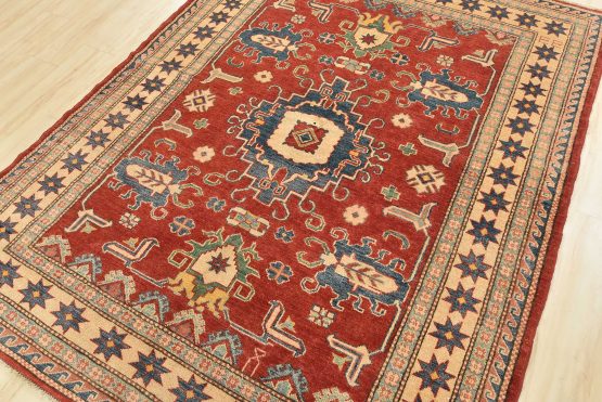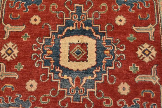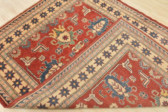 A traditional tribal Caucasian Kazak rug hand-knotted with an all-wool pile on a cotton foundation. This oriental rug features a central geometric medallion surrounded by botanical motifs set against a red background. It is new and in excellent condition.