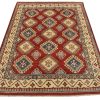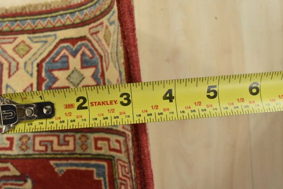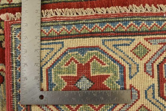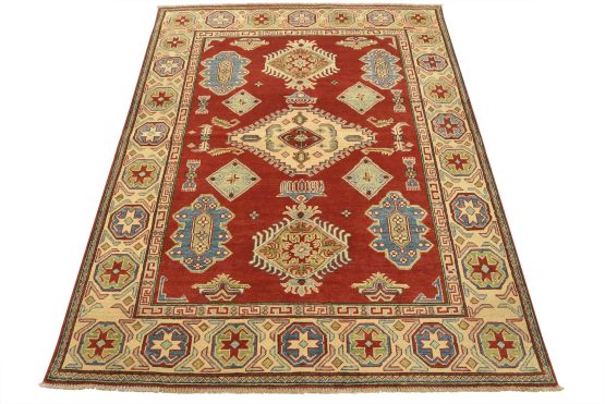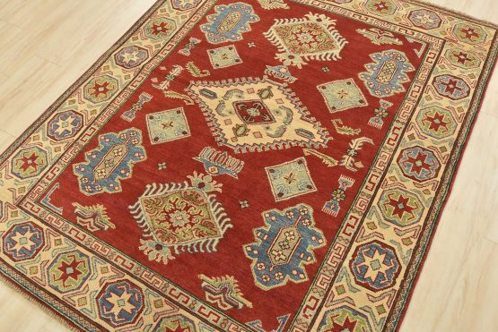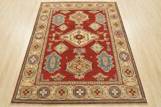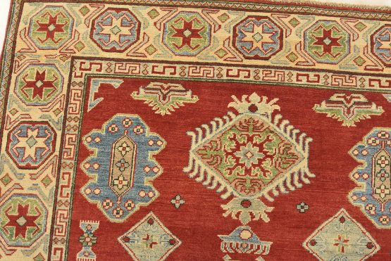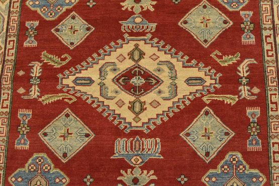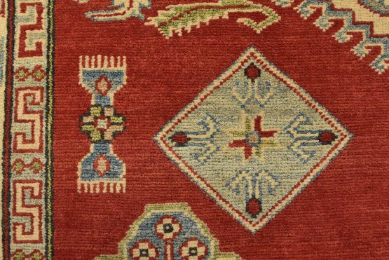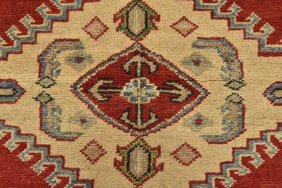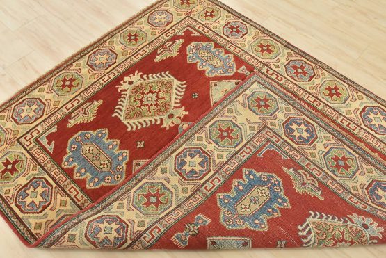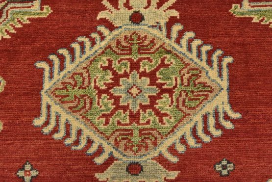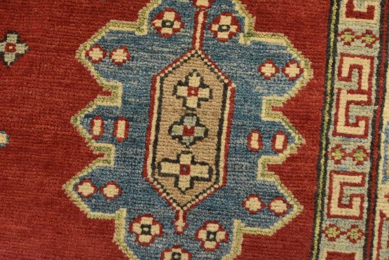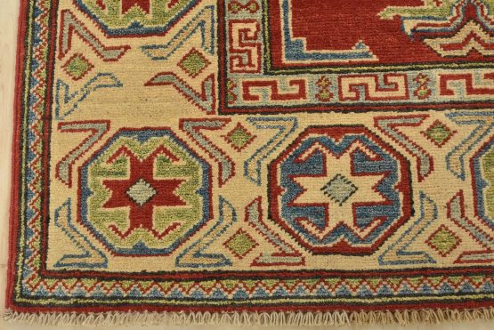 A tribal Caucasian Kazak rug hand-knotted with an all-wool pile on a cotton foundation. This oriental rug features a geometric central medallion surrounded by geometric motifs set against a red background. It is new and in excellent condition.