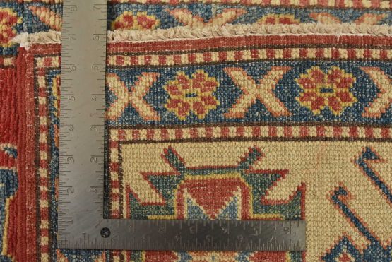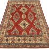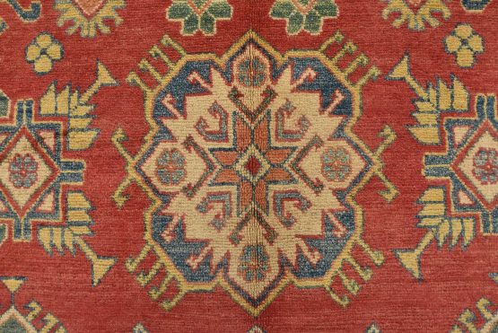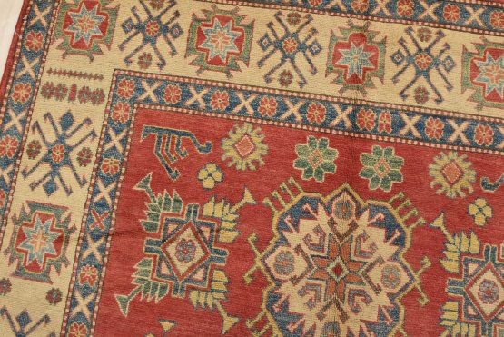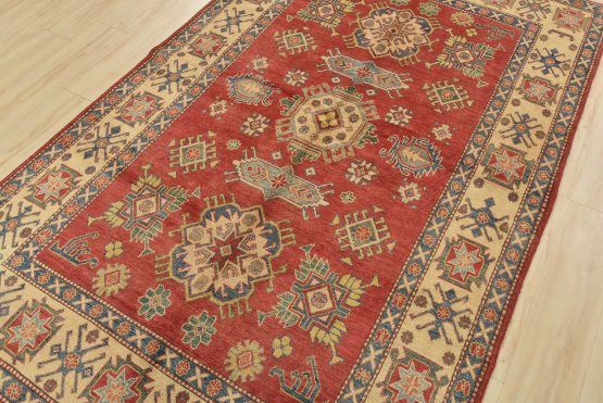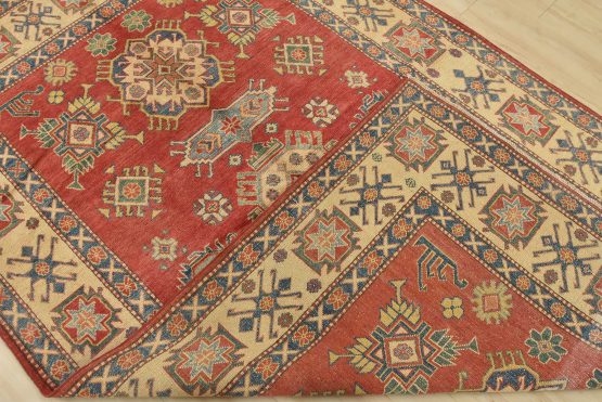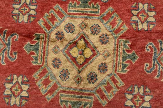 A tribal Caucasian Kazak rug hand-knotted with an all-wool pile on a cotton foundation. This oriental rug features geometric medallions surrounded by geometric motifs set against a red background. It is new and in excellent condition.