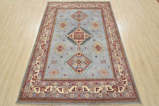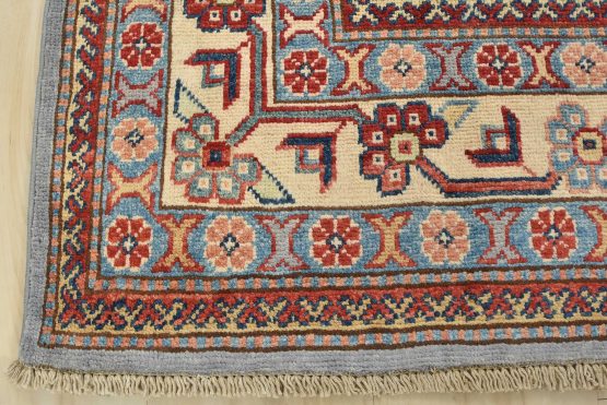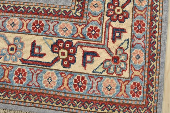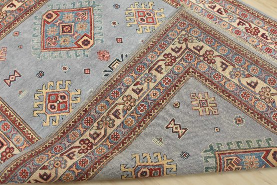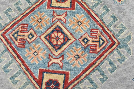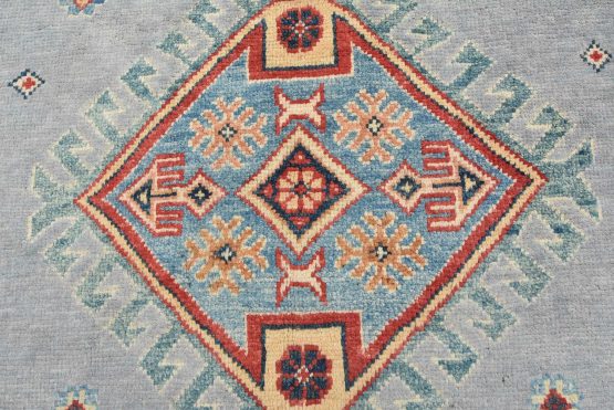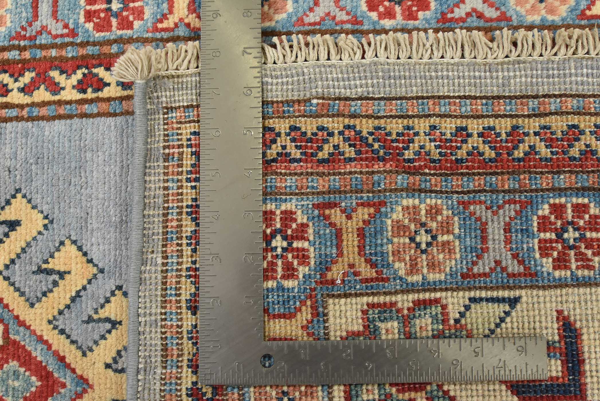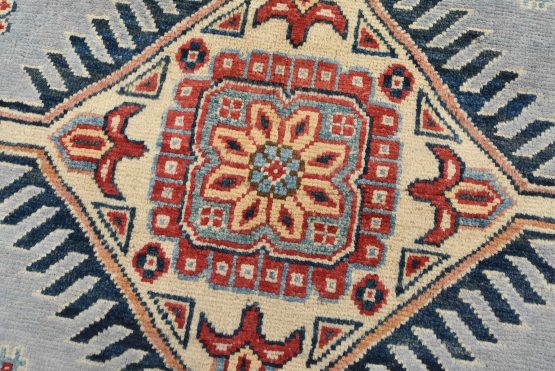 A tribal Caucasian Kazak rug hand-knotted with an all-wool pile on a cotton foundation. This oriental rug features geometric medallions surrounded by geometric motifs set against a light blue background. It is new and in excellent condition.