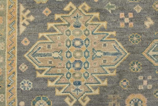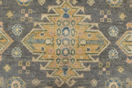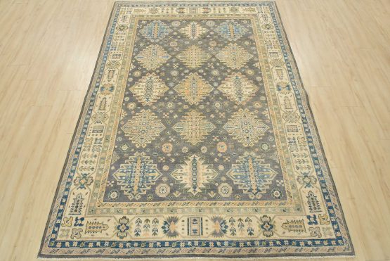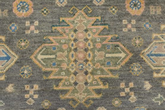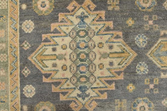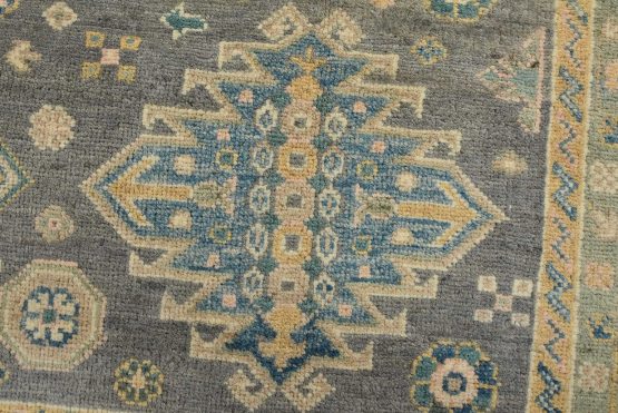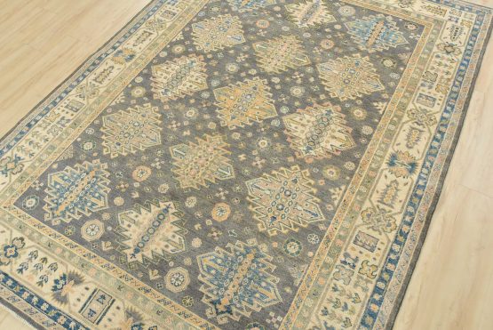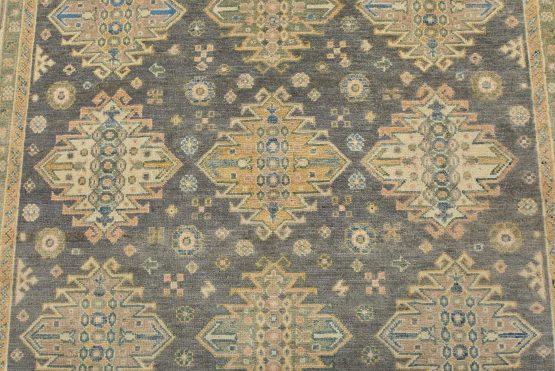 A tribal Caucasian Kazak rug hand-knotted with an all-wool pile on a cotton foundation. This oriental rug features rows of geometric medallions surrounded by small geometric motifs set against a gray background. It is new and in excellent condition.