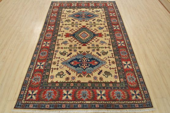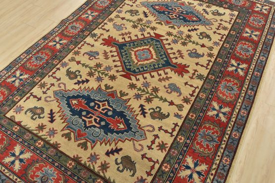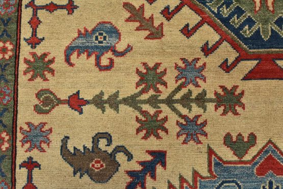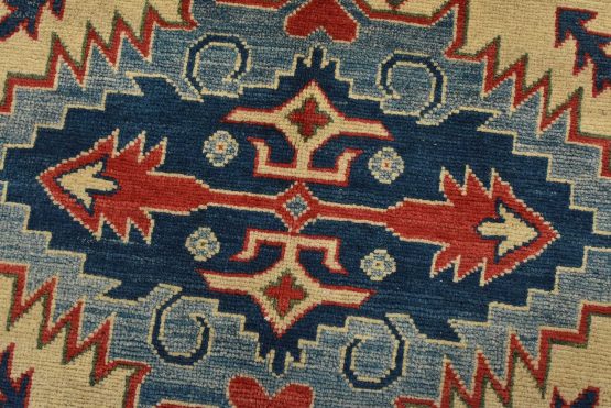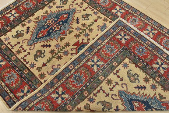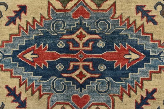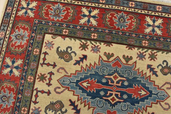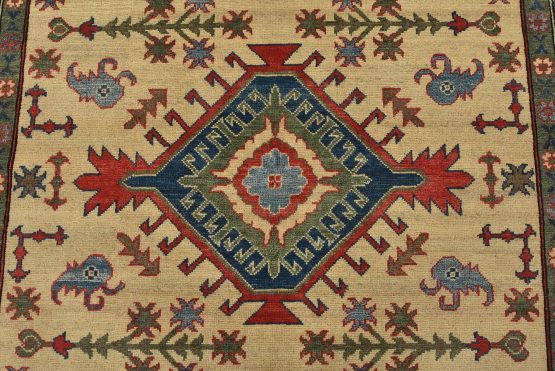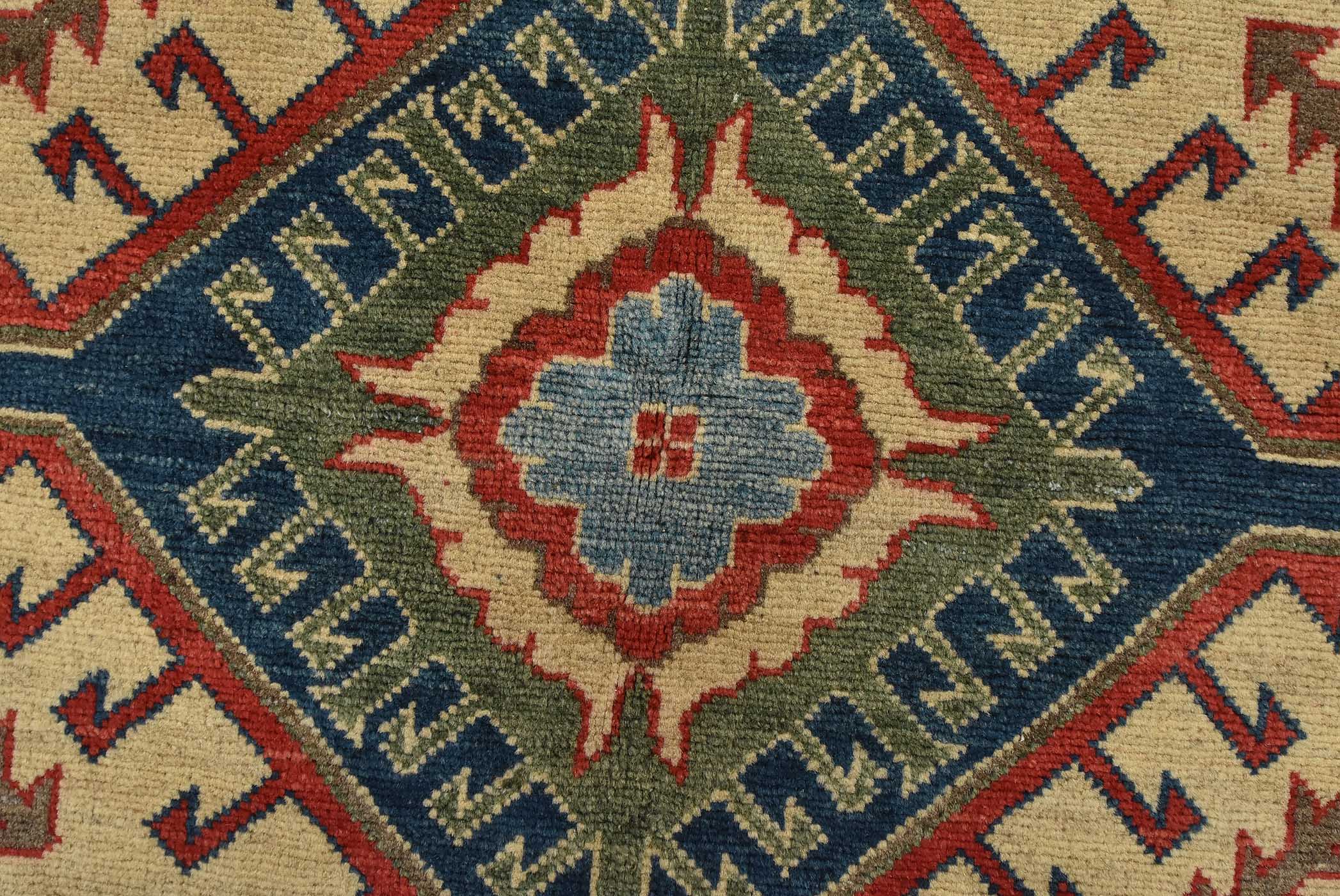 A tribal Caucasian Kazak rug hand-knotted with an all-wool pile on a cotton foundation. This oriental rug features geometric medallions surrounded by geometric botanical designs set against a beige background. It is new and in excellent condition.