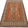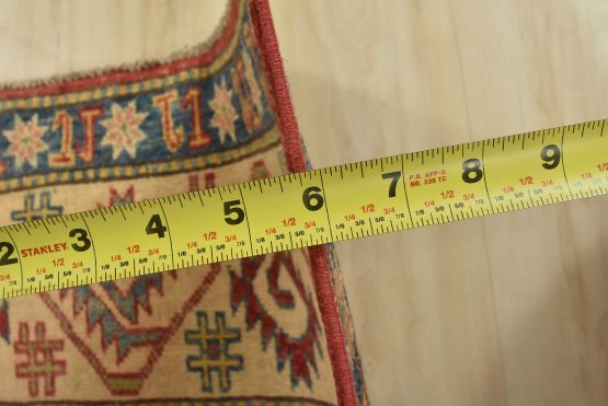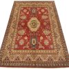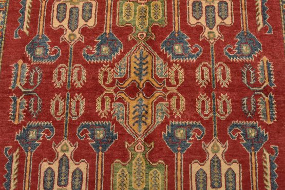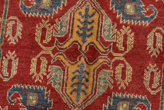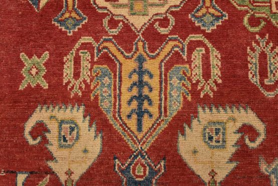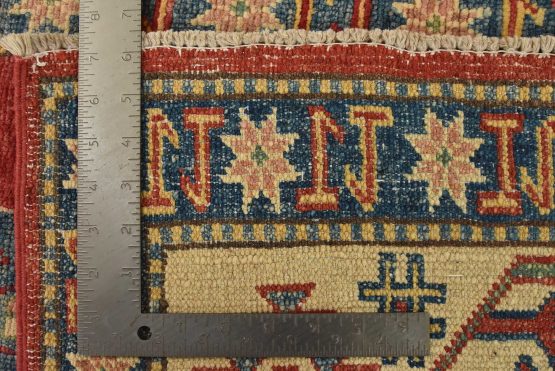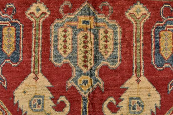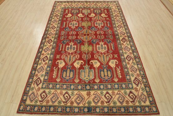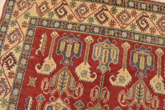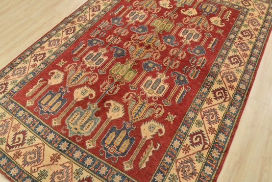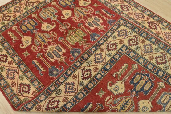 A traditional tribal Caucasian Kazak rug hand-knotted with an all-wool pile on a cotton foundation. This oriental rug features an all-over design of geometric motifs set against a red background. It is new and in excellent condition.