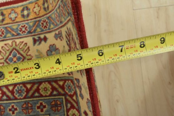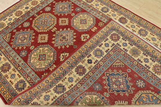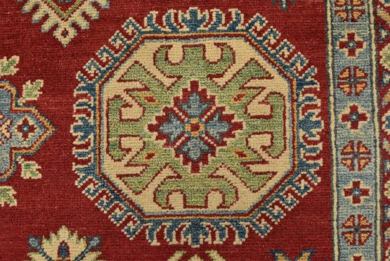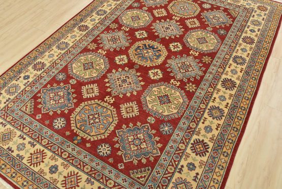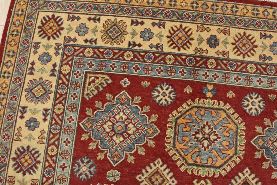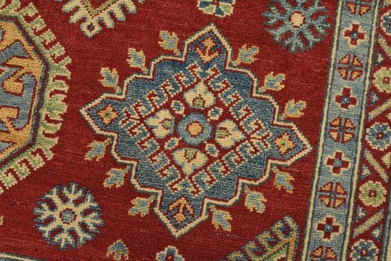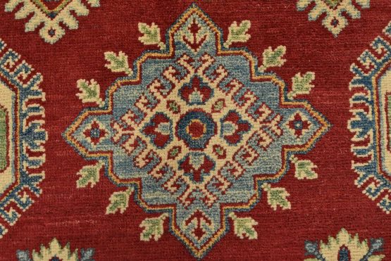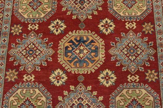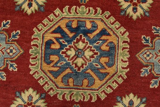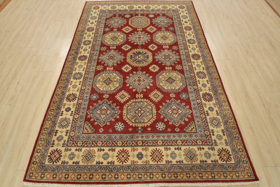 A traditional tribal Caucasian Kazak rug hand-knotted with an all-wool pile on a cotton foundation. This oriental rug features rows of geometric medallions set against a red background. It is new and in excellent condition.