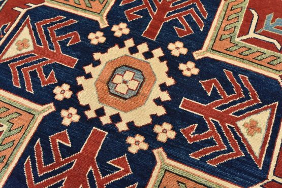 Original antique Kazak rugs from the Caucasus region inspire the creation of new Kazak rugs. These rugs are woven with fine wool using traditional Kazak patterns and finished with a low-cut pile to give them an authentic vintage look.