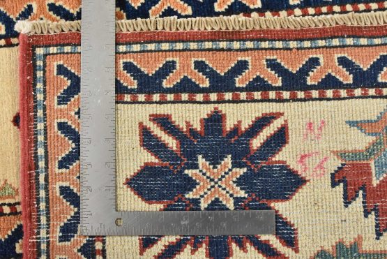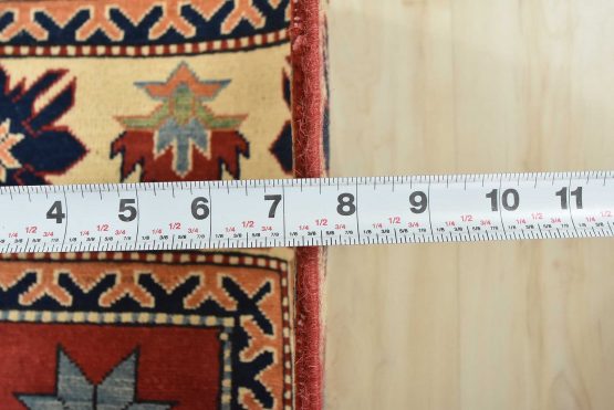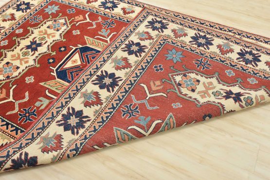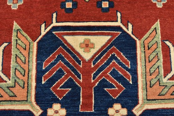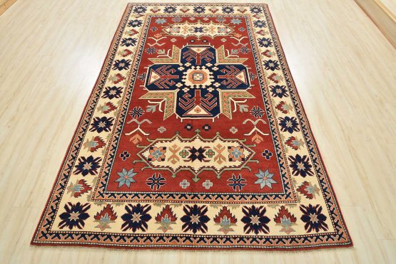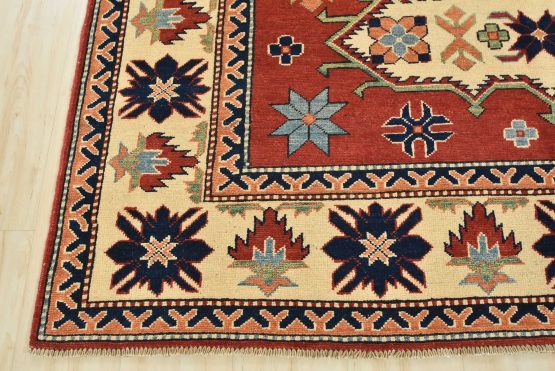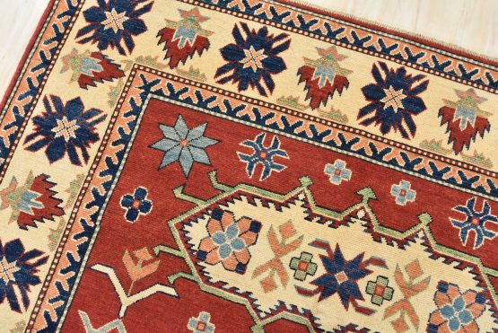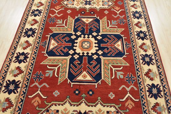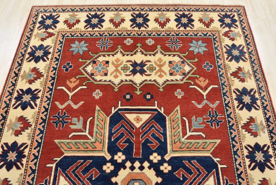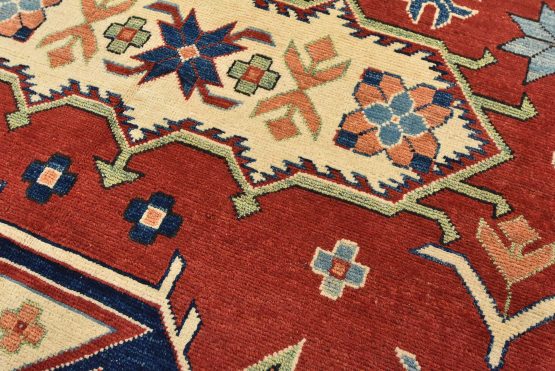 A tribal Caucasian Kazak rug hand-knotted with an all-wool pile on a cotton foundation. This oriental rug features a central geometric medallion surrounded by geometric motifs set against a red background. It is new and in excellent condition.