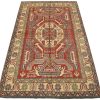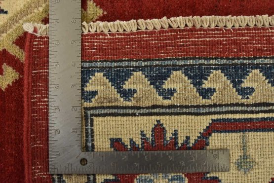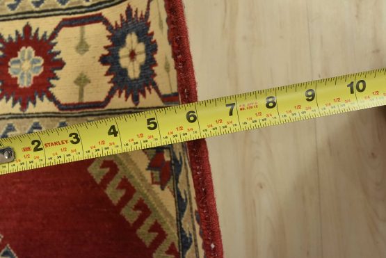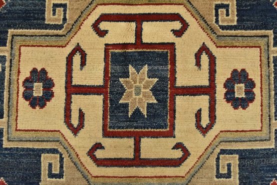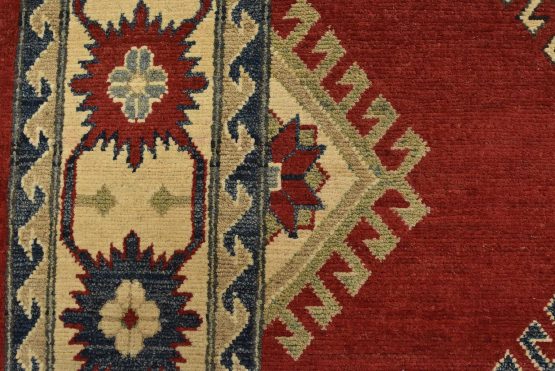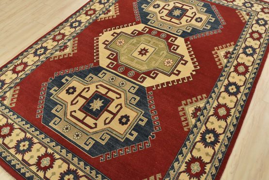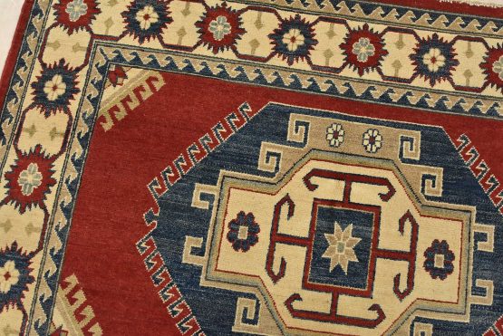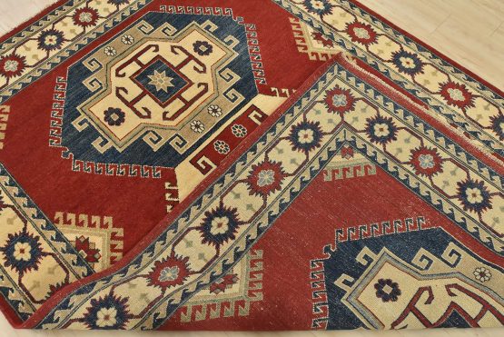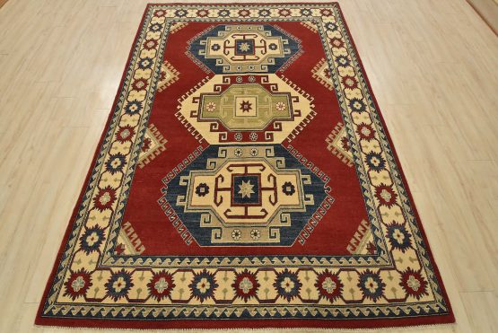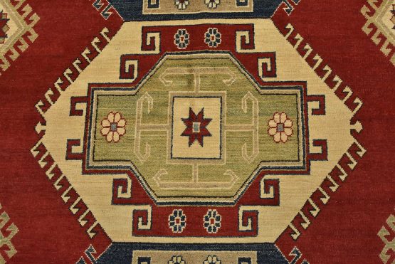 A tribal Caucasian Kazak rug hand-knotted with an all-wool pile on a cotton foundation. This oriental rug features three geometric medallions set against a red background. It is new and in excellent condition.