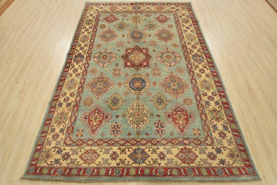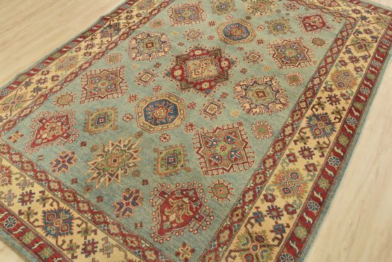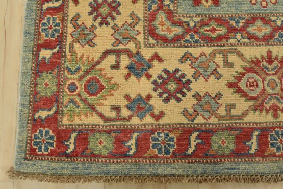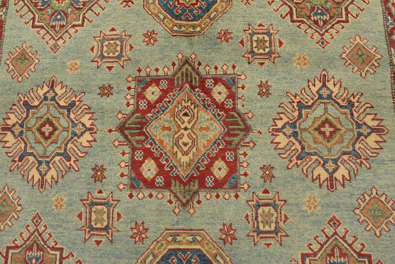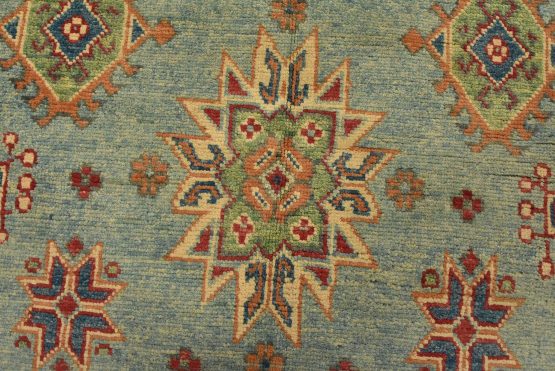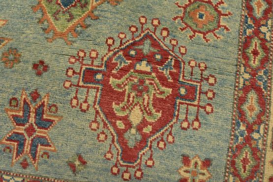 A traditional tribal Caucasian Kazak rug hand-knotted with an all-wool pile on a cotton foundation. This oriental rug features geometric medallions adorned with geometric motifs set against a light blue background. It is new and in excellent condition.