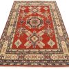 A tribal Caucasian Kazak rug hand-knotted with an all-wool pile on a cotton foundation. This oriental rug features geometric medallions surrounded by geometric motifs set against a red background. It is new and in excellent condition.