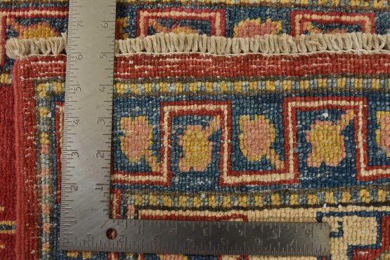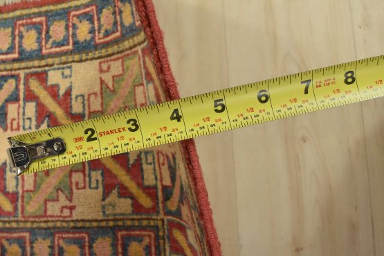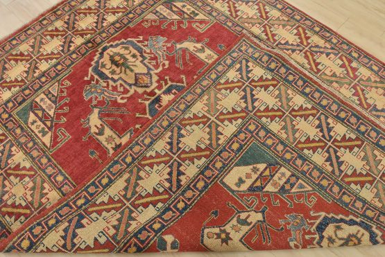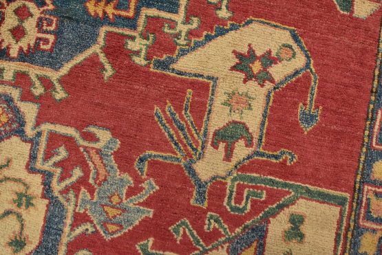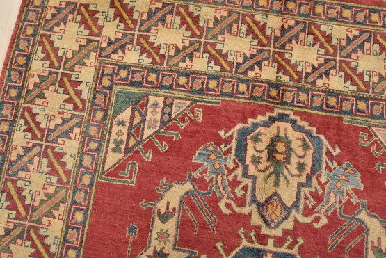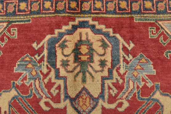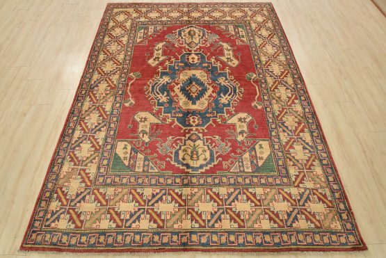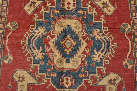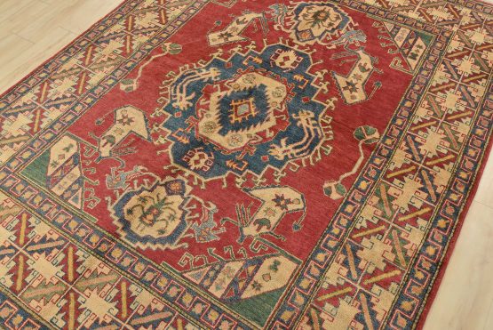 A traditional tribal Caucasian Kazak rug hand-knotted with an all-wool pile on a cotton foundation. This oriental rug features a central medallion surrounded by geometric botanical motifs set against a red background. It is new and in excellent condition.