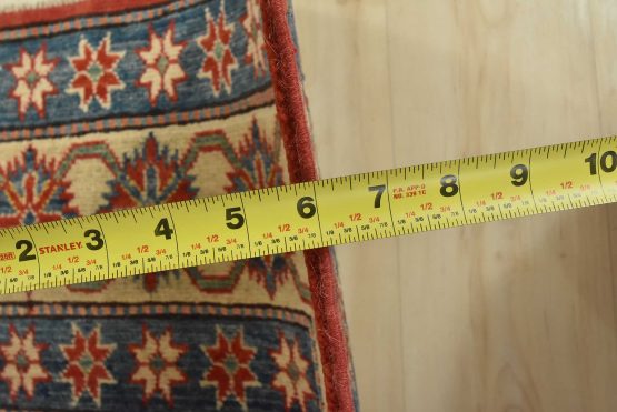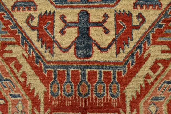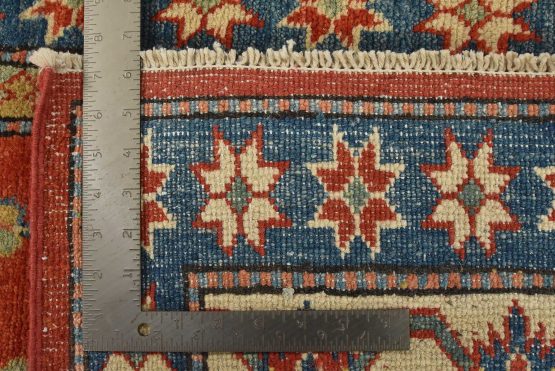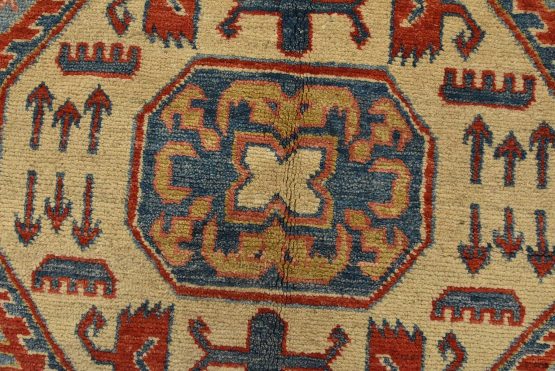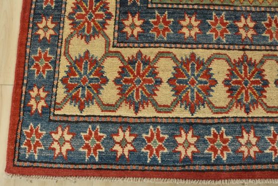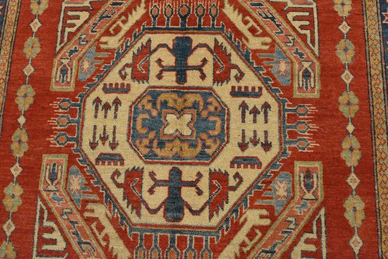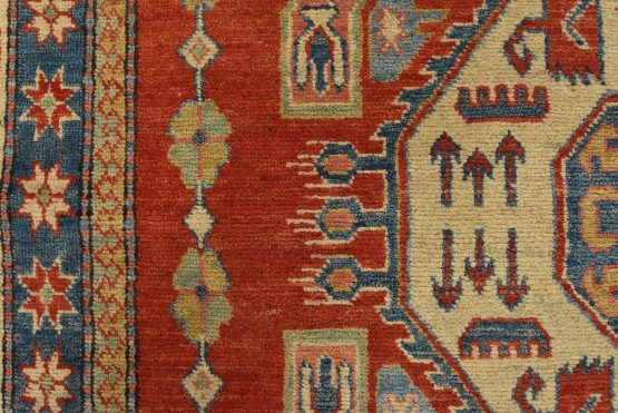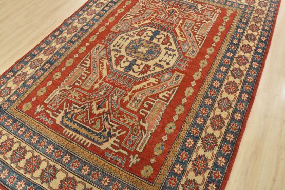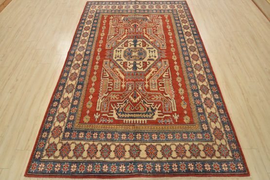 A tribal Caucasian Kazak rug hand-knotted with an all-wool pile on a cotton foundation. This oriental rug features a central geometric medallion surrounded by geometric designs set against a red background. It is new and in excellent condition.