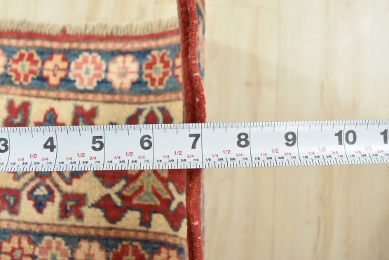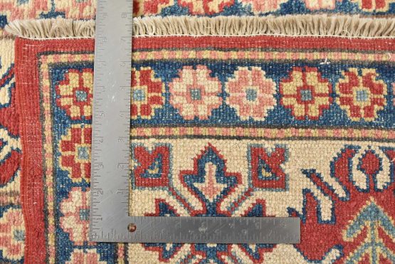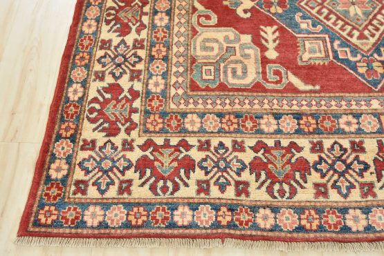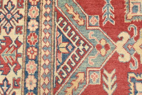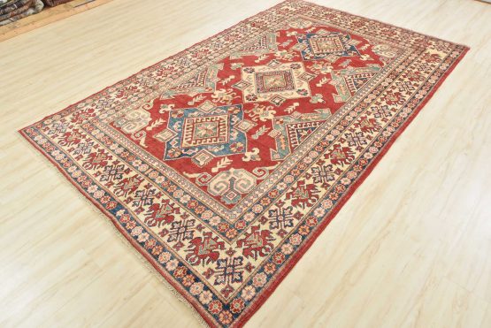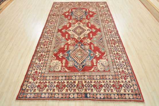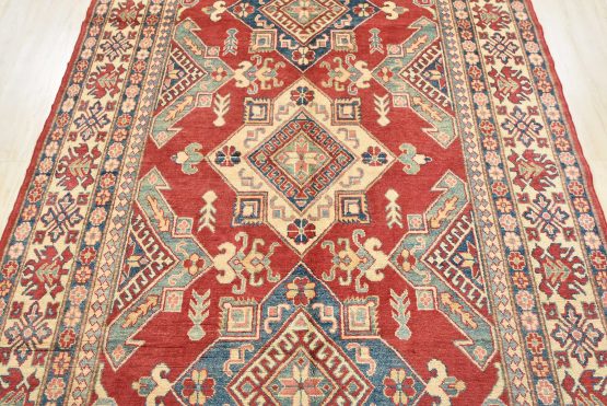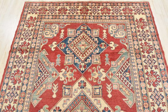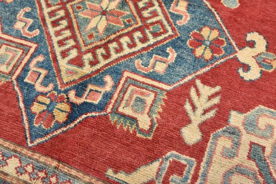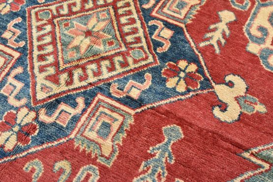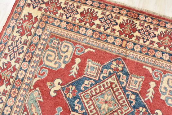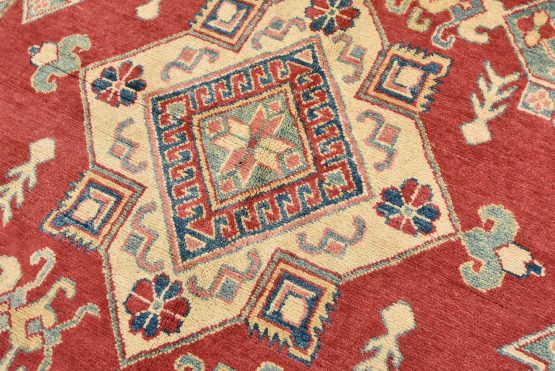 A traditional tribal Caucasian Kazak rug hand-knotted with an all-wool pile on a cotton foundation. This oriental rug features geometric medallions surrounded by geometric motifs set against a red background. It is new and in excellent condition.