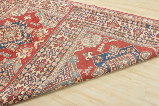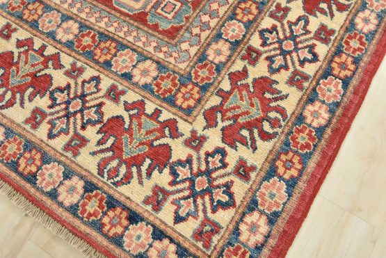 Original antique Kazak rugs from the Caucasus region inspire the creation of new Kazak rugs. These rugs are woven with fine wool using traditional Kazak patterns and finished with a low-cut pile to give them an authentic vintage look.