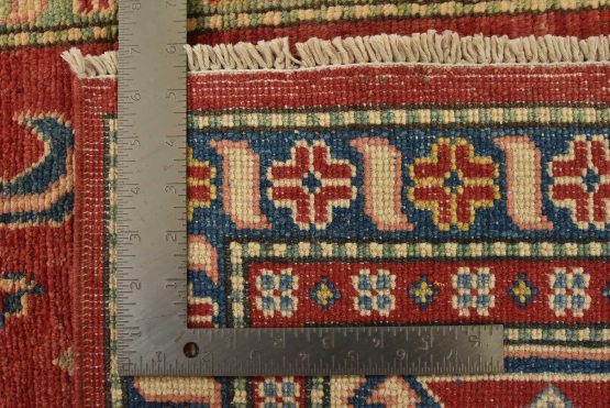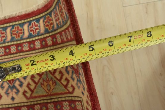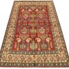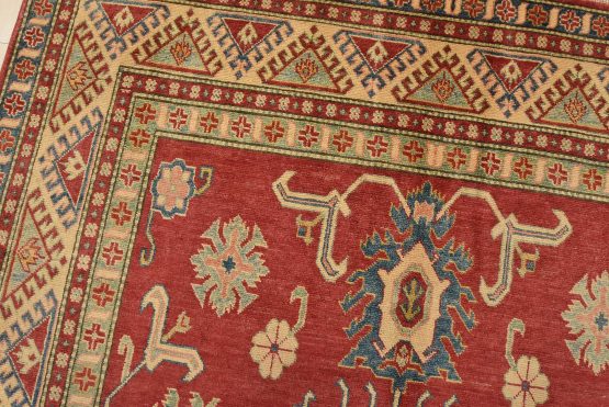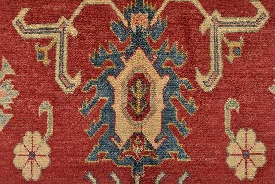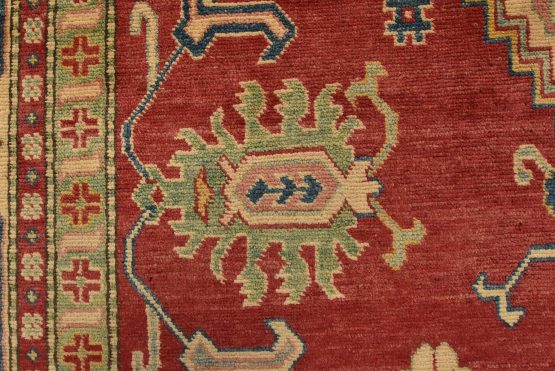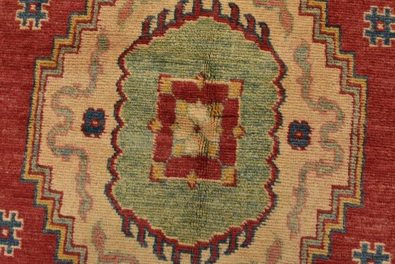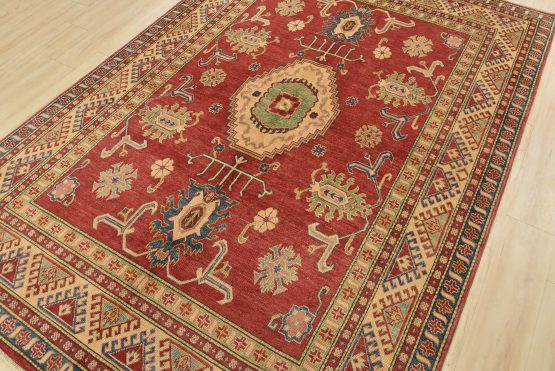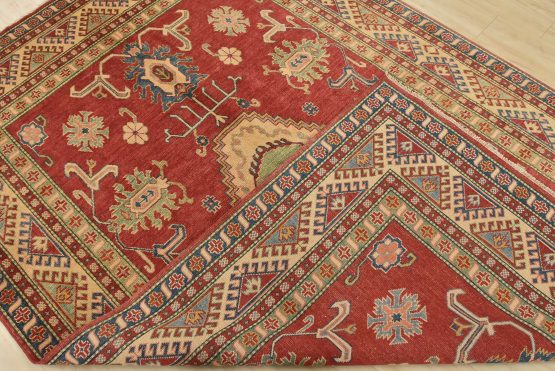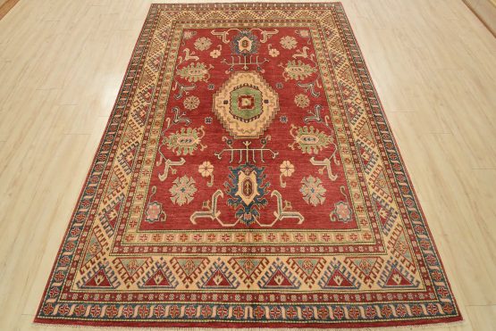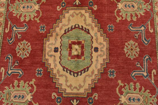 A traditional tribal Caucasian Kazak rug hand-knotted with an all-wool pile on a cotton foundation. This oriental rug features a central geometric medallion surrounded by geometric botanical motifs set against a red background. It is new and in excellent condition.