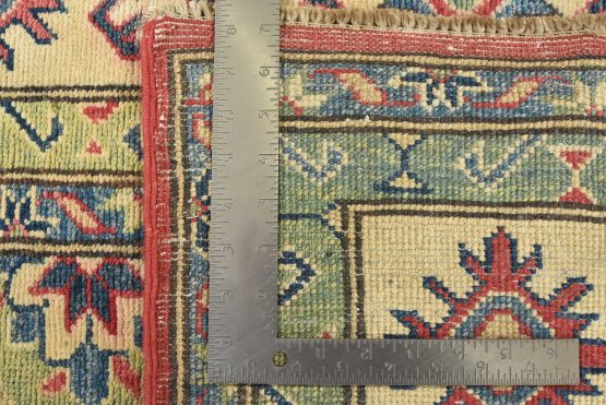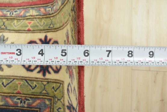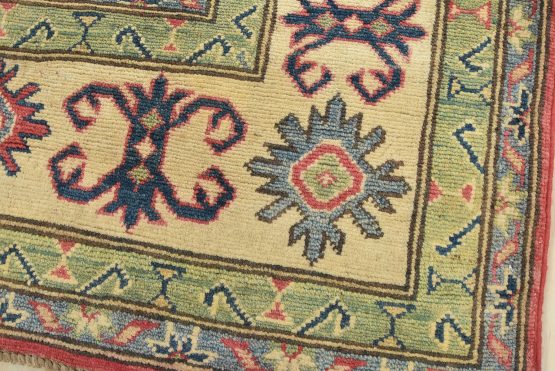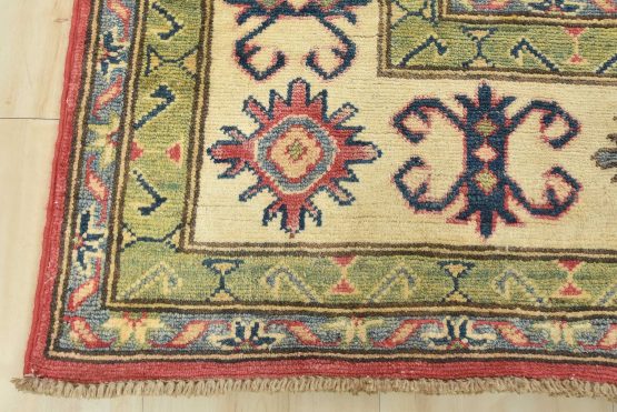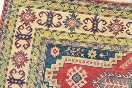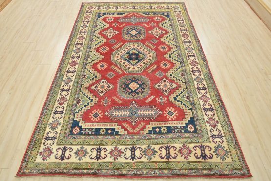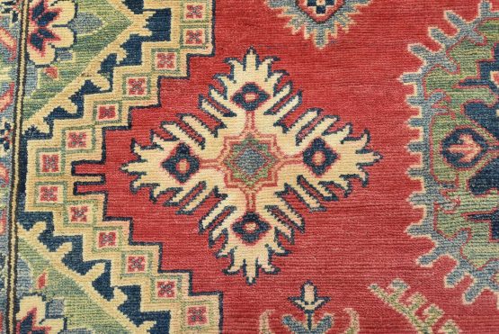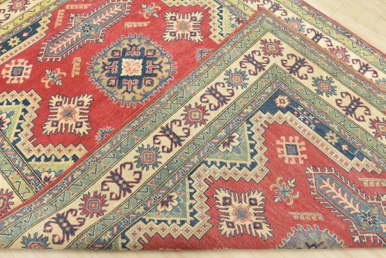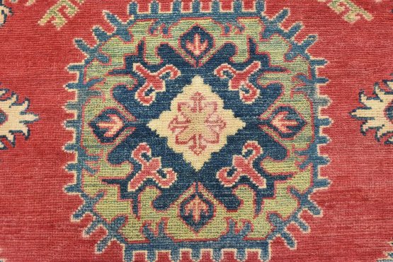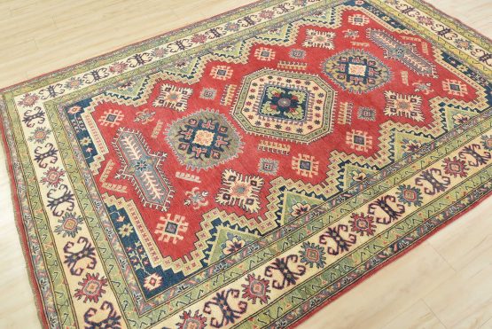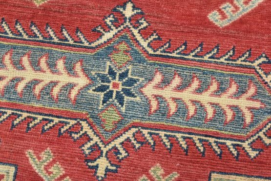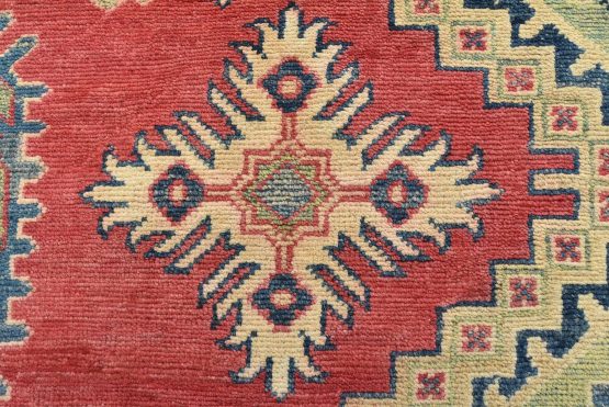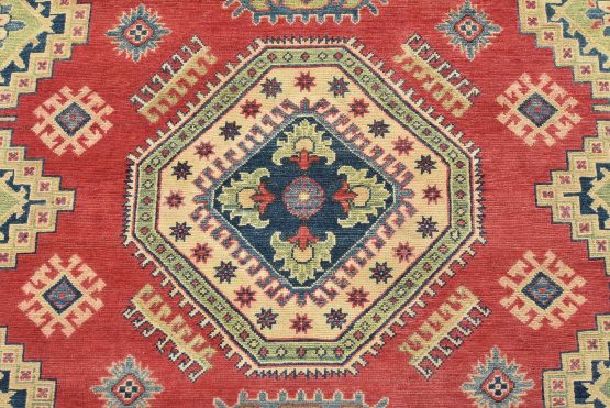 A traditional tribal Caucasian Kazak rug hand-knotted with an all-wool pile on a cotton foundation. This oriental rug features a central geometric medallion surrounded by geometric motifs set against a red background. It is new and in excellent condition.