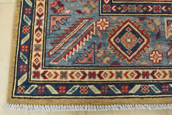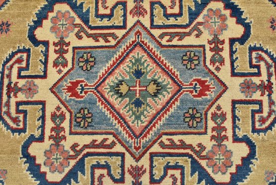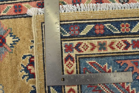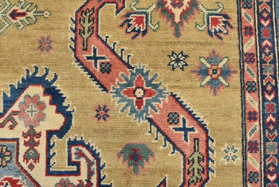 A traditional tribal Caucasian Kazak rug hand-knotted with an all-wool pile on a cotton foundation. This oriental rug features geometric medallions surrounded by geometric motifs set against a gold background. It is new and in excellent condition.