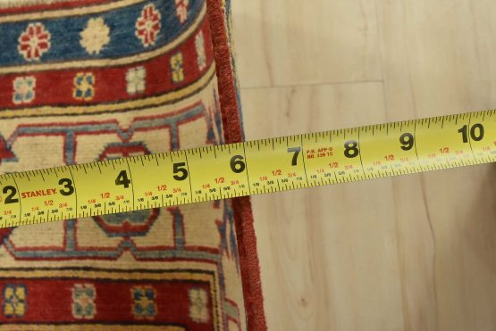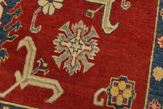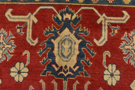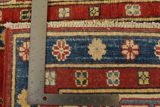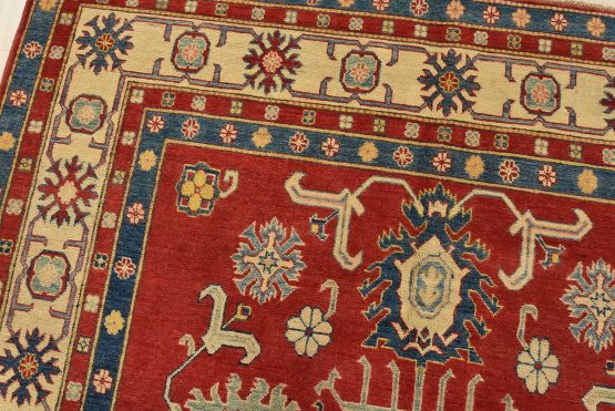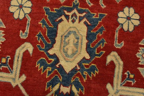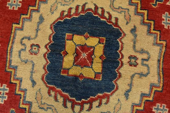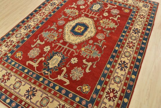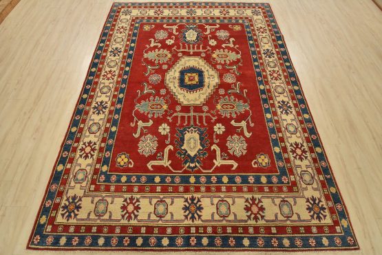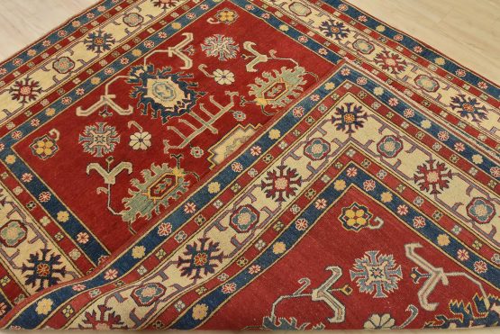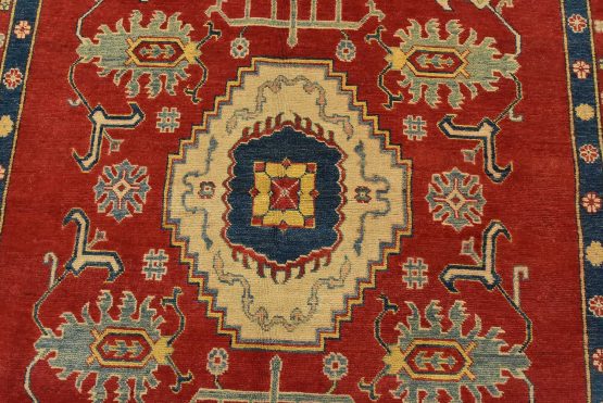 A traditional tribal Caucasian Kazak rug hand-knotted with an all-wool pile on a cotton foundation. This oriental rug features a central geometric medallion surrounded by geometric botanical motifs set against a red background. It is new and in excellent condition.