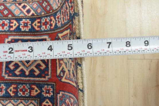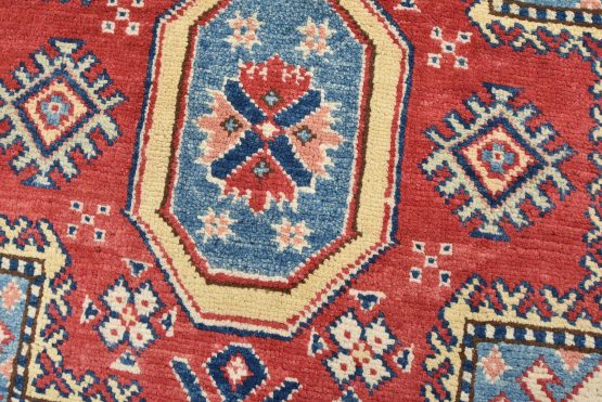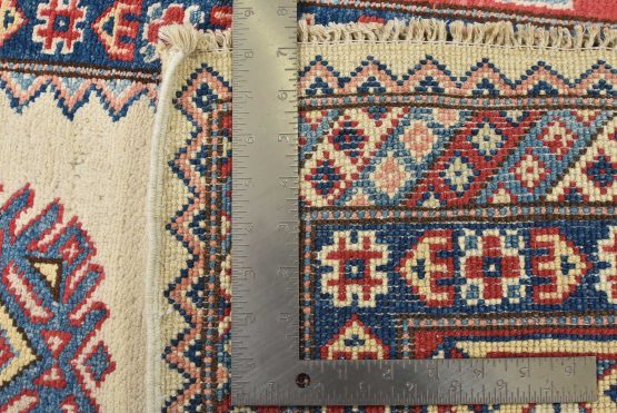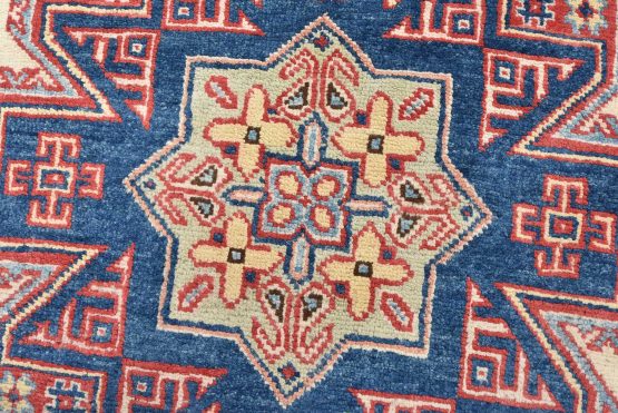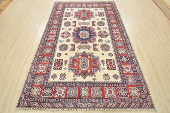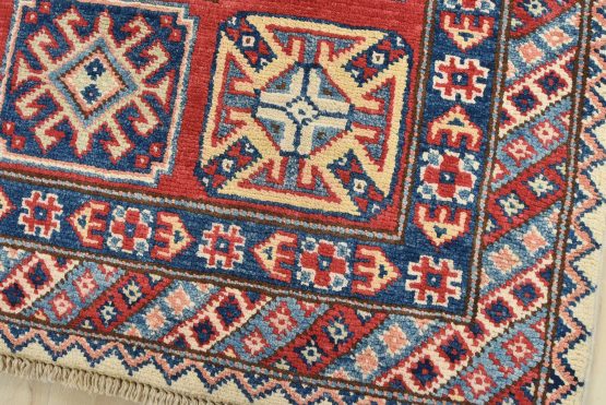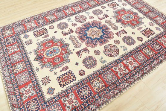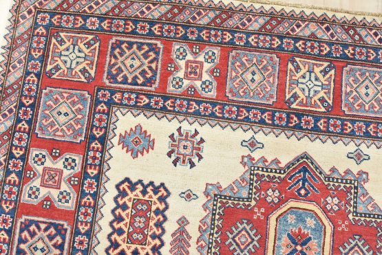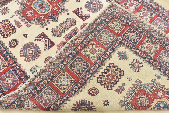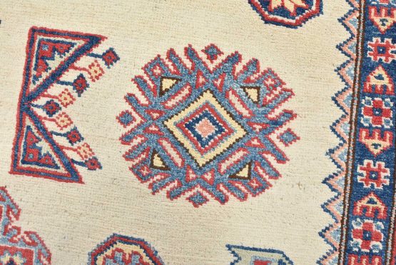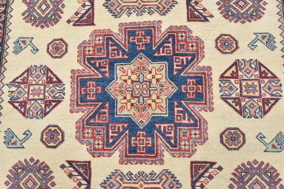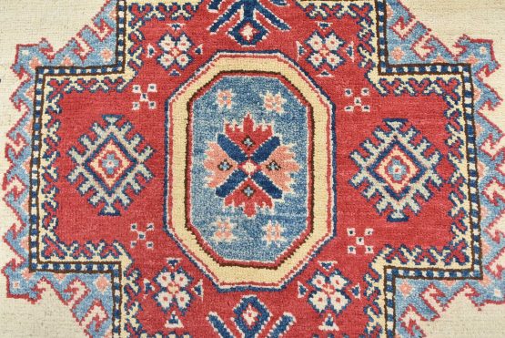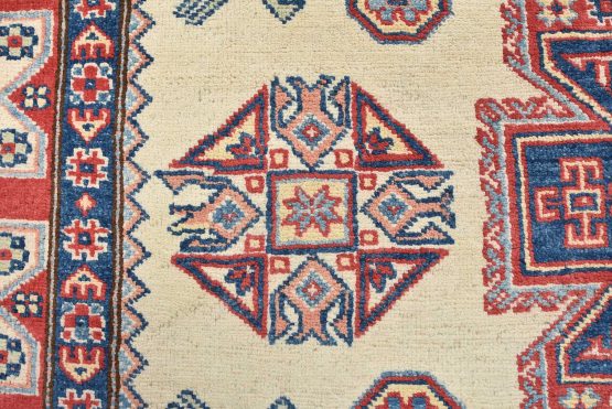 A tribal Caucasian Kazak rug hand-knotted with an all-wool pile on a cotton foundation. This oriental rug features geometric medallions surrounded by geometric motifs set against a beige background. It is new and in excellent condition.