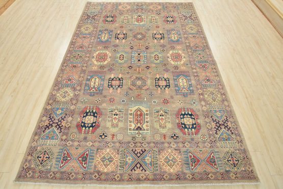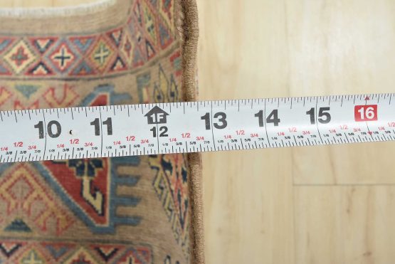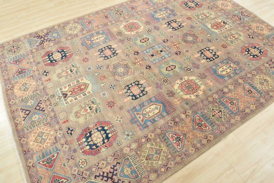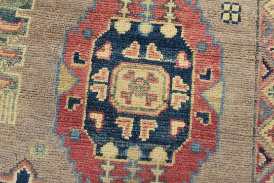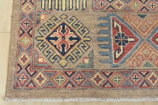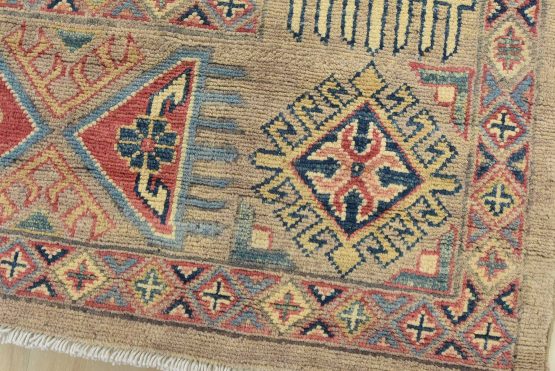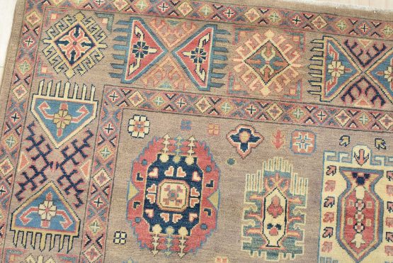 A tribal Caucasian Kazak rug hand-knotted with an all-wool pile on a cotton foundation. This oriental rug features rows of geometric motifs set against a brown background. It is new and in excellent condition.