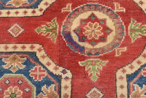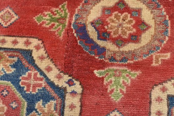 A traditional Caucasian Kazak rug hand-knotted with an all-wool pile on a cotton foundation. This oriental rug features rows of geometric medallions and botanical motifs set against a red background. It has been professionally repaired, and the dyes have bled slightly; please refer to the photos. Otherwise, the rug is in very good condition.