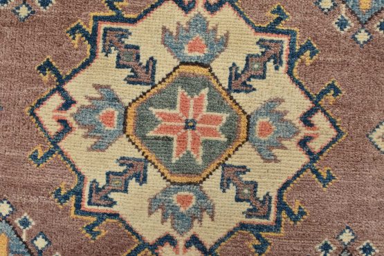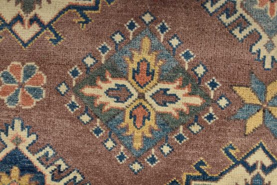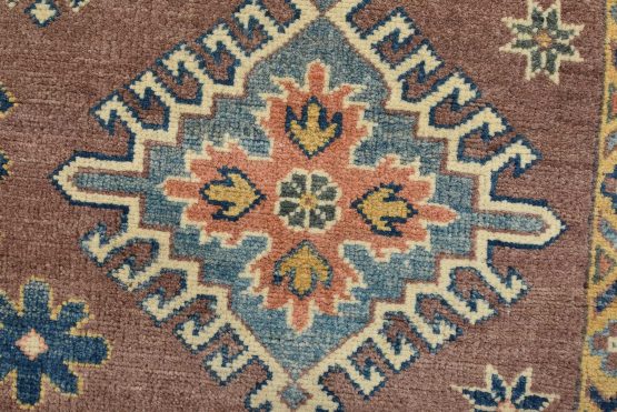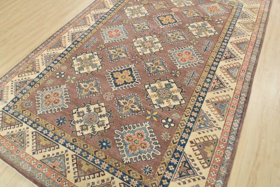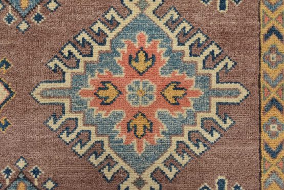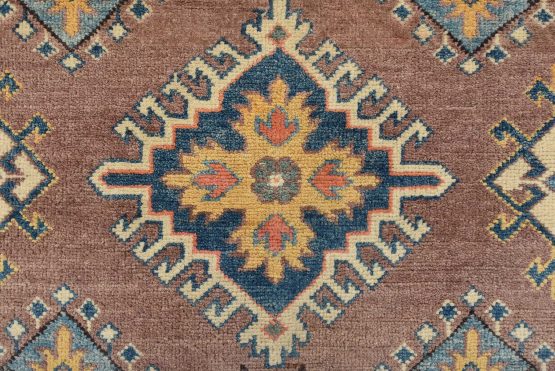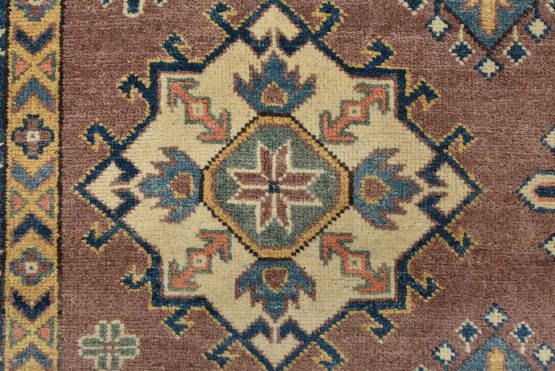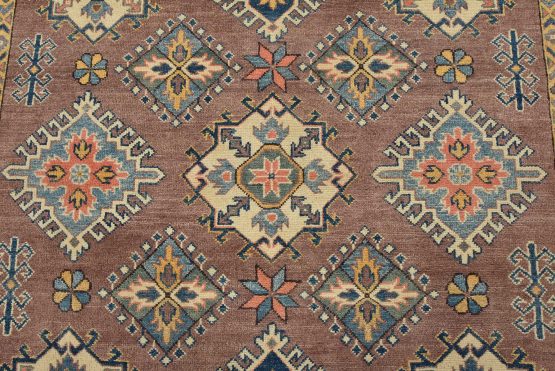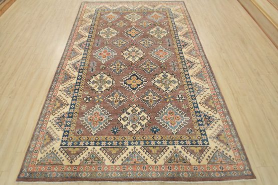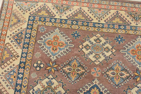 A tribal Caucasian Kazak rug hand-knotted with an all-wool pile on a cotton foundation. This oriental rug features rows or medallions set against a brown background. It is new and in excellent condition.